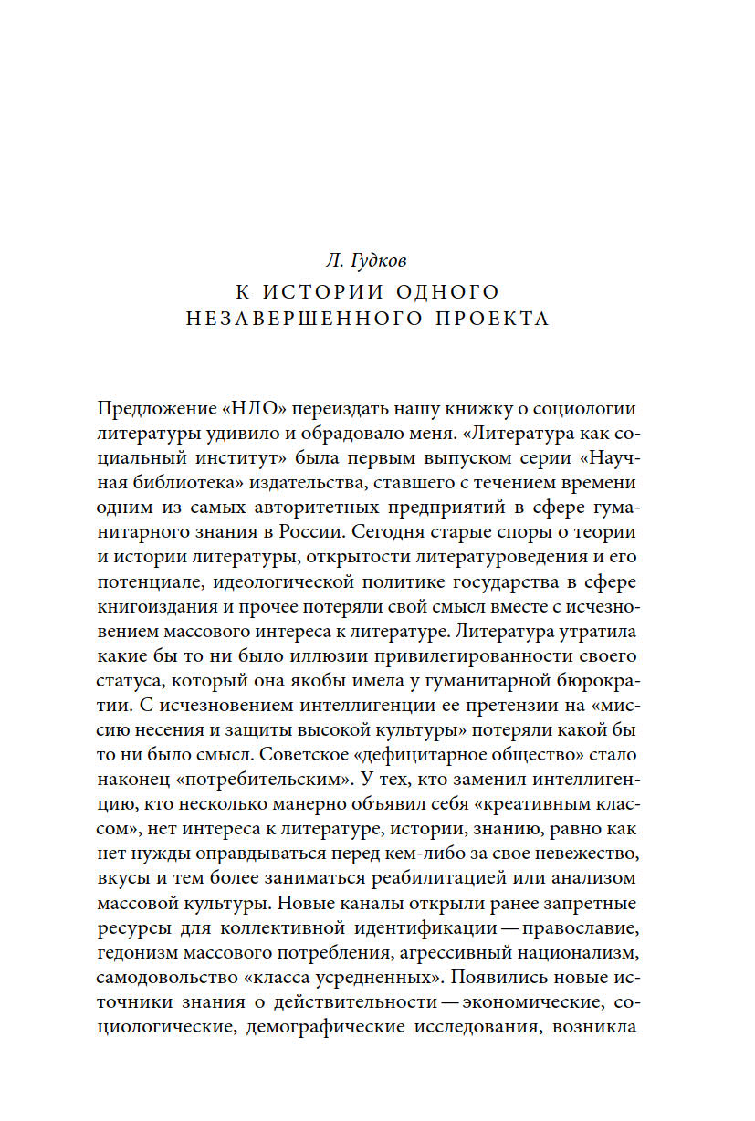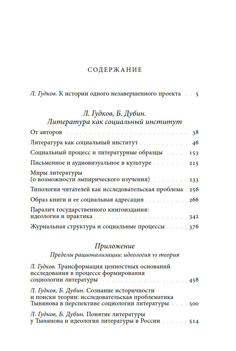 «Литература как социальный институт» — почти ровесница независимой гуманитарной науки в России и одна из первых книг издательства «НЛО». На протяжении многих лет ее авторы, социологи Лев Гудков и Борис Дубин (1946–2014), стремились выработать новые подходы, позволяющие охватить институт литературы в целом, объяснить, как люди выстраивают свой круг чтения и с какими социальными процессами связан их выбор. В своем новаторском и по-прежнему актуальном исследовании ученые продолжили исследование проблемной карты социологии литературы, вводя эту дисциплину в научный контекст России середины 1990 х годов. Читатель книги познакомится с историей понятий «литература» и «роман», со становлением художественной литературы как института и вычленением в ее рамках классики, авангарда и массовой литературы, находящихся в отношениях взаимного отталкивания и взаимовлияния. Авторы прослеживают сложные и нередко конфликтные взаимосвязи между писателями, издателями, книгопродавцами, литературными критиками, читателями и педагогами, анализируют роль журналов в литературном процессе, изучают влияние образа книги на читательскую аудиторию. Новое издание дополнено рядом близких по проблематике статей авторов и предисловием Л. Гудкова с размышлениями о значимости этого проекта.