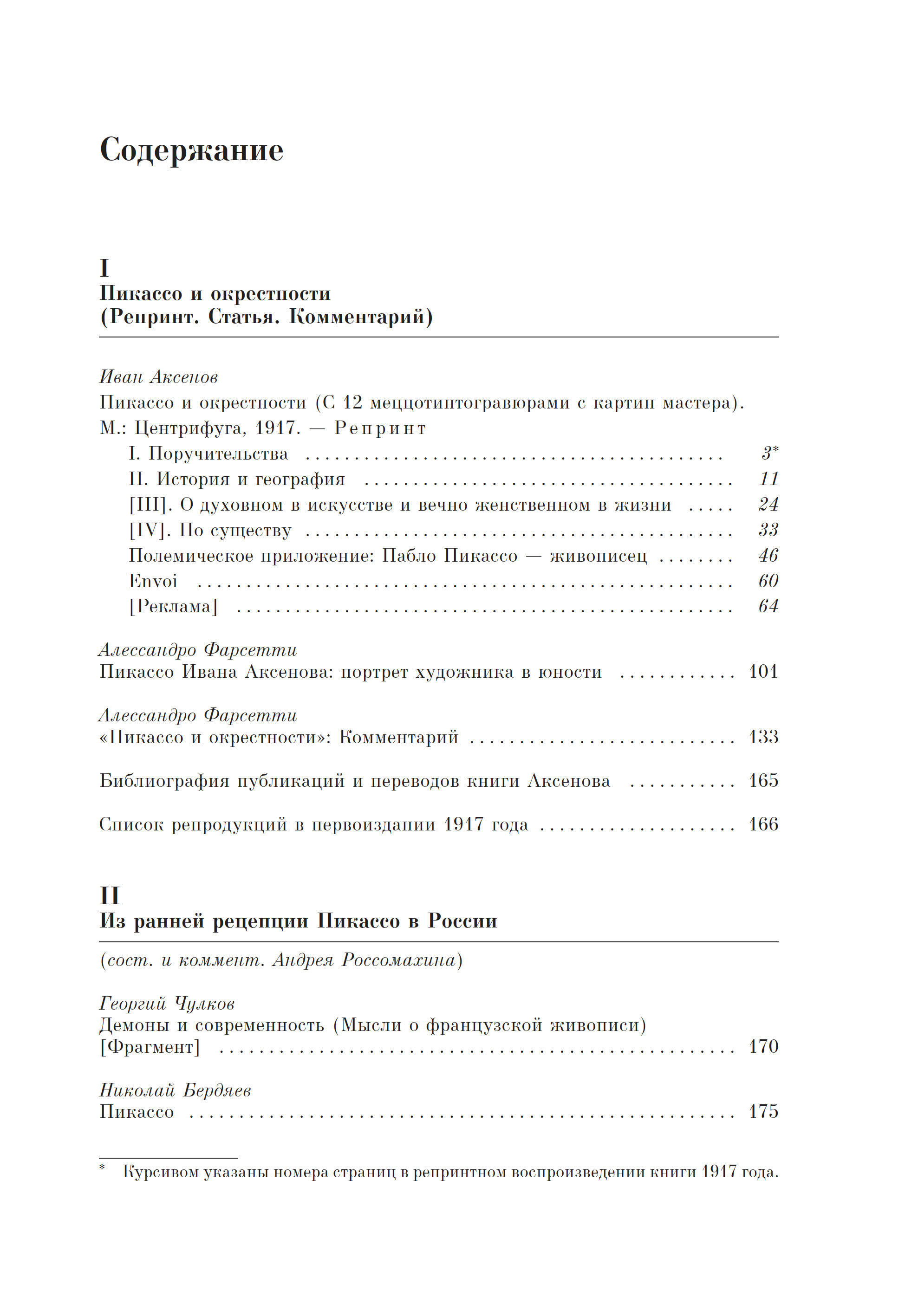 Книга «Пикассо и окрестности» Ивана Аксенова вышла в свет в футуристическом издательстве «Центрифуга» в 1917 году. Она стала первой в мире монографией о художнике, впоследствии признанном одной из ключевых фигур искусства XX века. В революционный год слома эпох и эсхатологических потрясений книга осталась практически незамеченной. Но уже в наши дни она была заново открыта и высоко оценена. Это необычное произведение — как по афористичному провокативно-эпатажному тону, так и по своей структуре: Аксенов пишет не только о Пикассо, но и об эстетике и социологии искусства; автор предпочитает эффектные утверждения и аллюзии исчерпывающим объяснениям. В книге множество скрытой полемики, в ходе которой превозносятся самые крайние эксперименты Пикассо и доказывается, что его художественные решения вовсе не укладываются в рамки кубизма. Автор книги Иван Александрович Аксенов (1884–1935) — одна из ярких фигур русского авангарда: поэт, критик, искусствовед, участник группы «Центрифуга», соратник Мейерхольда и Эйзенштейна, переводчик и шекспировед. Книга «Пикассо и окрестности» написана по следам личного общения с художником в Париже весной 1914 года. Это не только первое серьезное изучение живописи Пикассо, но и важный образец литературы, рефлексирующей об искусстве. Читатель впервые получает возможность познакомиться с авангардистским памятником 1917 года, в точности воспроизведенным и снабженным обширным комментарием, исследованием и иллюстративным рядом.
