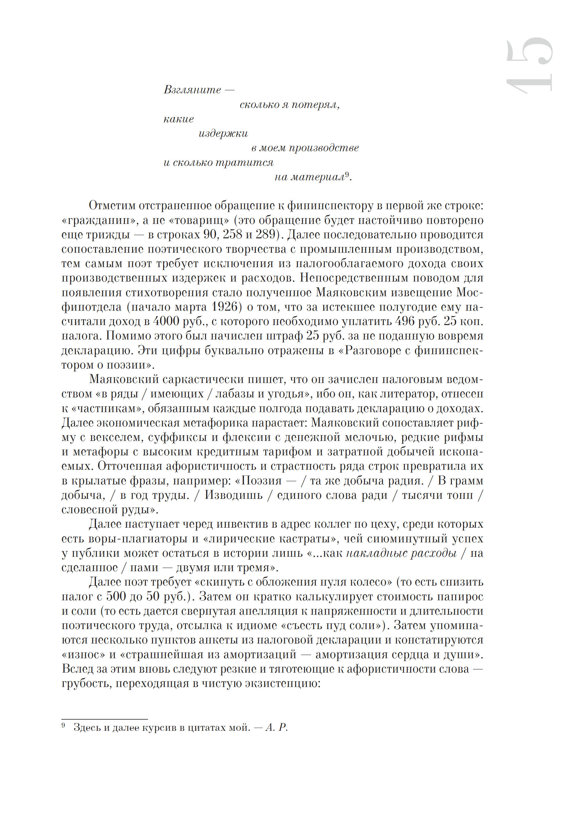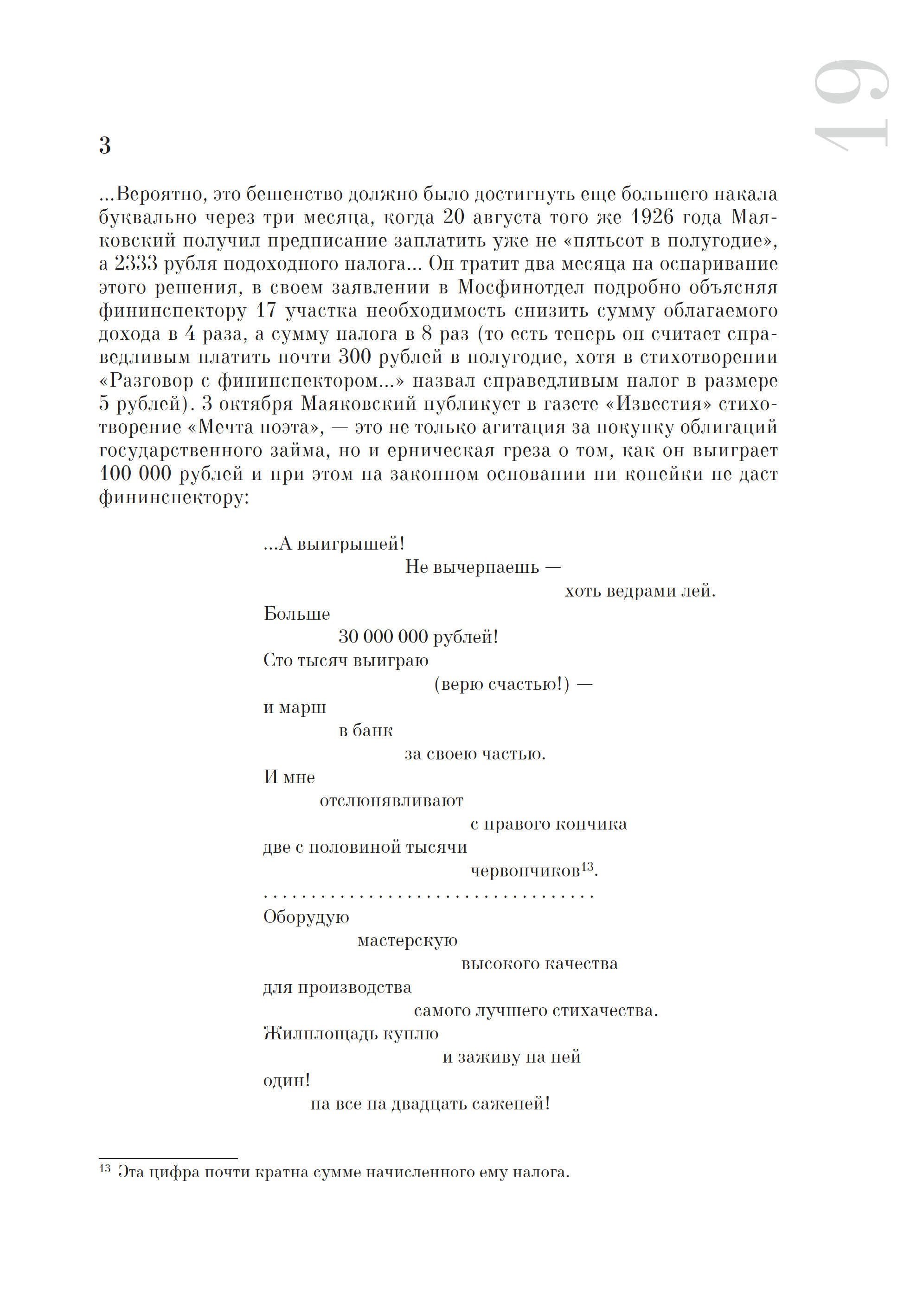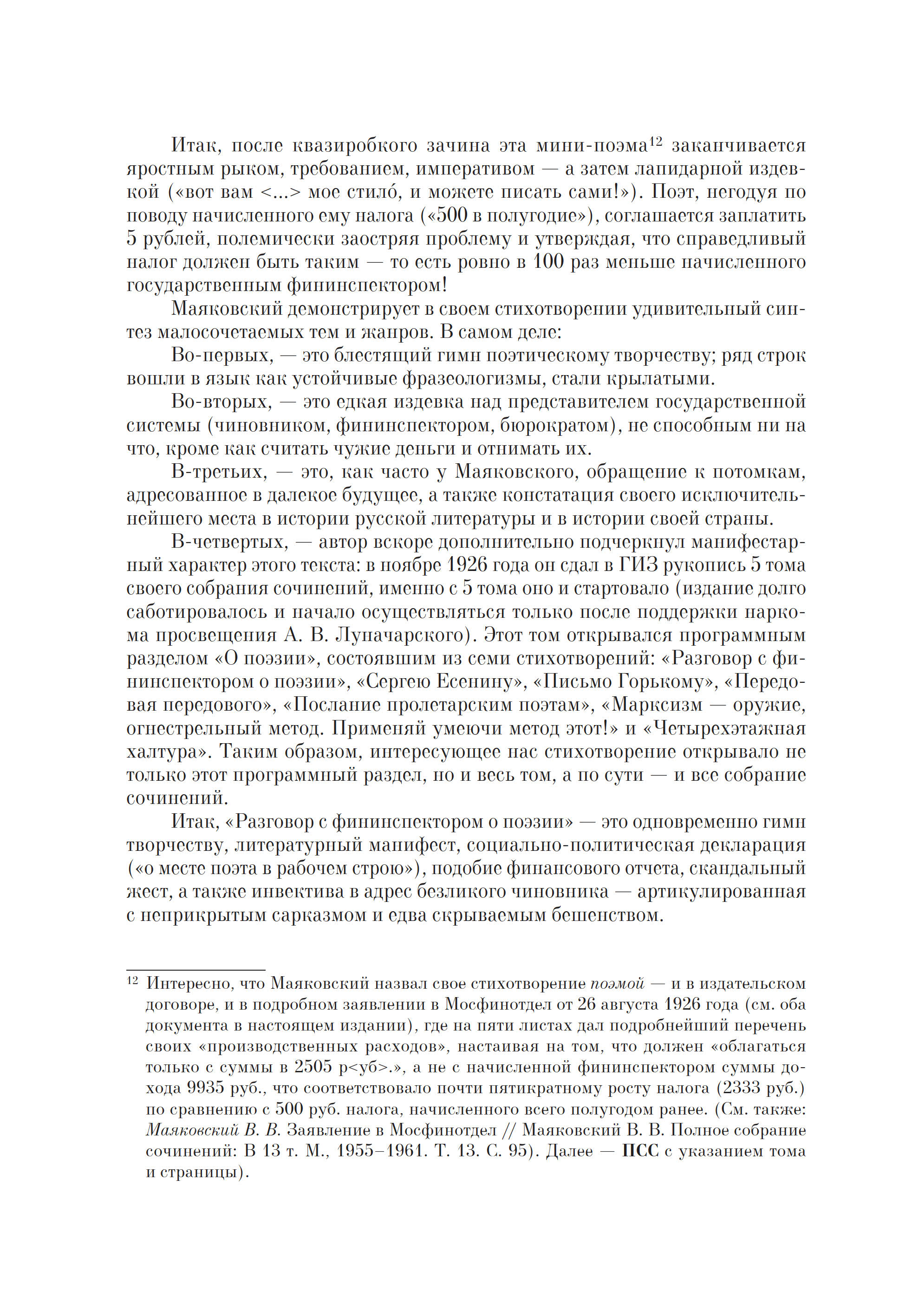 В настоящем издании эпатажный манифест Маяковского впервые подробно комментируется и воспроизводится факсимильно; детально проанализированы перипетии борьбы поэта с финансовым ведомством, публикуются уникальные финансовые документы из фондов Государственного музея В. В. Маяковского (включая налоговые декларации и неизвестные письма-заявления поэта), а также собраны карикатуры и пародии на Маяковского, связанные с темой гонораров.
