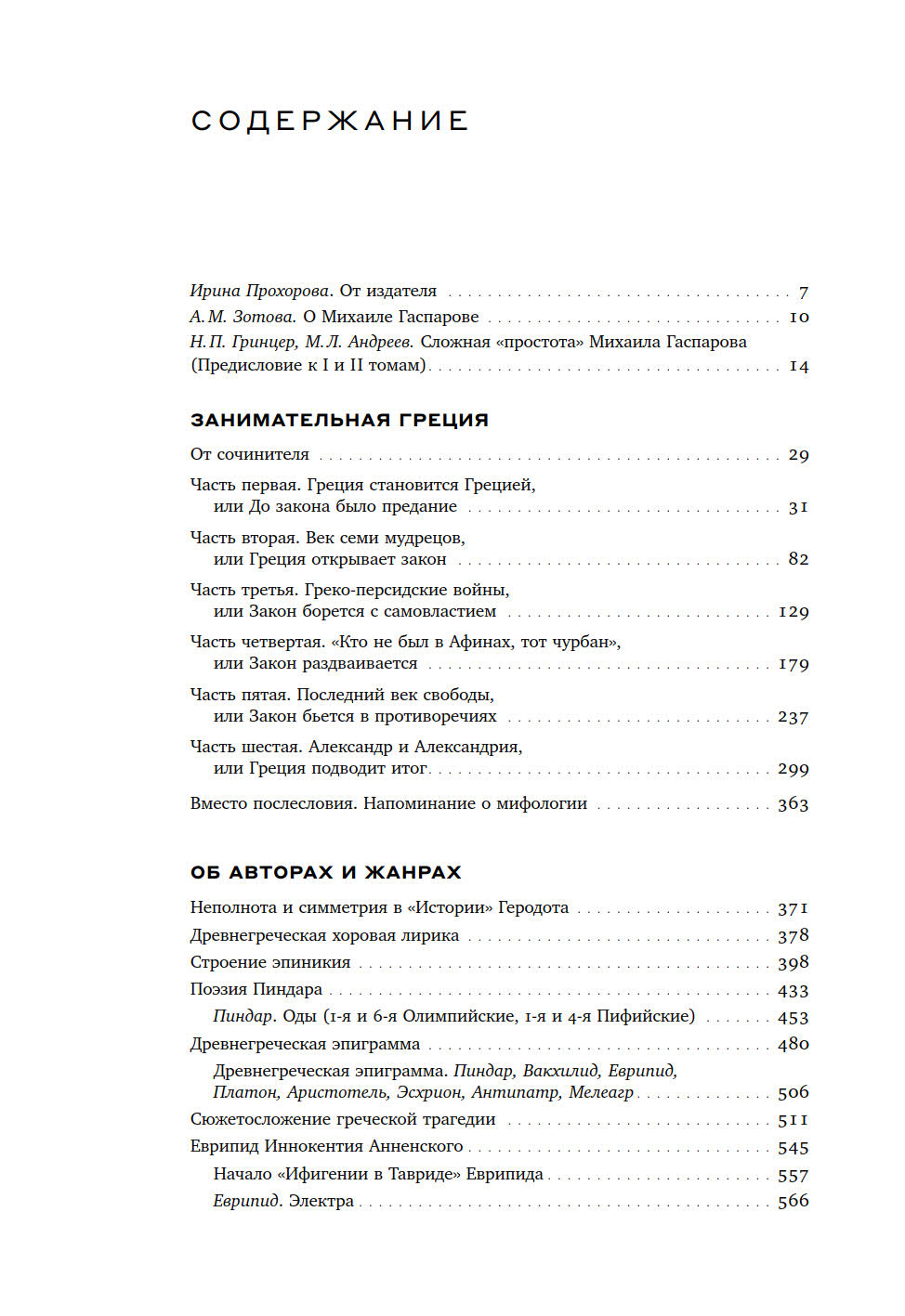 В первый том включены работы Гаспарова по антиковедению, главным образом посвященные Древней Греции. Наряду с аналитическими статьями, составляющими основное содержание тома и объединенными в тематические группы по жанровому и хронологическому принципу, в издание входят предисловия и сопроводительные статьи к переводам древнегреческих памятников. В них предельно сжато и ярко характеризуется как творчество отдельных поэтов, например, Пиндара, так и художественная специфика целого жанра — эпиграммы или басни. Эти статьи неотделимы от собственно переводов, фрагменты которых включены в каждый тематический раздел, поскольку в понимании Гаспарова перевод — едва ли не главная форма осмысления античного наследия. Главная в том числе и потому, что своей важнейшей задачей он считал приблизить к пониманию античности максимально широкую аудиторию. Потому этот том открывается «Занимательной Грецией» — одновременно и самым «ненаучным», и самым популярным трудом Гаспарова, посвященным древности. В нем как нельзя лучше прослеживается идея, объединяющая все столь разнообразные работы ученого: сделать античные тексты и античных авторов не просто понятными, но и говорящими языком естественным и близким читателю современной эпохи.