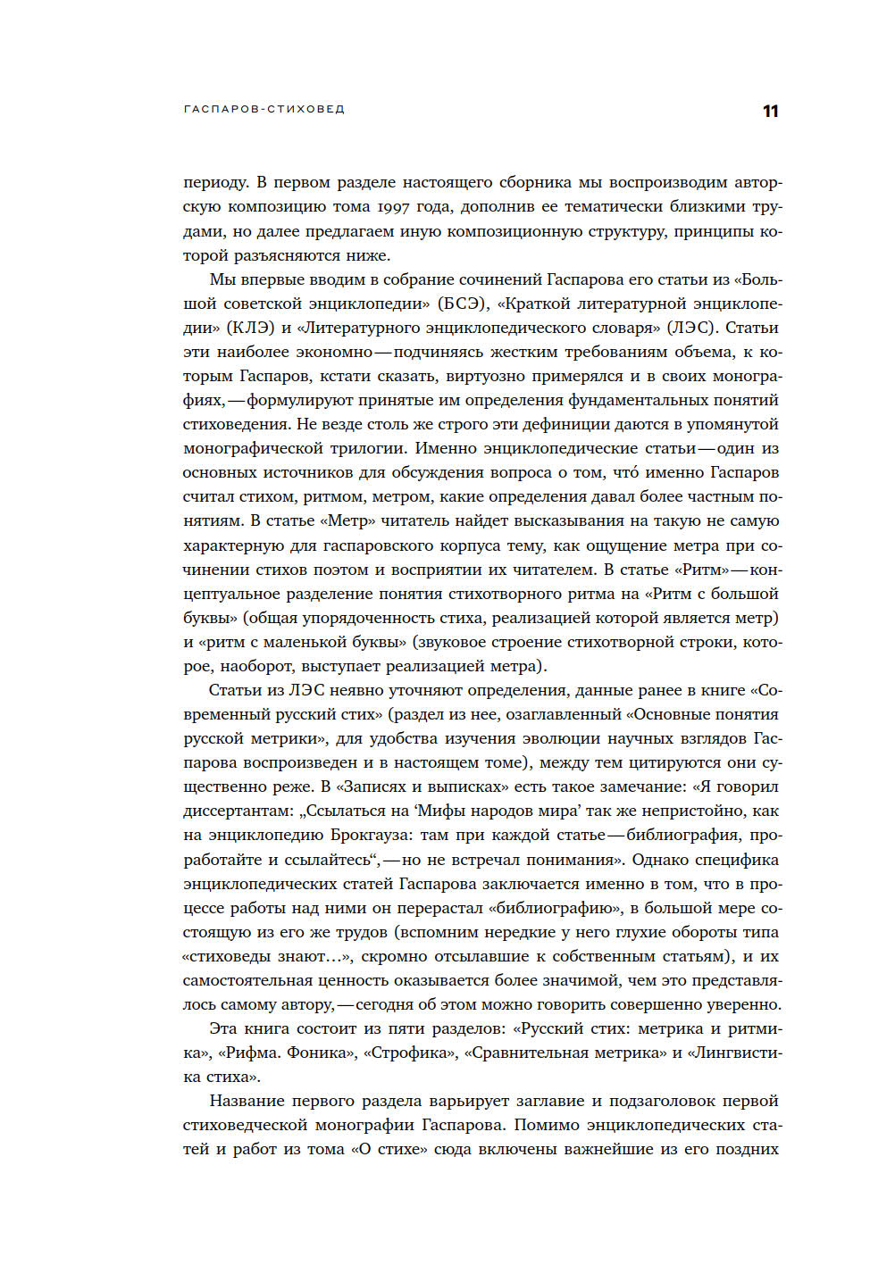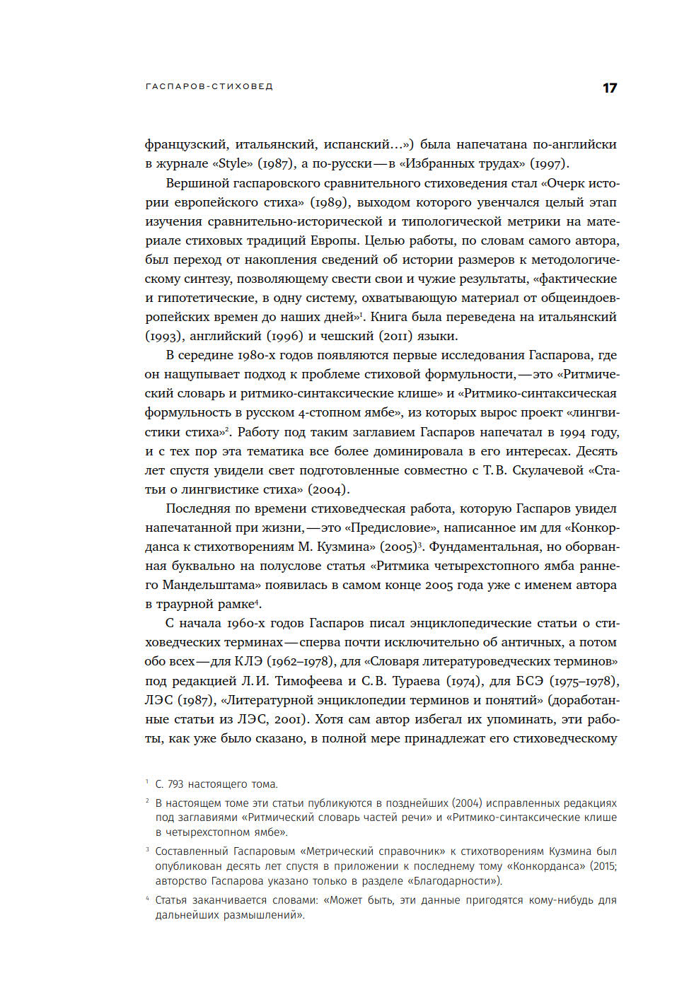 В четвертом томе собраны его главные стиховедческие работы. Этот раздел его научного наследия заслуживает особого внимания, поскольку с именем Гаспарова связана значительная часть достижений русского стиховедения второй половины XX века. Предложенный здесь выбор статей не претендует на исчерпывающую полноту, но рассчитан на максимальную репрезентативность. Помимо давно ставших классическими, в настоящий том вошли также незаслуженно малоизвестные, но не менее важные труды Гаспарова, в соседстве с которыми тексты, отобранные самим автором, приобретают новое качество. Эти работы извлечены из малотиражных изданий и до сих пор были труднодоступны для большинства читателей. Также здесь представлены его энциклопедические статьи, где четко и сжато сформулированы принятые им определения фундаментальных понятий стиховедения. Труды Гаспарова по стиховедению остаются в числе важнейших настольных справочников у всех специалистов по истории и теории стиха.