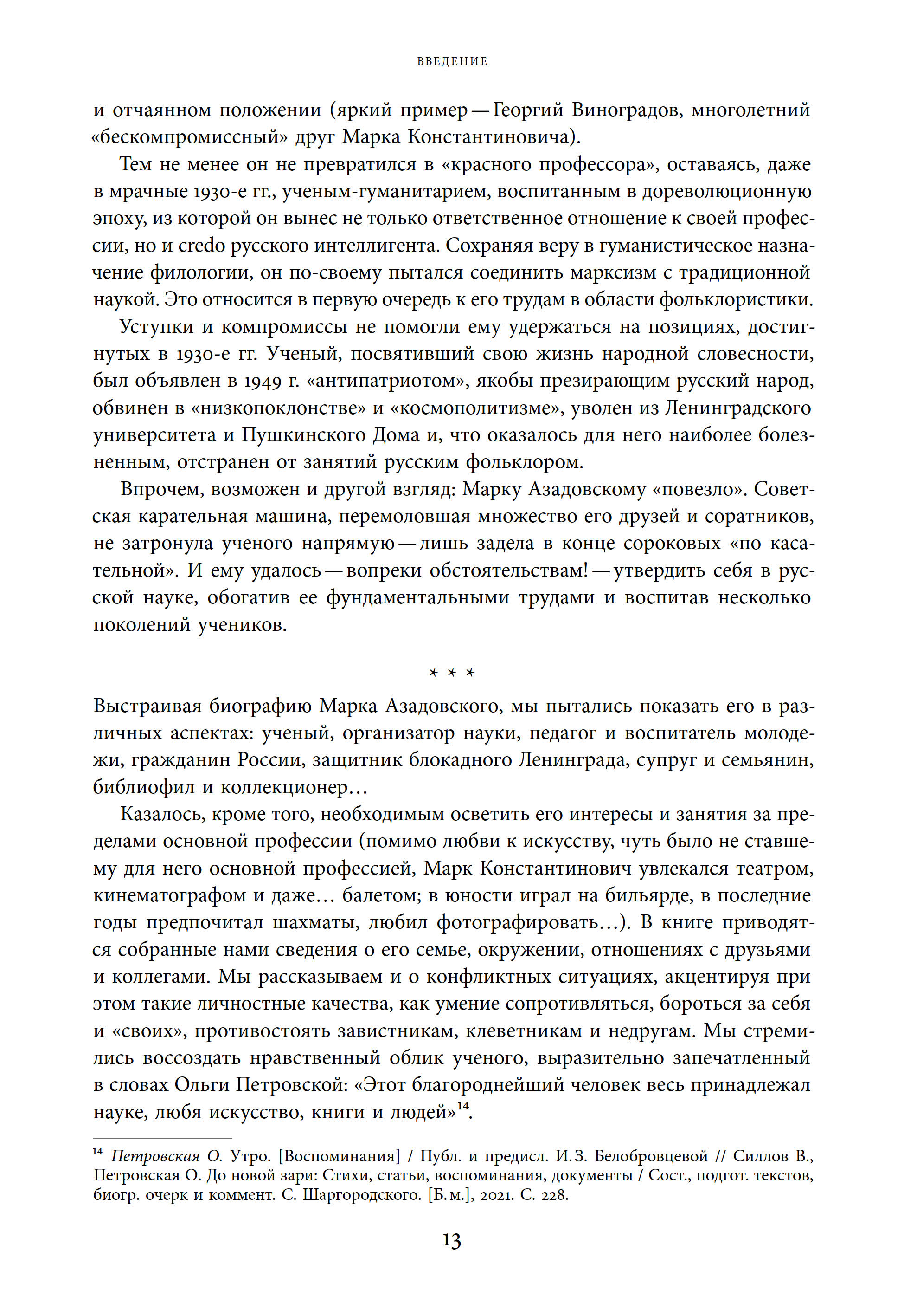 Отдельные главы посвящены драматическим событиям эпохи позднего сталинизма: проработкам на собраниях и травле в печати, увольнению из Ленинградского университета и Пушкинского Дома, отстранению от занятий русским фольклором и упорной борьбе учёного за восстановление своего доброго имени.