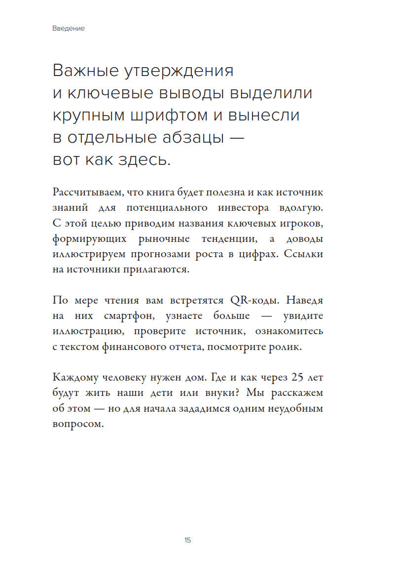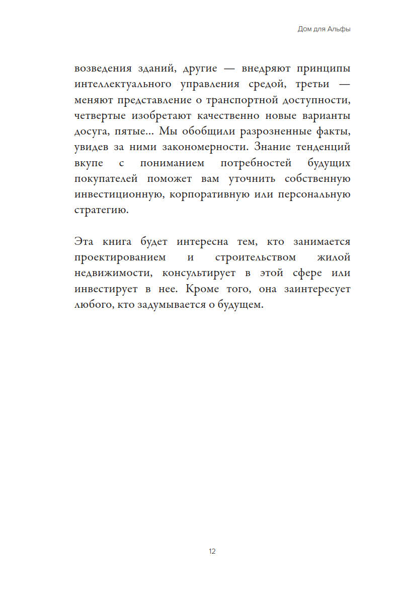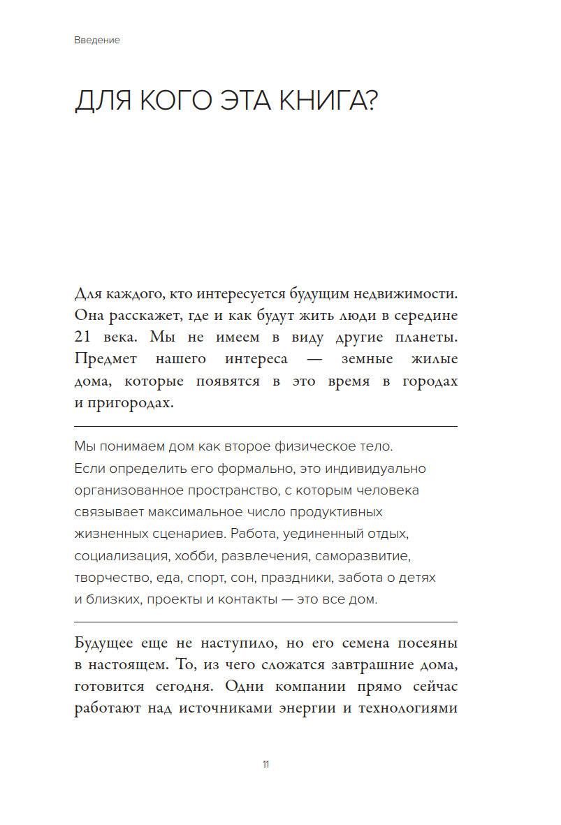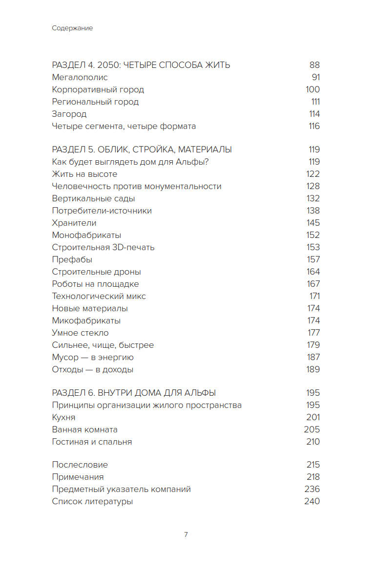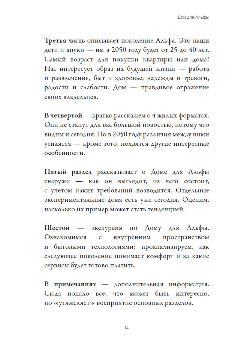 Книга рассказывает о типологии жилых пространств, тенденциях в урбанистике и перспективных технологиях проектирования и строительства в 2050 году времени так называемой «технологической сингулярности». Особое внимание авторы уделяют анализу портрета поколения «альфа», представители которого в середине 21 века станут наиболее многочисленной и экономически активной частью общества.