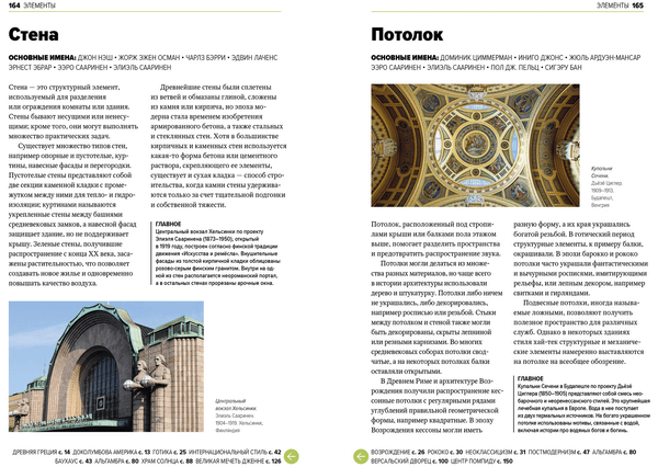 Перекрестные ссылки внизу каждой страницы помогают увидеть историю развития архитектуры и связать представленную информацию с другими разделами, а во врезках рассказывается о главных достижениях или фактах из биографии архитекторов.