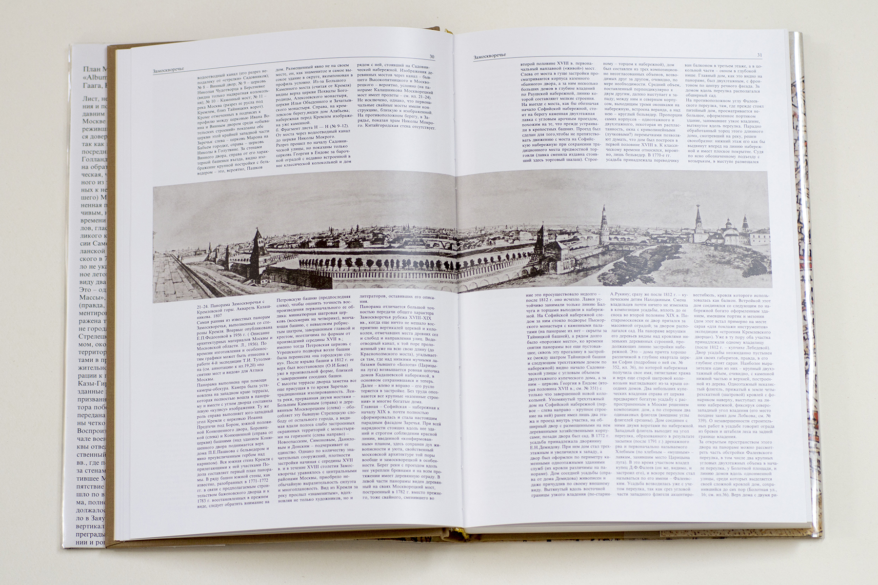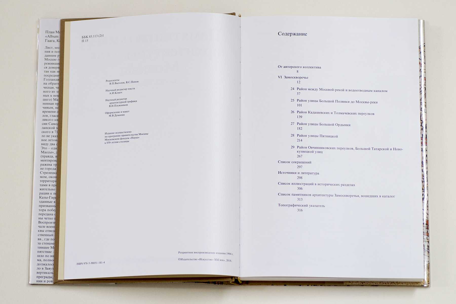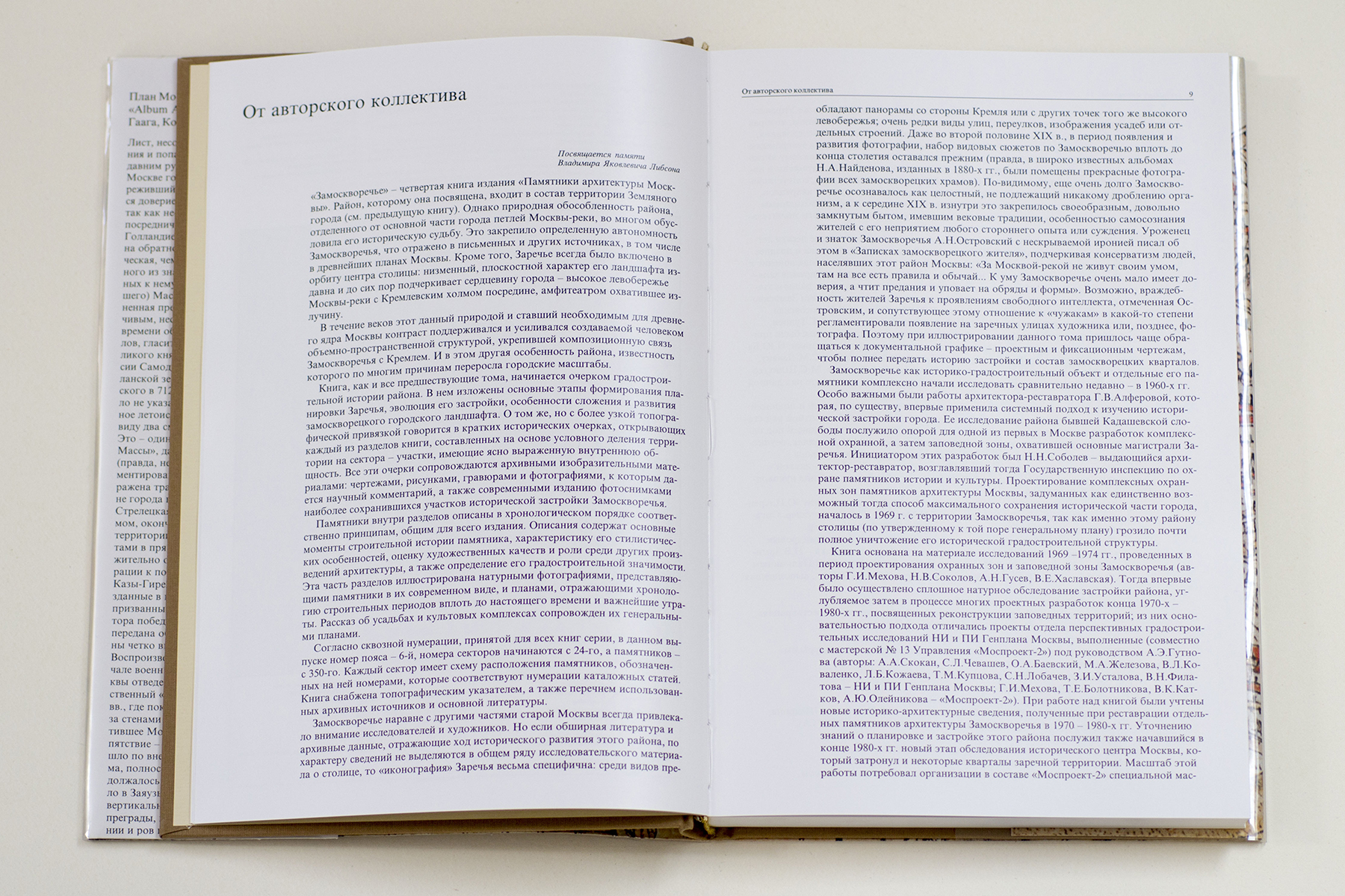 «Замоскворечье» — четвертая книга издания «Памятники архитектуры Москвы». Район, которому она посвящена, входит в состав территории Земляного города. Однако природная обособленность района, отделенного от основной части города петлей Москвы-реки, во многом обусловила его историческую судьбу. Это закрепило определенную автономность Замоскворечья, что отражено в письменных и других источниках, в том числе в древнейших планах Москвы. Кроме того, Заречье всегда было включено в орбиту центра столицы: низменный, плоскостной характер его ландшафта издавна и до сих пор подчеркивает сердцевину города — высокое левобережье Москвы-реки с Кремлевским холмом посредине, амфитеатром охватившее излучину.