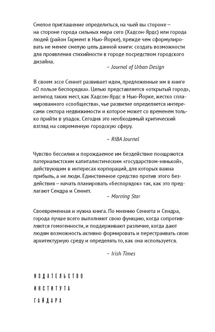 В 1970 году Ричард Сеннет опубликовал новаторскую книгу «О пользе беспорядка», в которой утверждал, что идеал хорошо спланированного и упорядоченного города имеет свои недостатки. Пятьдесят лет спустя Сеннет возвращается к этим все еще плодотворным идеям и вместе с активистом и архитектором Пабло Сендра разрабатывает повестку для дизайна и этики «Открытого города». В этой смелой книге Сендра и Сеннет предлагают пересмотреть, как мы осмысляем наши города и планируем в них общественную жизнь. Они соединяют архитектуру, политику, городское планирование и активизм с тем, чтобы развивать места, которые будут питать, а не подавлять, объединять, а не разделять, оставаться открытыми для перемен, а не закрываться от них.