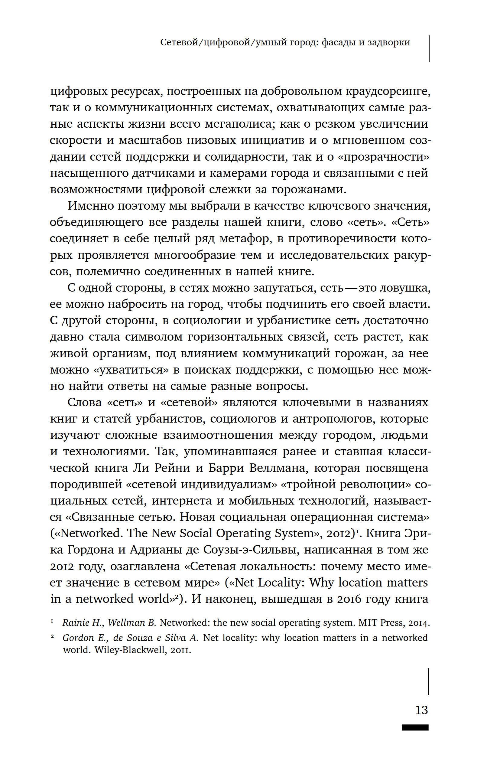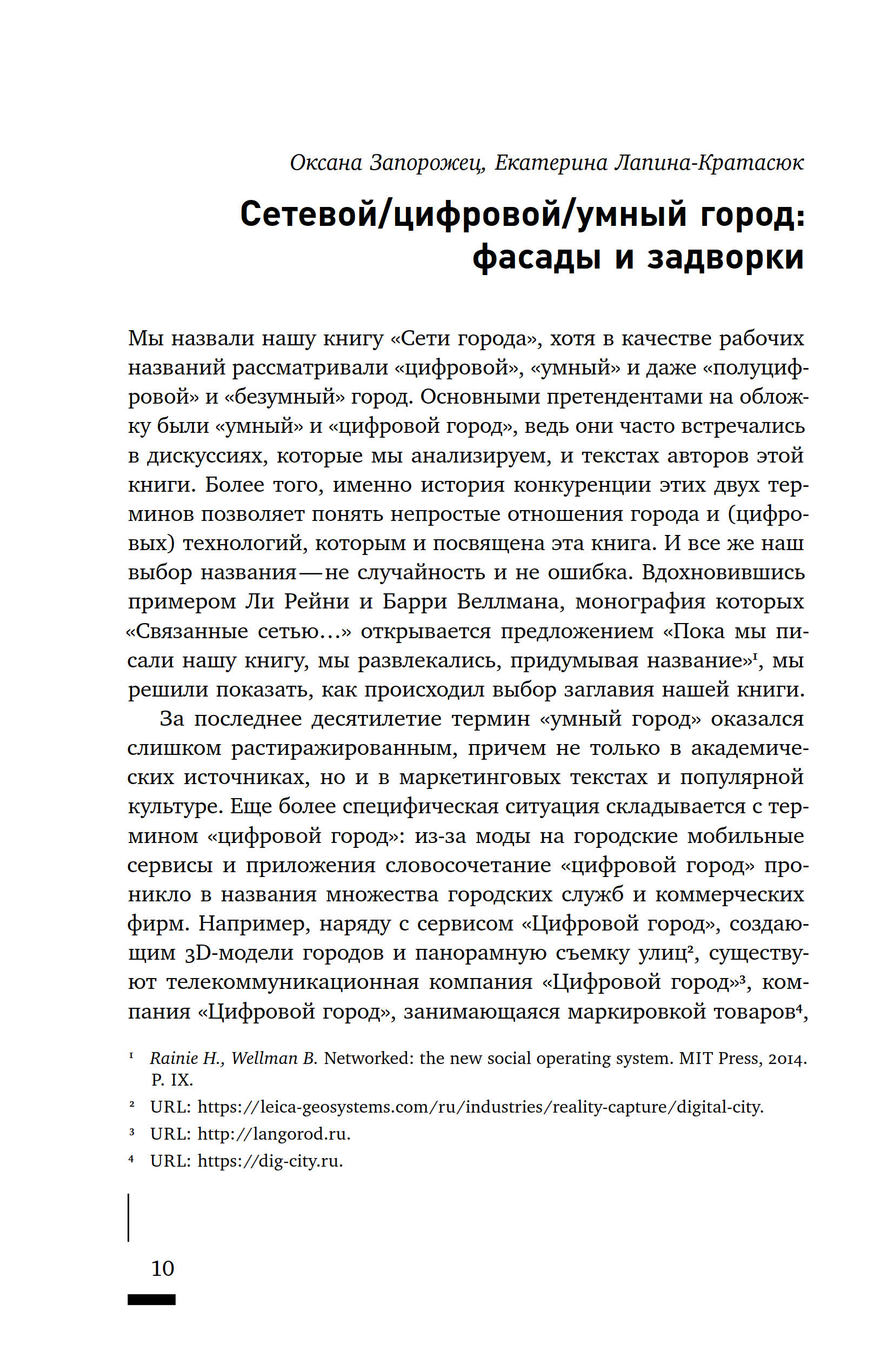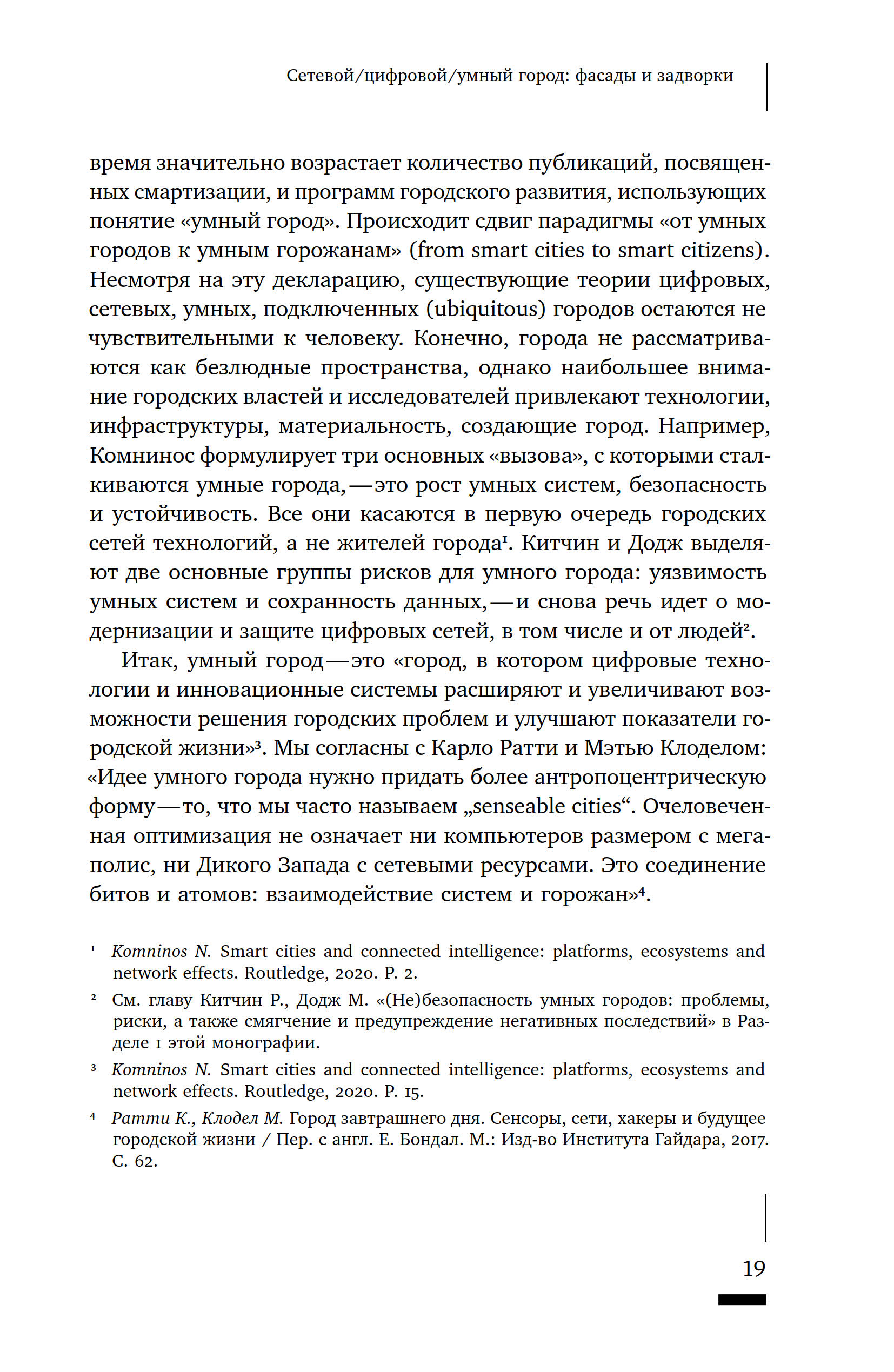 Сегодня мало кто сомневается, что современный город создается и изменяется во многом благодаря цифровым технологиям. Однако до сих пор не существует согласия относительно роли горожан в интенсивно технологизирующейся среде. Их рассматривают и как пассивных генераторов данных, и как послушных пользователей технологий. Но нельзя игнорировать факт, что горожане сегодня активно включаются в переопределение цифровых инструментов, что они не только осваивают преимущества сетей, но и обнаруживают их уязвимости, начинают все более сложным и непредсказуемым образом влиять на технологии и управление городами. Активность горожан ставит под сомнение концепцию умного города как города технологий, уже несколько десятилетий развивающуюся под патронажем IT-гигантов. Авторы этой монографии — социологи, урбанисты, исследователи медиа и данных — задают новые тренды и переходят от темы «умных городов» к «умным горожанам», от «цифрового оптимизма» к «цифровому реализму», от техноцентризма к цифровой антропологии. Рассматривая город с позиции человека, авторы обсуждают возможности и уязвимости развития сетевых / цифровых / умных городов, участия горожан в управлении городом, его ресурсами и экологией, особенности формирования сетевых сообществ — соседских, городских и глобальных, а также множество других не всегда очевидных аспектов повседневной жизни — мобильность и навигацию, городские игры, понимание и представление города.
