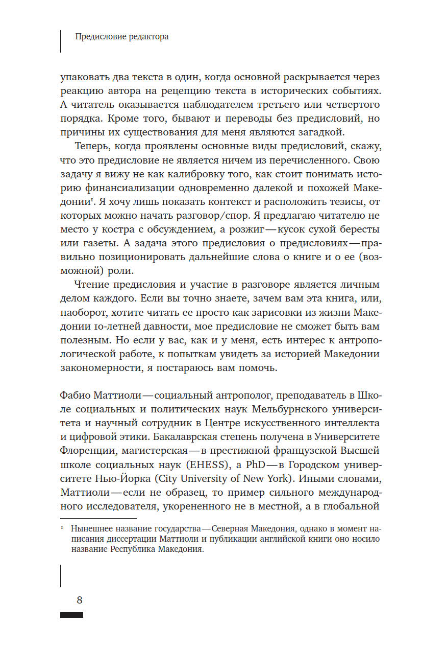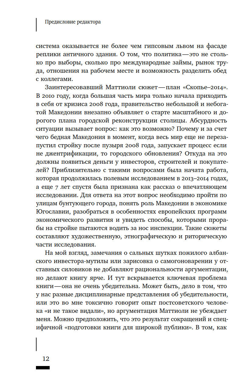 В 2010 году, когда большая часть мира еще не оправилась от кризиса 2008 года, правительство небогатой Македонии неожиданно объявило о запуске масштабного и дорогого проекта по реконструкции столицы — «Скопье–2014». Как урбанистическая среда превратилась в волшебное устройство для отмывания денег? Какими способами люди пытались вернуть себе субъектность в атмосфере финансовой неликвидности? Книга Фабио Маттиоли рассказывает истории предпринимателей-неудачников, рабочих, увязших в долгах, и честолюбивых бюрократов — и показывает, как финансовая экспансия на окраинах Европы превратила идентичности, ценности и надежды на экономическое благополучие в орудия подчинения.