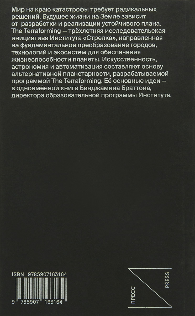 The Terraforming — трёхлетняя исследовательская инициатива Института «Стрелка», направленная на фундаментальное преобразование городов, технологий и экосистем для обеспечения жизнеспособности планеты. Искусственность, астрономия и автоматизация составляют основу альтернативной планетарности, разрабатываемой программой The Terraforming. Её основные идеи — в одноимённой книге Бенджамина Браттона, директора образовательной программы Института.