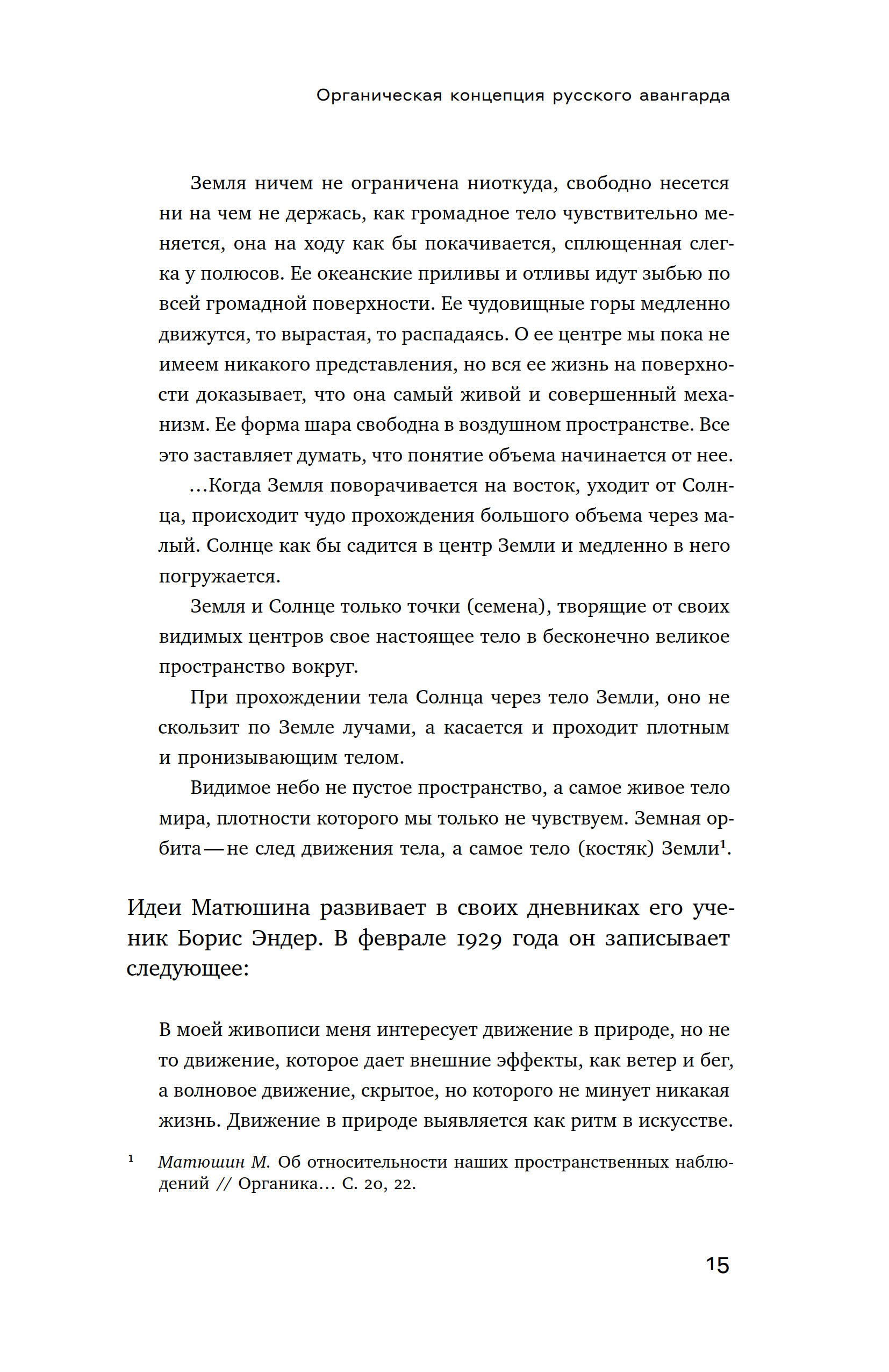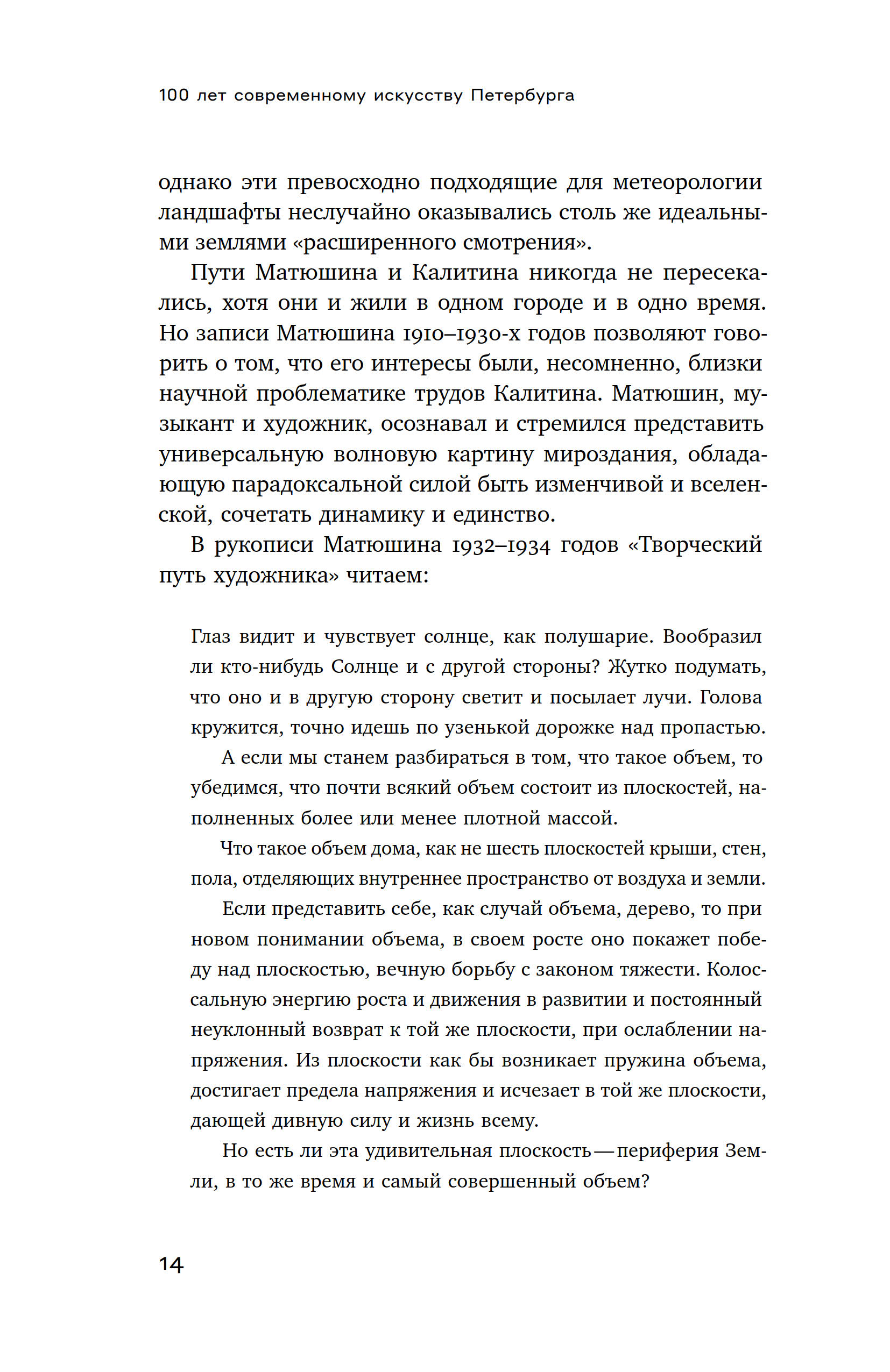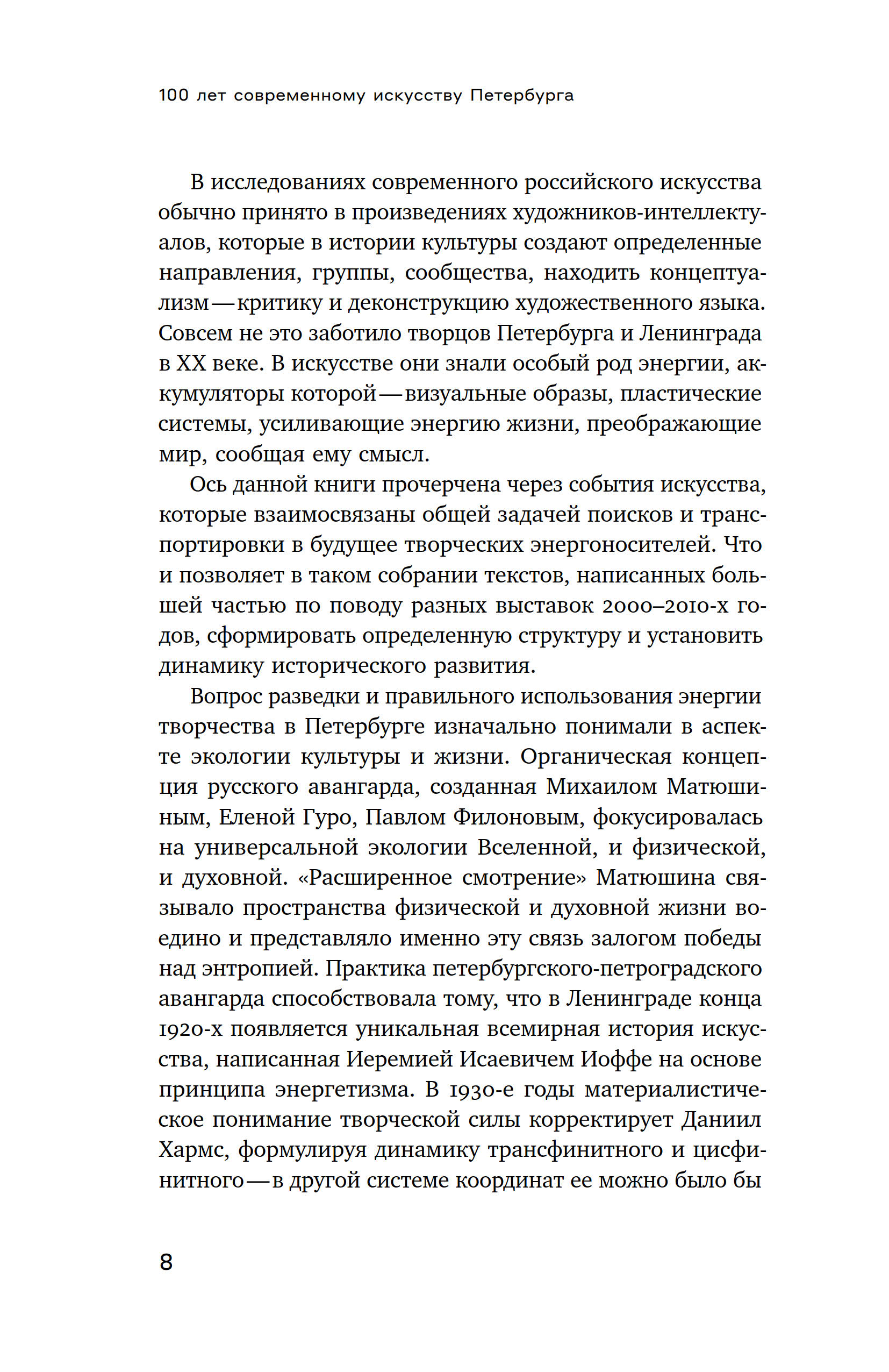 Ось книги Екатерины Андреевой прочерчена через те события искусства, которые взаимосвязаны задачей разведки и транспортировки в будущее образов, страхующих жизнь от энтропии. Она проходит через пласты авангарда 1910 х, нонконформизма 1940–1980 х, искусства новой реальности 1990–2010 х, пересекая личные истории Михаила Матюшина, Александра Арефьева, Евгения Михнова, Константина Симуна, Тимура Новикова, других художников-мыслителей, которые преображают жизнь в непрестанном «оформлении себя», в пересоздании космоса.