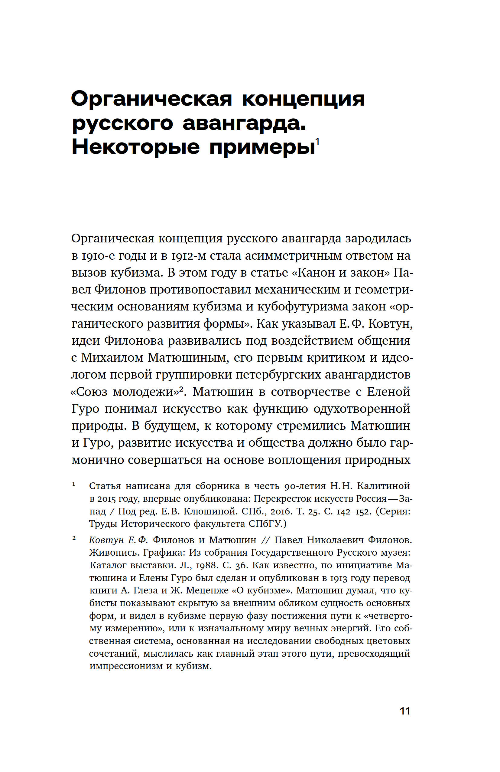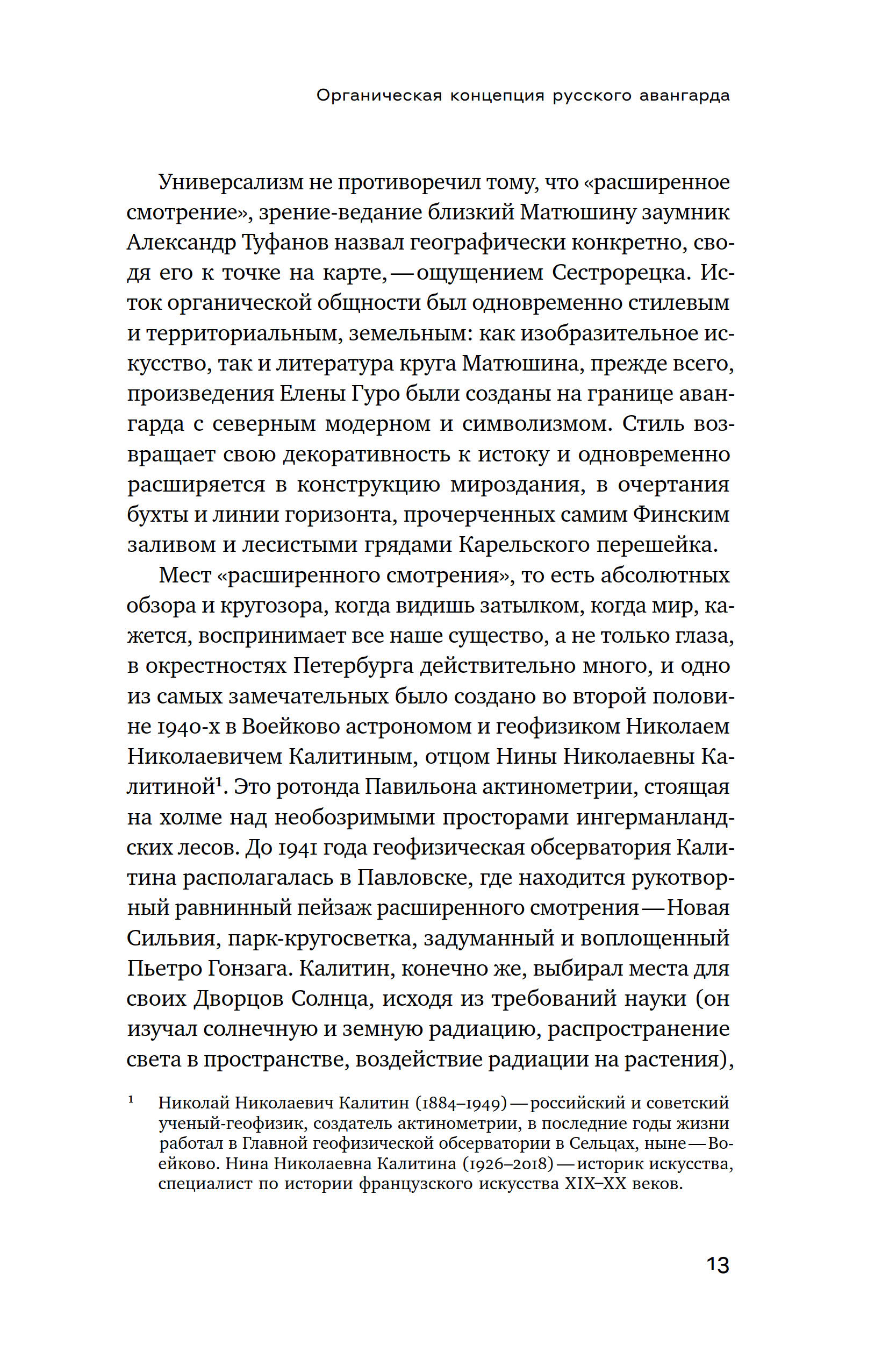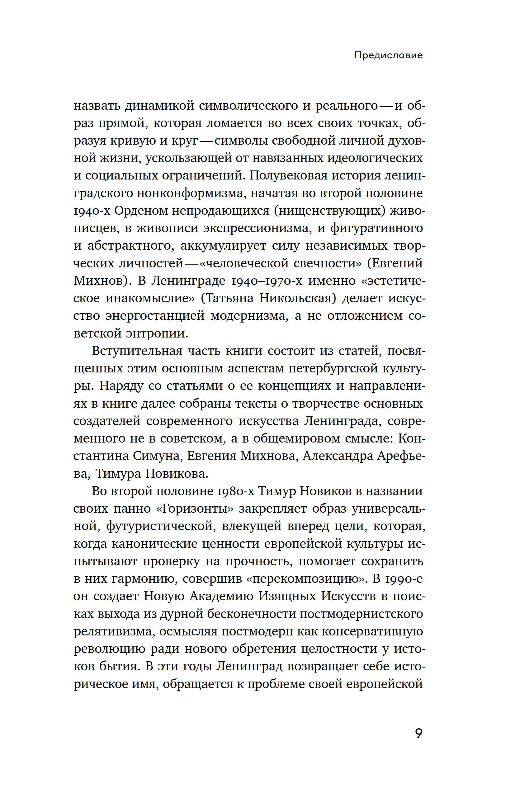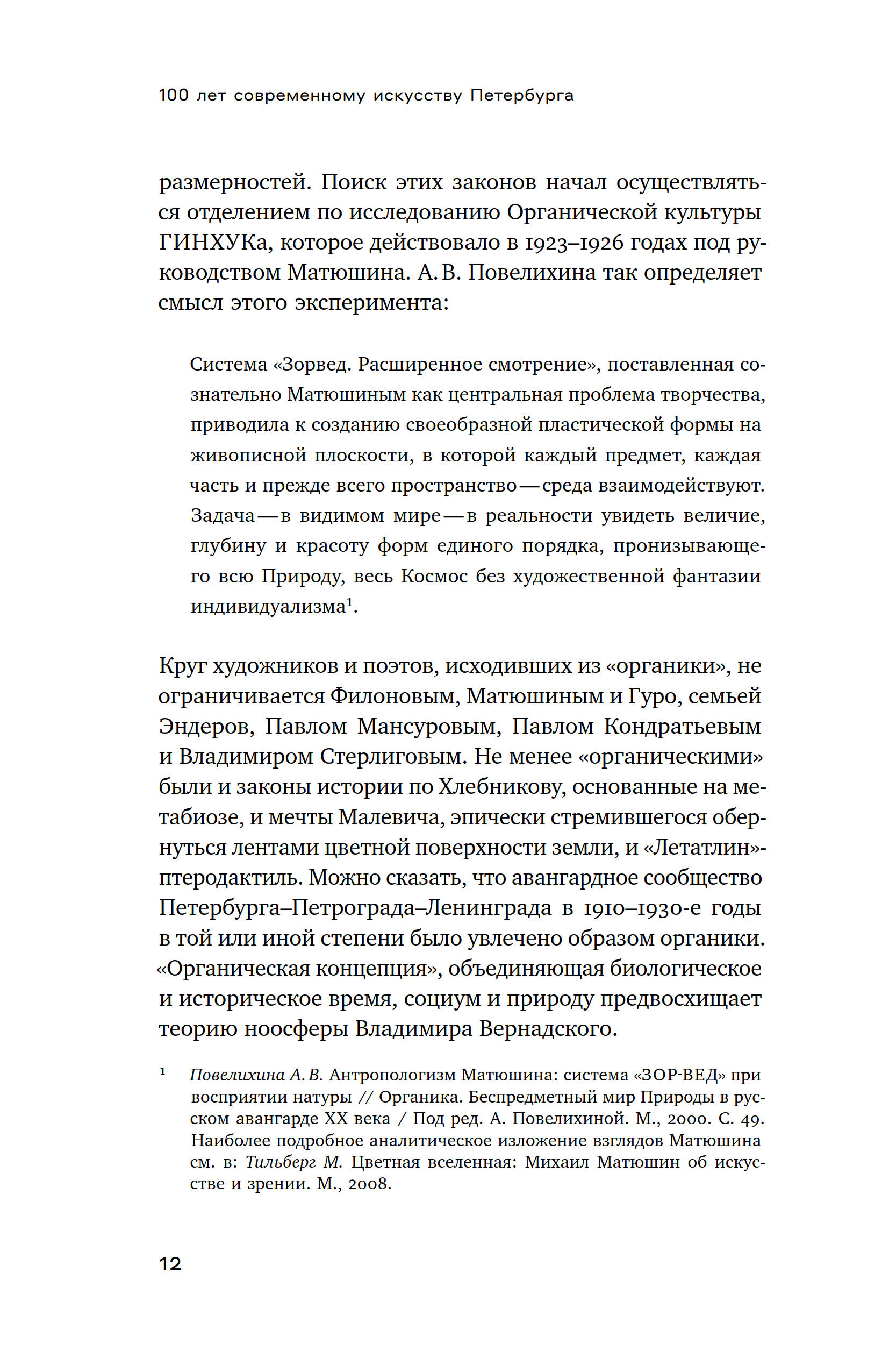 Ось книги Екатерины Андреевой прочерчена через те события искусства, которые взаимосвязаны задачей разведки и транспортировки в будущее образов, страхующих жизнь от энтропии. Она проходит через пласты авангарда 1910 х, нонконформизма 1940–1980 х, искусства новой реальности 1990–2010 х, пересекая личные истории Михаила Матюшина, Александра Арефьева, Евгения Михнова, Константина Симуна, Тимура Новикова, других художников-мыслителей, которые преображают жизнь в непрестанном «оформлении себя», в пересоздании космоса.