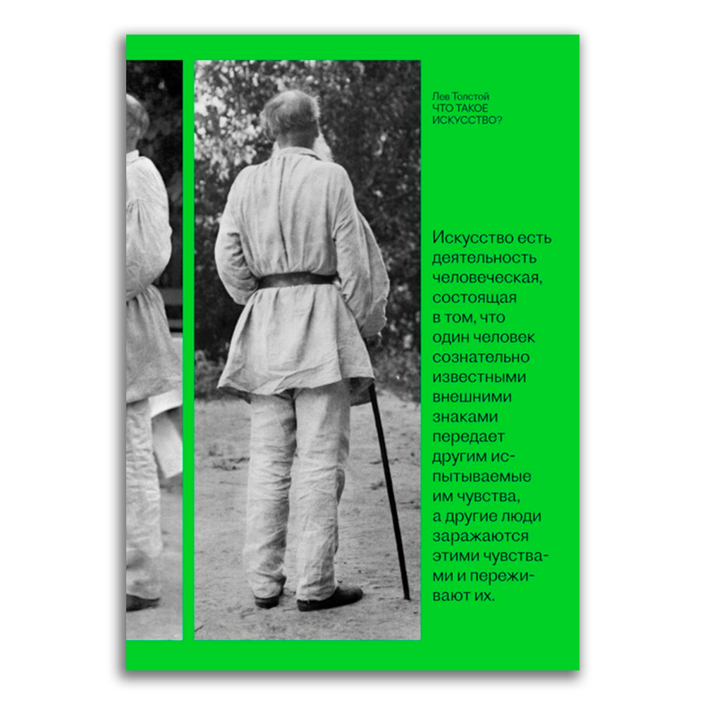 Трактат Льва Толстого был впервые опубликован в 1897 году и холодно встречен современниками из-за радикального взгляда на искусство. Толстой работал над текстом пятнадцать лет и постоянно вносил в него уточнения. С одной стороны, искусство для него — это форма критики современного общества. С другой — живительная сила, которая сознательно передается от одного человека другим людям. Искусство превращается в своеобразную точку опоры в мире, насквозь пронизанном технологическими отношениями.