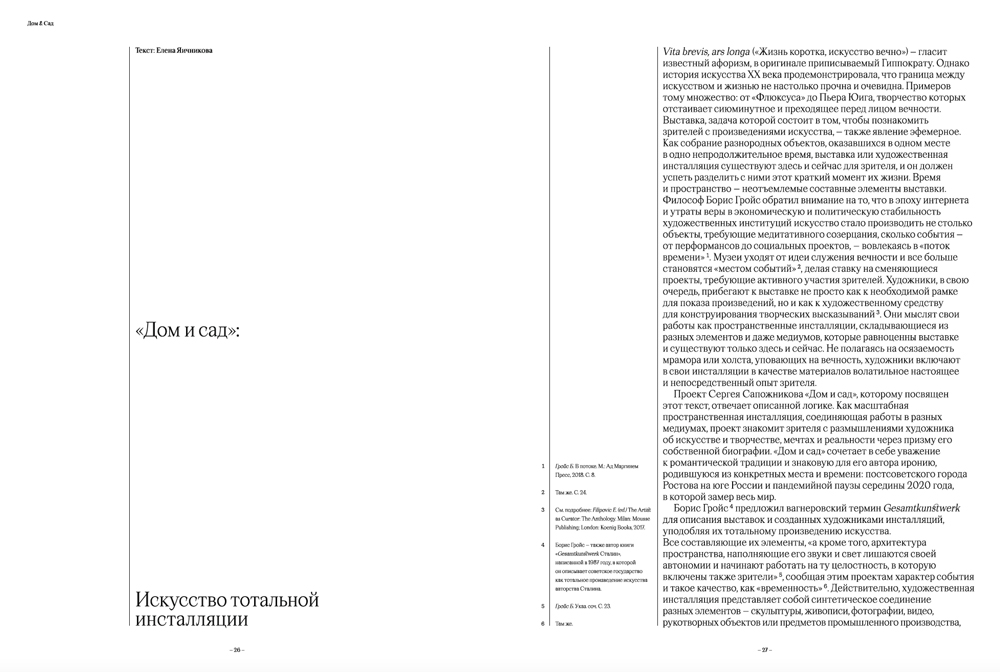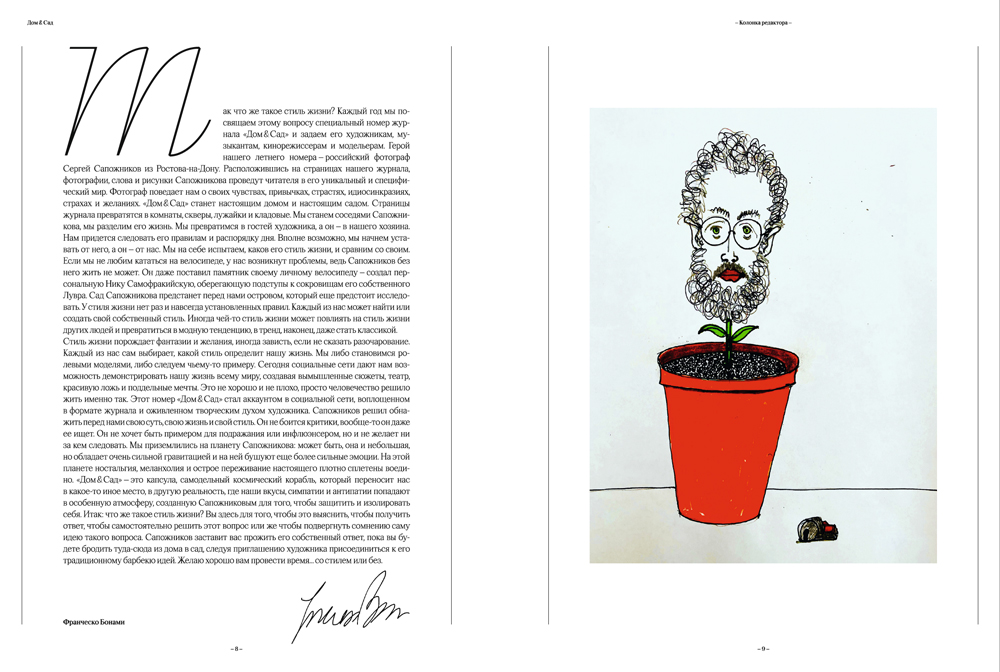 Каталог издан к выставке художника и фотографа Сергея Сапожникова «Дом и сад», которая пройдет в Доме культуры «ГЭС-2» с 8 июня по 17 сентября 2023 года. Источником вдохновения для каталога послужил британский журнал House & Garden, существующий с 1901 года и посвященный дизайну интерьера, садоводству и развлечениям. Идея сделать отсылку к этому изданию принадлежит международному куратору Франческо Бонами, который и выступил главным редактором «специального номера» «Дом & Сад».
