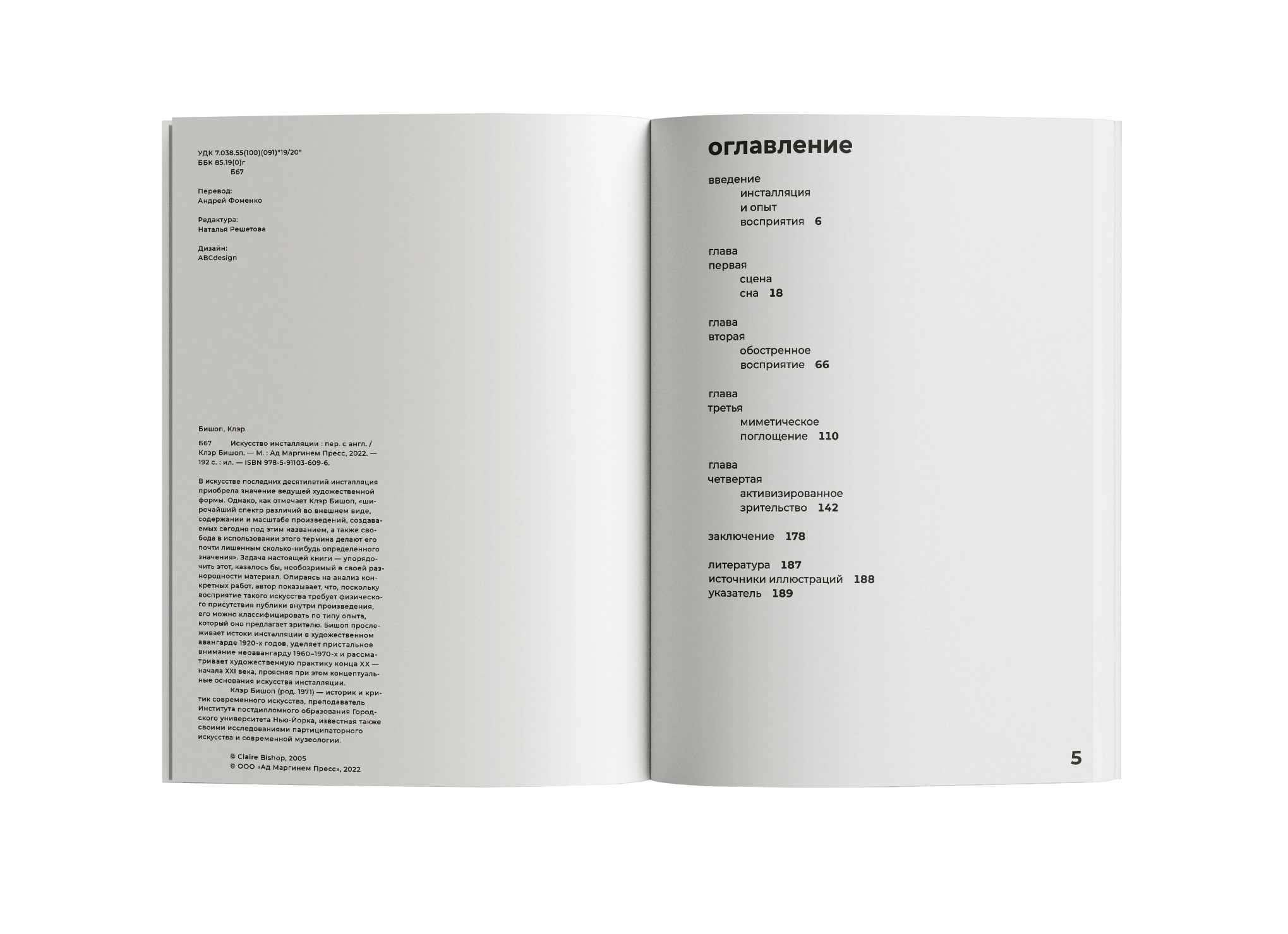 Бишоп прослеживает истоки инсталляции в художественном авангарде 1920-х годов, уделяет пристальное внимание неоавангарду 1960–1970-х и рассматривает художественную практику конца XX — начала XXI века, проясняя при этом концептуальные основания искусства инсталляции.