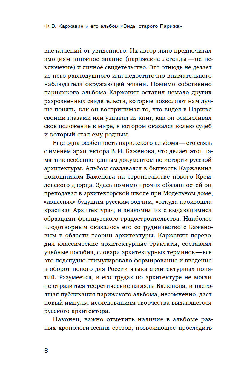 «Русский парижанин» Федор Васильевич Каржавин (1745–1812), нелегально вывезенный 7-летним ребенком во Францию, и знаменитый зодчий Василий Иванович Баженов (1737/8—1799) познакомились в Париже, куда осенью 1760 года талантливый пенсионер петербургской Академии художеств прибыл для совершенствования своего мастерства. Возникшую между ними дружбу скрепило совместное плавание летом 1765 года на корабле из Гавра в Санкт-Петербург. С 1769 по 1773 год Каржавин служил в должности архитекторского помощника под началом Баженова, возглавлявшего реконструкцию древнего Московского кремля. «Должность ево и знание не в чертежах и не в рисунке, — представлял Баженов своего парижского приятеля в Экспедиции Кремлевского строения, — но, именно, в разсуждениях о математических тягостях, в физике, в переводе с латинского, с французского и еллино-греческого языка авторских сочинений о величавых пропорциях Архитектуры». В этих знаниях крайне нуждалась архитекторская школа, созданная при Модельном доме в Кремле. Альбом «Виды старого Парижа», задуманный Каржавиным как пособие «для изъяснения, откуда произошла красивая Архитектура», много позже стал чем-то вроде дневника наблюдений за событиями в революционном Париже.
