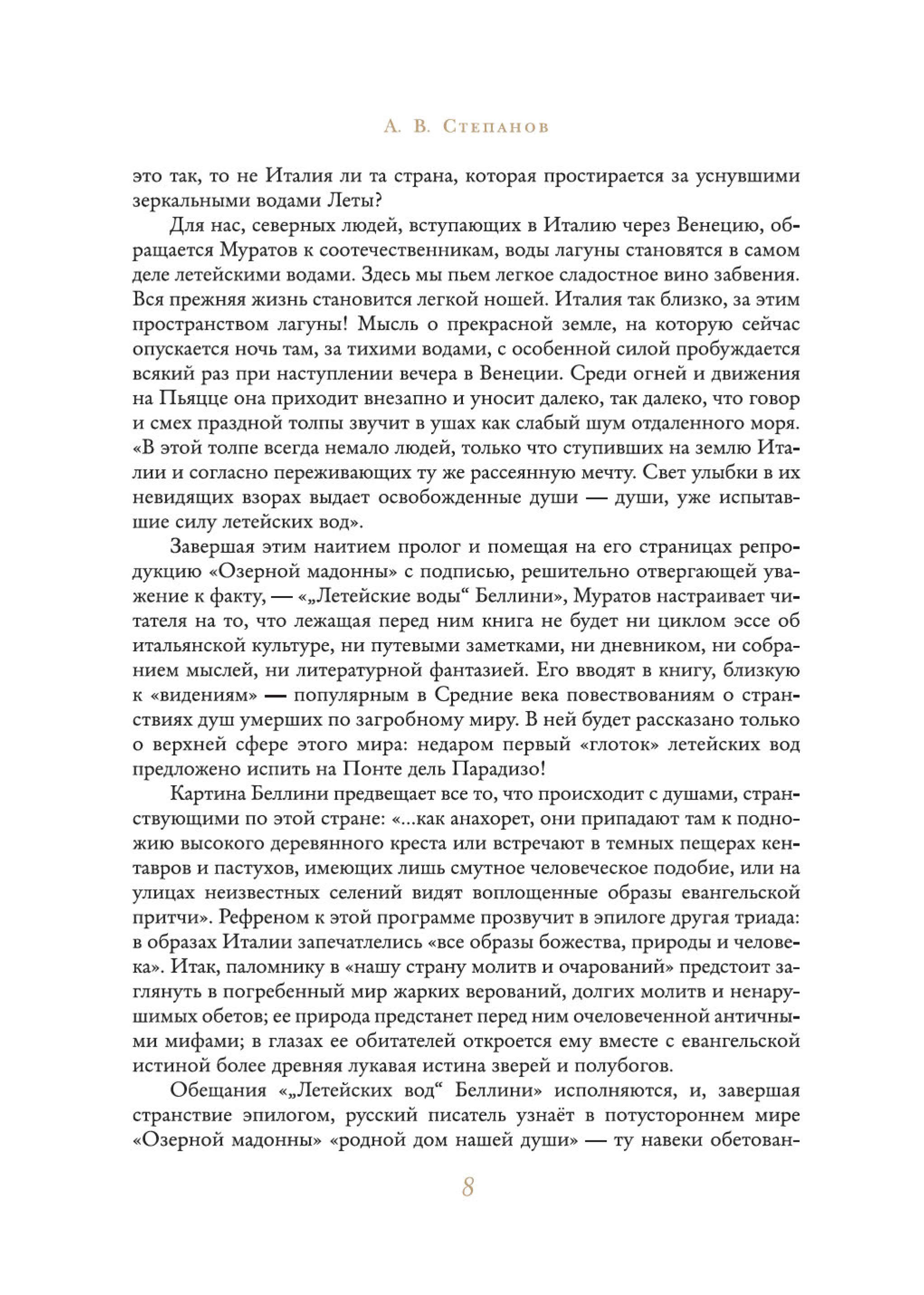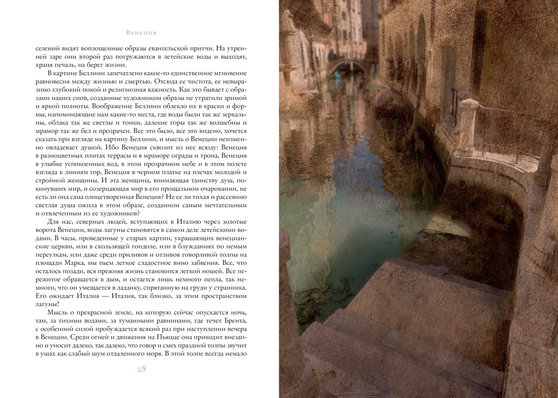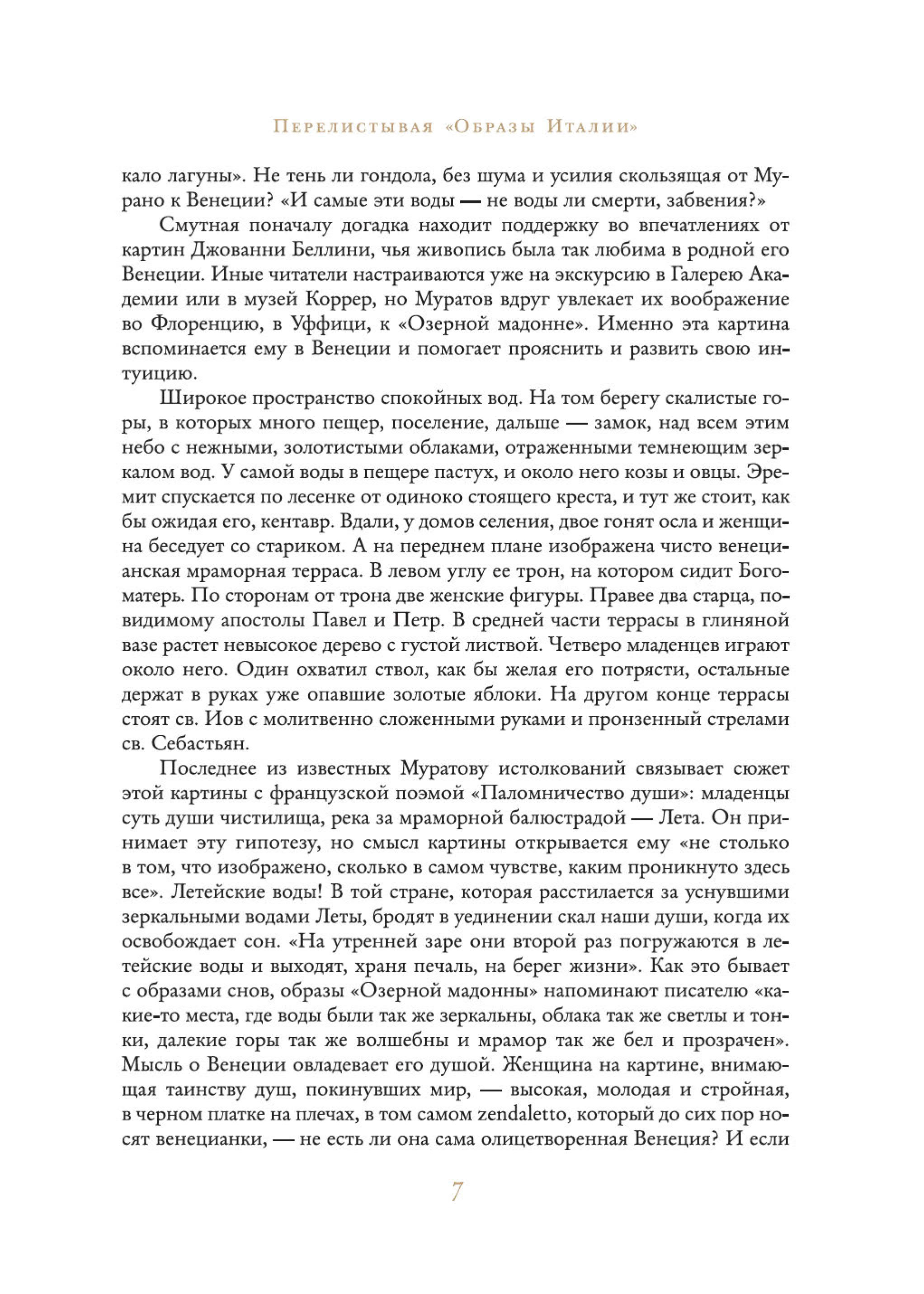 Изобразительный ряд в настоящем издании составляют произведения петербургского художника Нади Кузнецовой, работающей на стыке двух техник — фотографии и графики. В нее работах замечательно переданы тот особый свет, «итальянская пыль», которой по сей день напоен воздух страны, которая была для Павла Муратова духовной родиной.