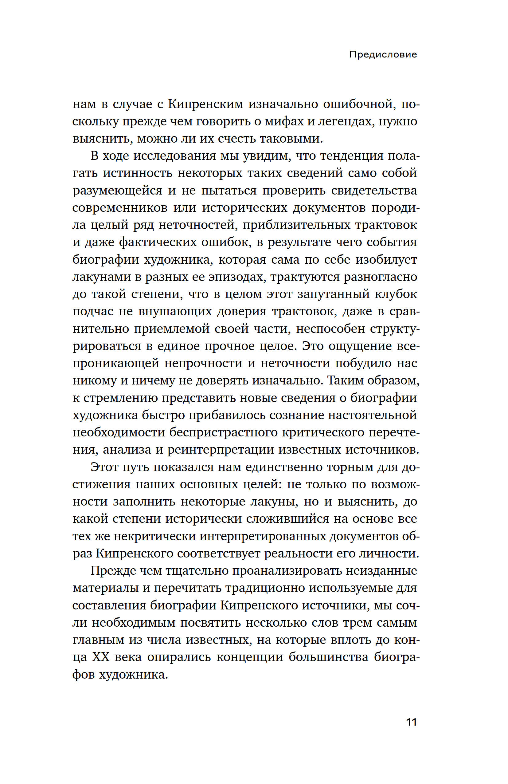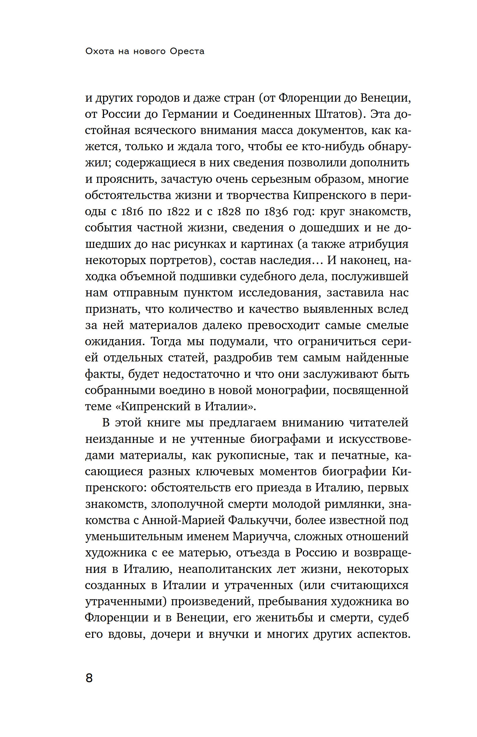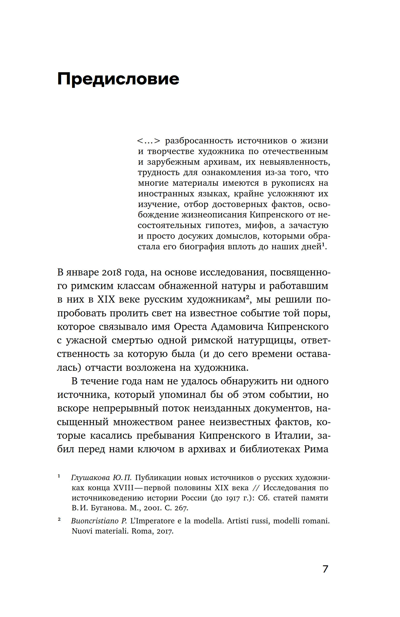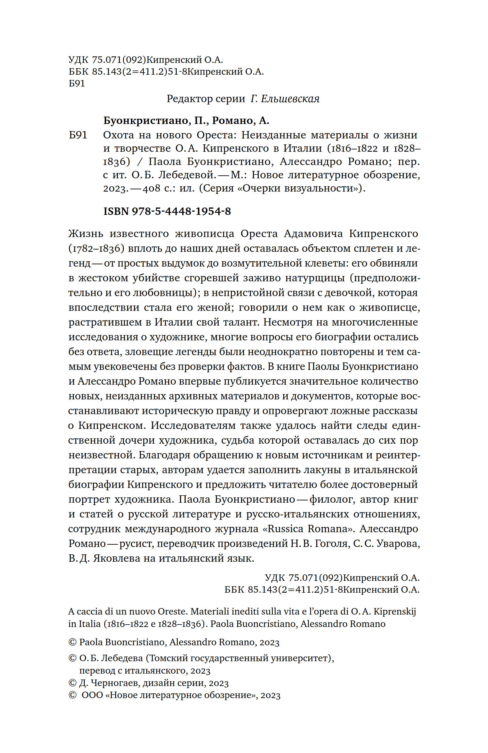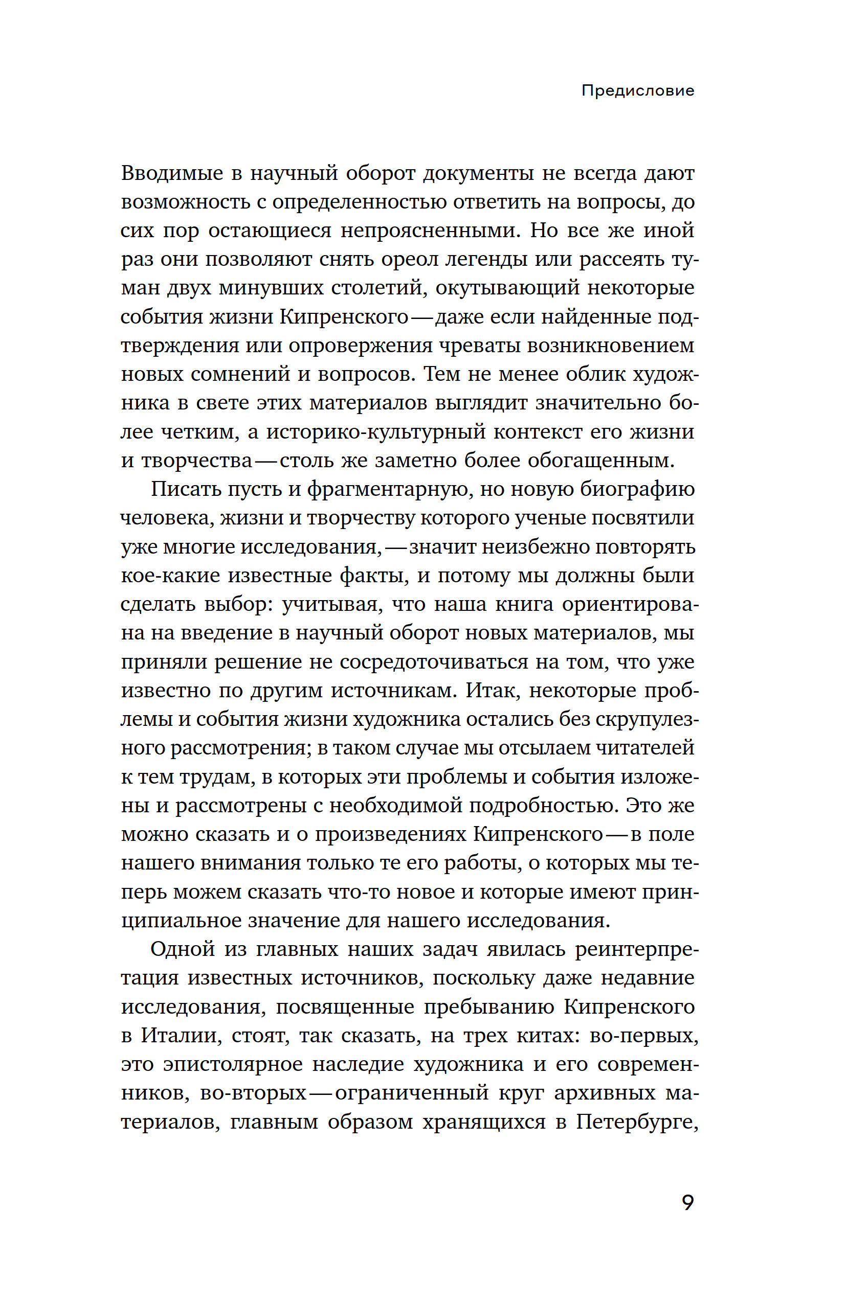 В книге Паолы Буонкристиано и Алессандро Романо впервые публикуется значительное количество новых, неизданных архивных материалов и документов, которые восстанавливают историческую правду и опровергают ложные рассказы о Кипренском. Исследователям также удалось найти следы единственной дочери художника, судьба которой оставалась до сих пор неизвестной. Благодаря обращению к новым источникам и реинтерпретации старых, авторам удается заполнить лакуны в итальянской биографии Кипренского и предложить читателю более достоверный портрет художника.
