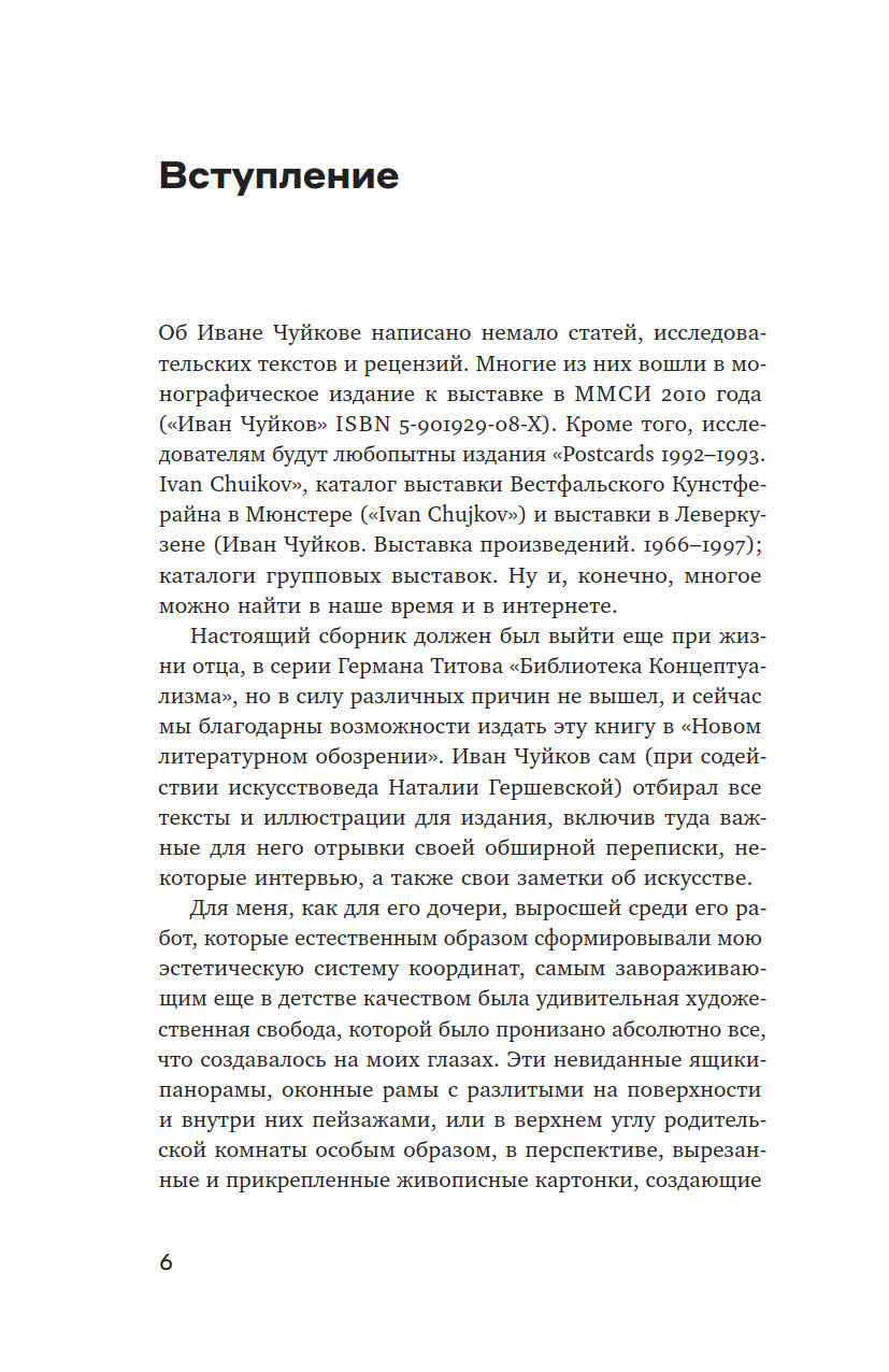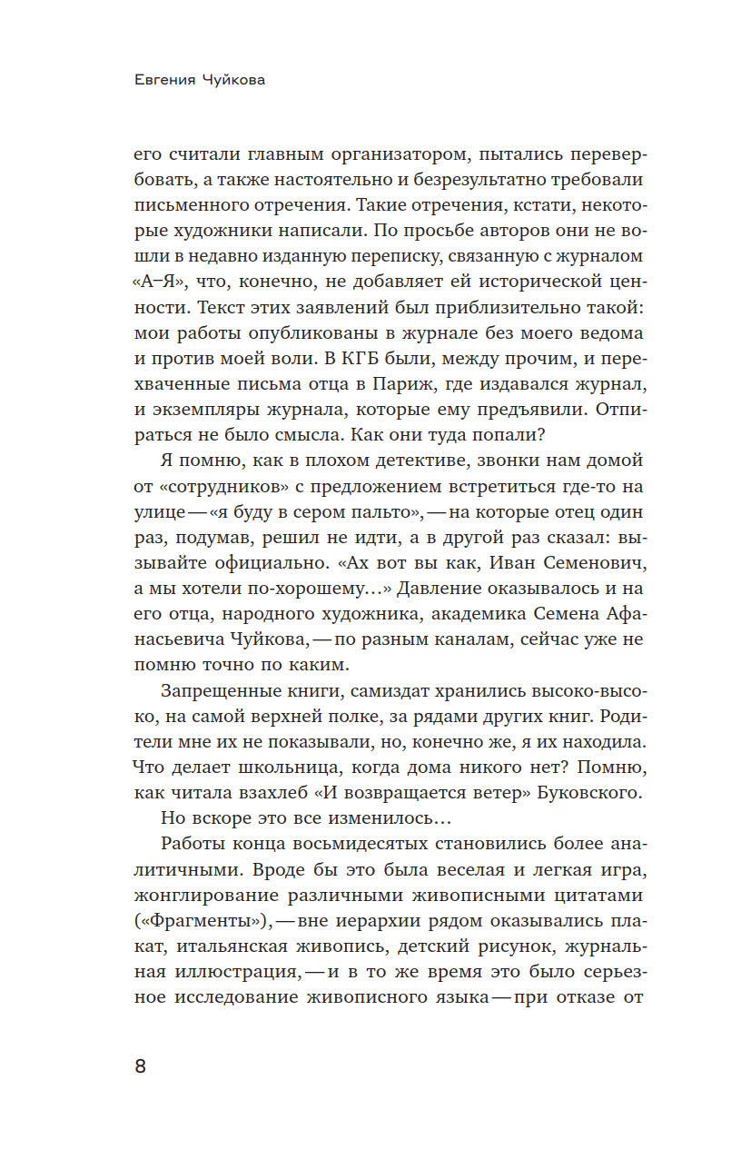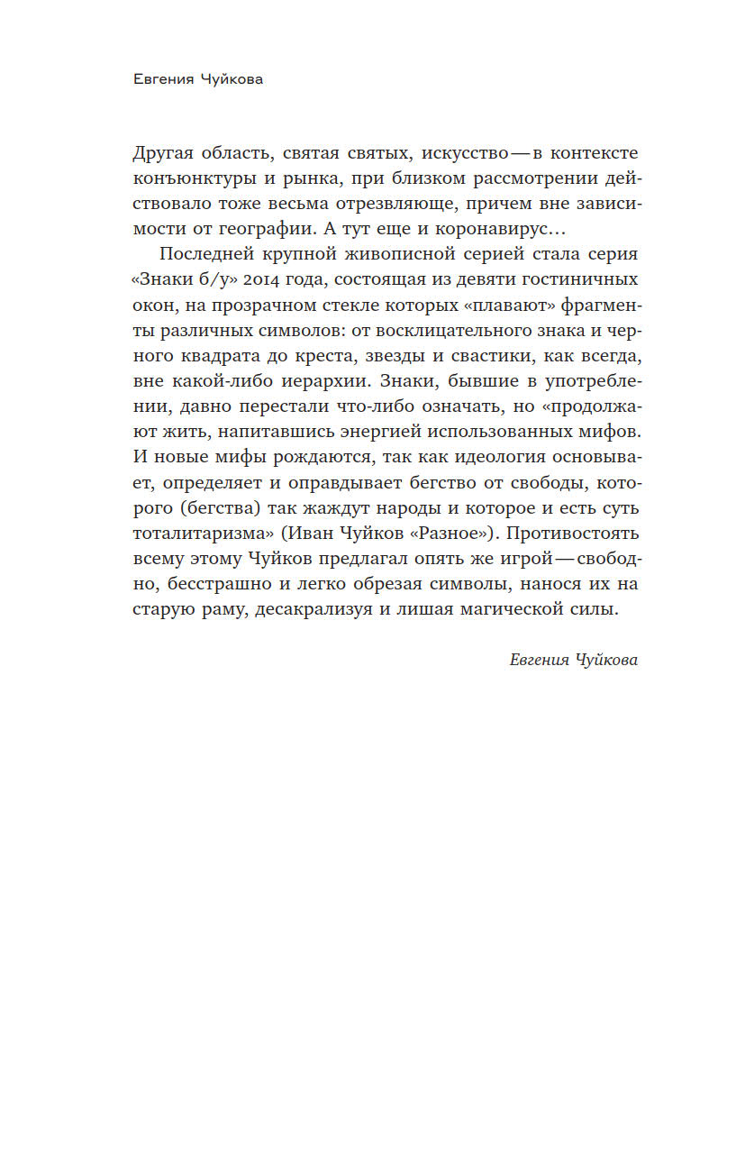 Иван Чуйков (1935–2020), классик российского неподцензурного искусства, в отличие от многих своих коллег, занимался подобного рода исследованиями, не выходя из изобразительного поля, — его словесный и аналитический дар реализовался в интервью и письмах. Из них он сам составил эту книгу, но, к сожалению, не успел увидеть ее изданной. При этом книга представляет не только автора. Она позволяет рассмотреть изнутри то художественное движение, которому автор принадлежал и в котором был одной из главных фигур, — но рассмотреть в очень индивидуальной оптике, оптике прирожденного живописца, человека «зрительного таланта».