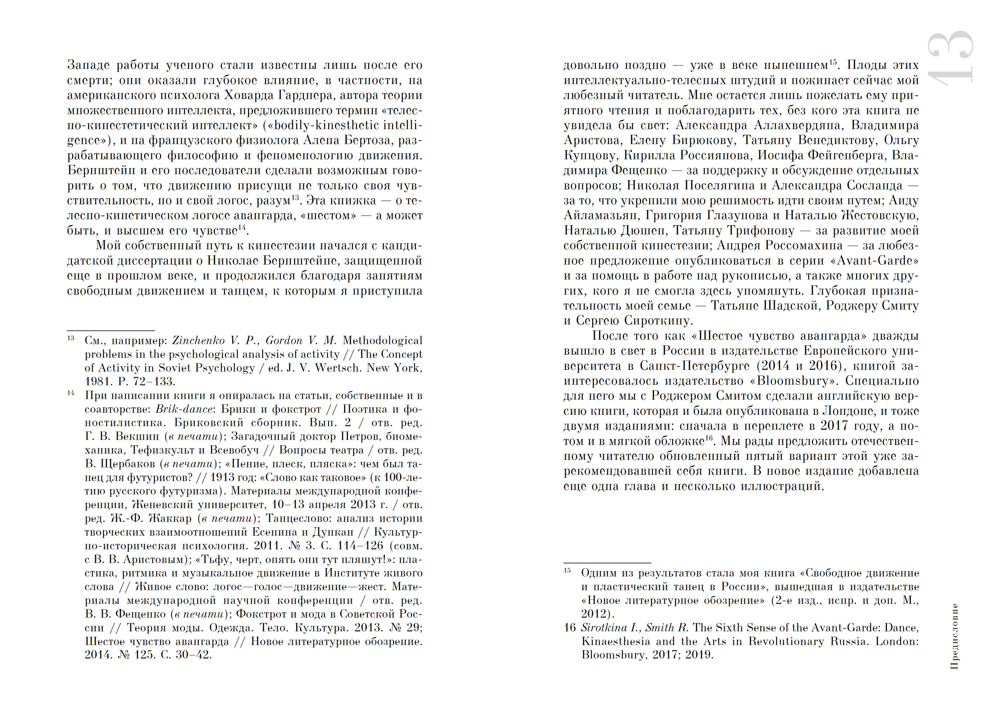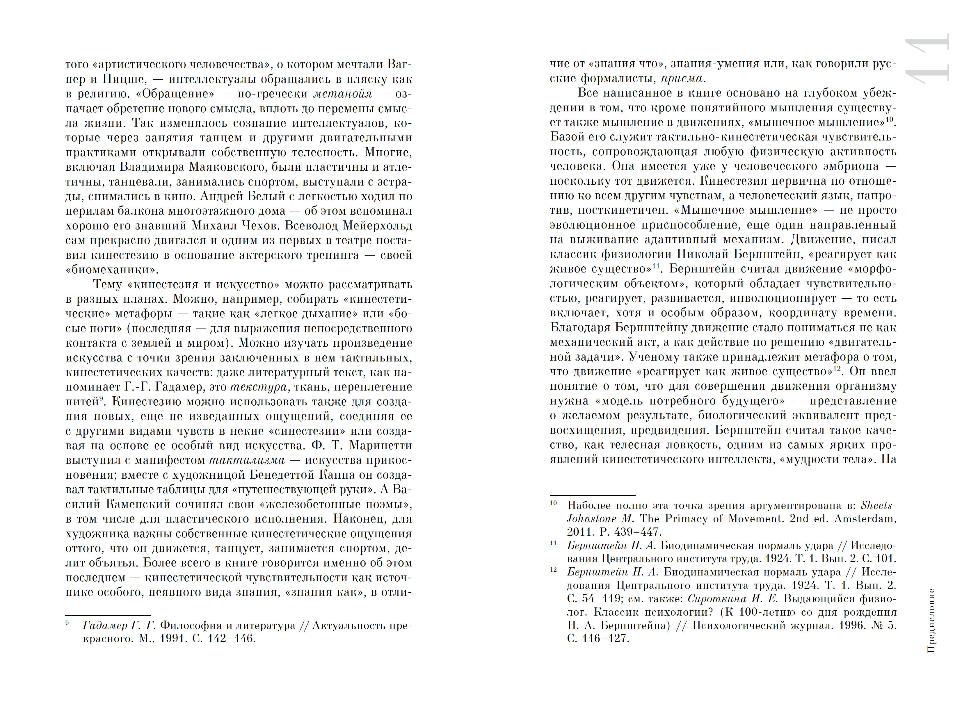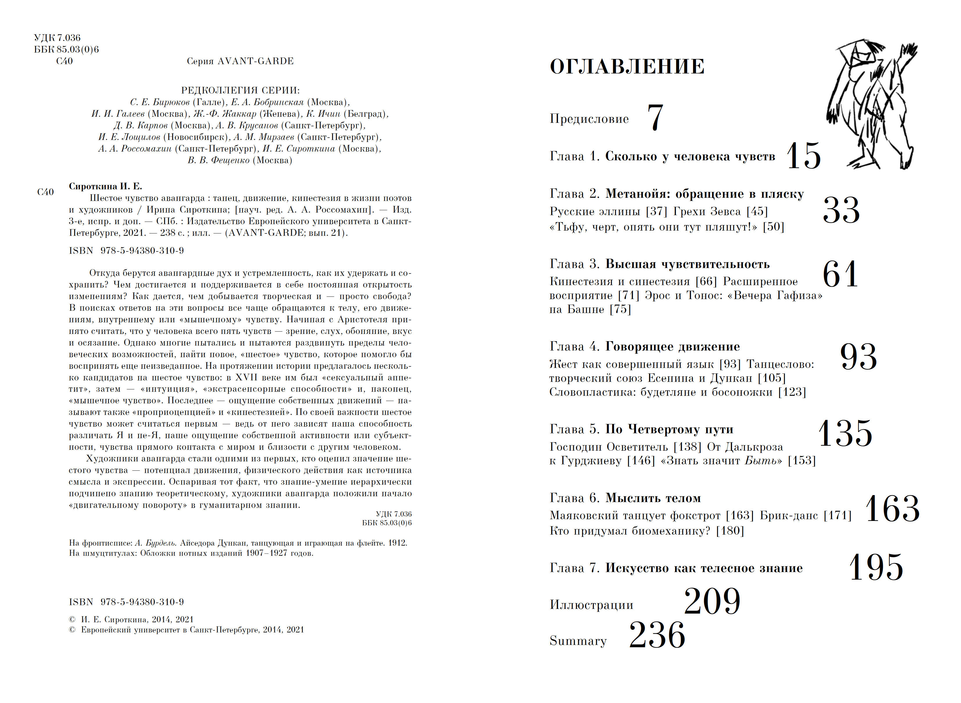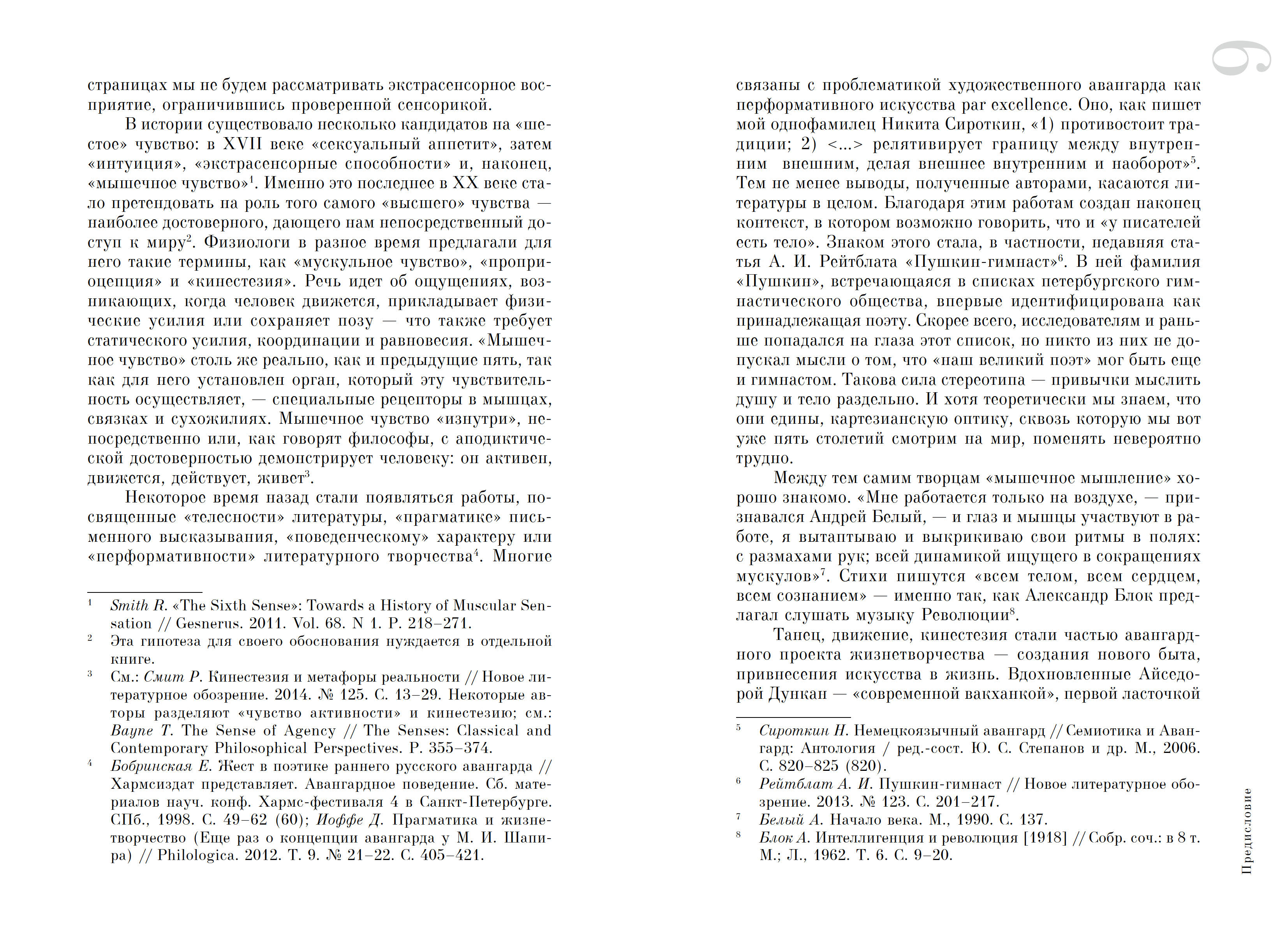 Откуда берутся авангардные дух и устремленность, как их удержать и сохранить? Чем достигается и поддерживается в себе постоянная открытость изменениям? Как дается, чем добывается творческая и — просто свобода? В поисках ответов на эти вопросы все чаще обращаются к телу, его движениям, внутреннему или «мышечному» чувству. Начиная с Аристотеля принято считать, что у человека всего пять чувств — зрение, слух, обоняние, вкус и осязание. Однако многие пытались и пытаются раздвинуть пределы человеческих возможностей, найти новое, «шестое» чувство, которое помогло бы воспринять еще неизведанное. На протяжении истории предлагалось несколько кандидатов на шестое чувство: в XVII веке им был «сексуальный аппетит», затем — «интуиция», «экстрасенсорные способности» и, наконец, «мышечное чувство». Последнее — ощущение собственных движений — называют также «проприоцепцией» и «кинестезией». По своей важности шестое чувство может считаться первым — ведь от него зависят наша способность различать Я и не-Я, наше ощущение собственной активности или субъектности, чувства прямого контакта с миром и близости с другим человеком. Художники авангарда стали одними из первых, кто оценил значение шестого чувства — потенциал движения, физического действия как источника смысла и экспрессии. Оспаривая тот факт, что знание-умение иерархически подчинено знанию теоретическому, художники авангарда положили начало «двигательному повороту» в гуманитарном знании.
