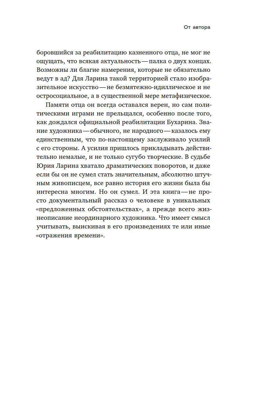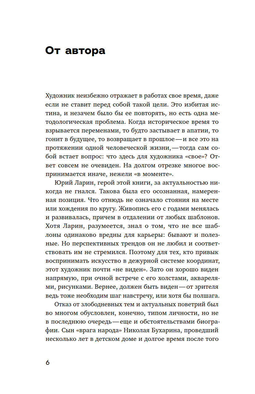 Документальная биография, написанная Дмитрием Смолевым, объединяет в себе и исследование творчества Ларина, и обстоятельства современной ему художественной сцены, и семейную сагу. Живопись здесь не обособлена в отдельный, автономный мир, а вписана в широкий контекст эпохи, отголоски которой слышны и по сей день.