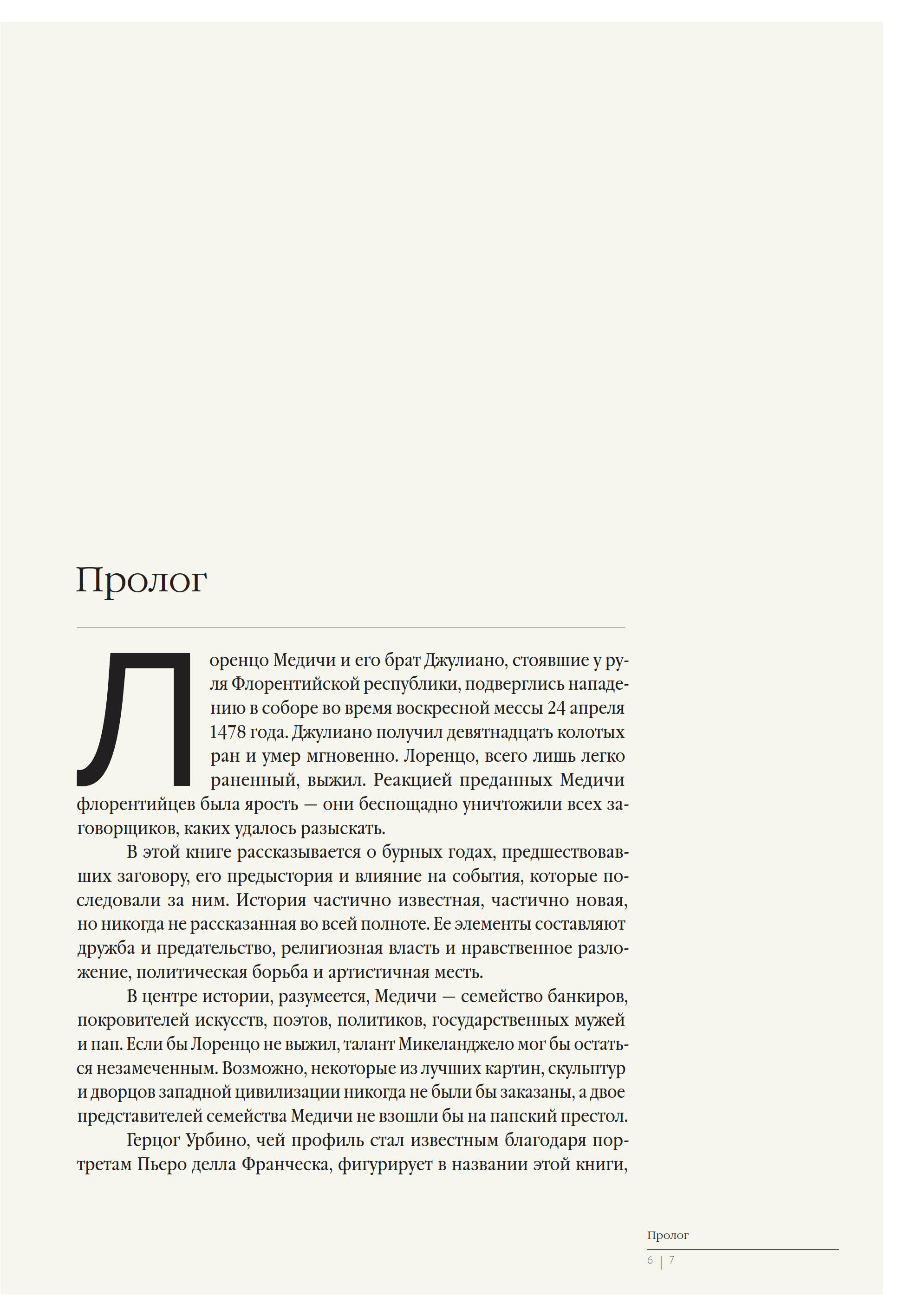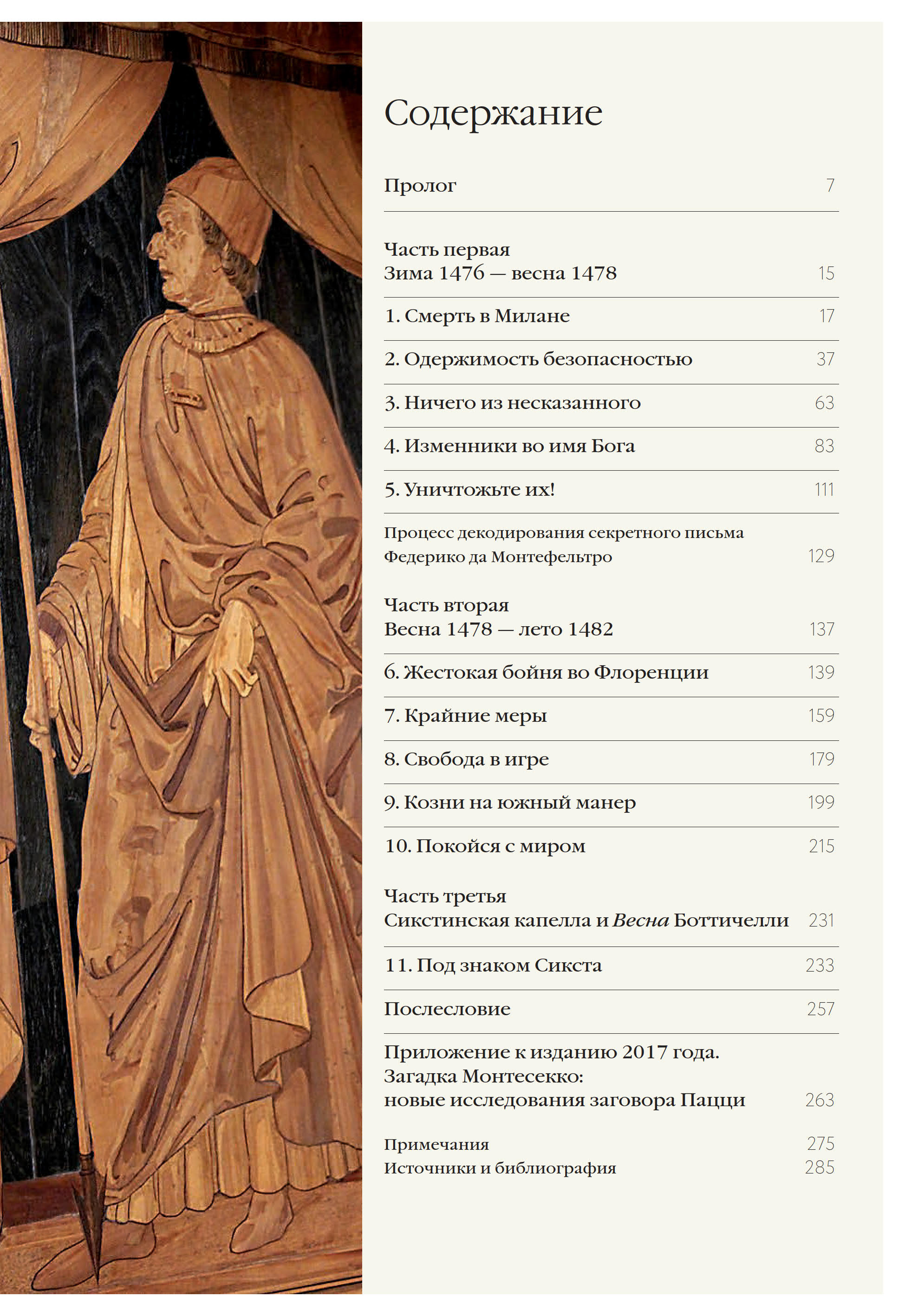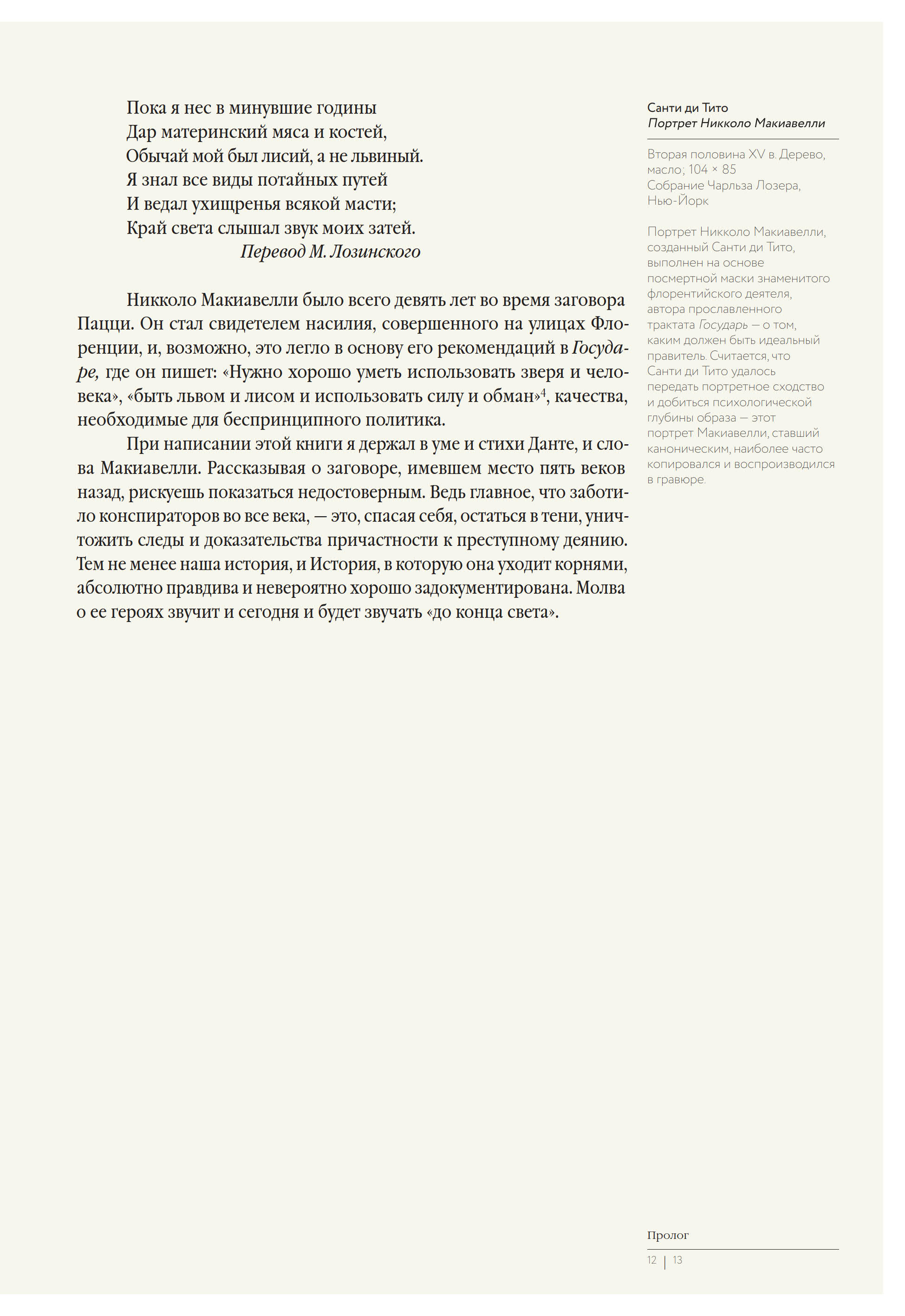 «При написании этой книги я держал в уме и стихи Данте, и слова Макиавелли. Рассказывая о заговоре, имевшем место пять веков назад, рискуешь показаться недостоверным. Ведь главное, что заботило конспираторов во все века, — это, спасая себя, остаться в тени, уничтожить следы и доказательства причастности к преступному деянию. Тем не менее наша история, и История, в которую она уходит корнями, абсолютно правдива и невероятно хорошо задокументирована. Молва о ее героях звучит и сегодня и будет звучать „до конца света “»