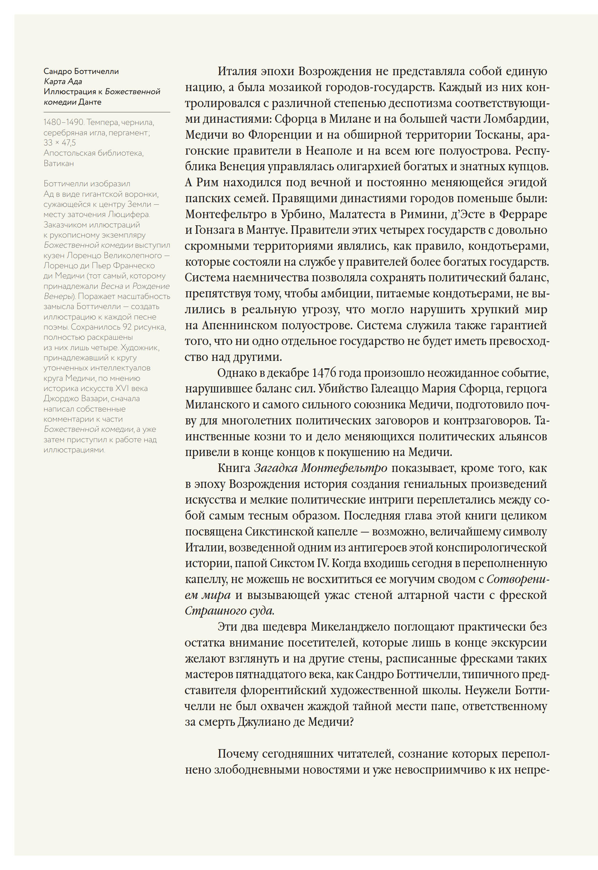 Увлекательный рассказ о дружбе и предательстве, политических кознях и артистичной мести, неожиданная интерпретация знаменитых шедевров (в книге более 150 иллюстраций — произведений, созданных мастерами итальянской живописи эпохи Медичи!) позволяют читателю не только узнать много нового, но и получить настоящее интеллектуальное и эстетическое наслаждение.
