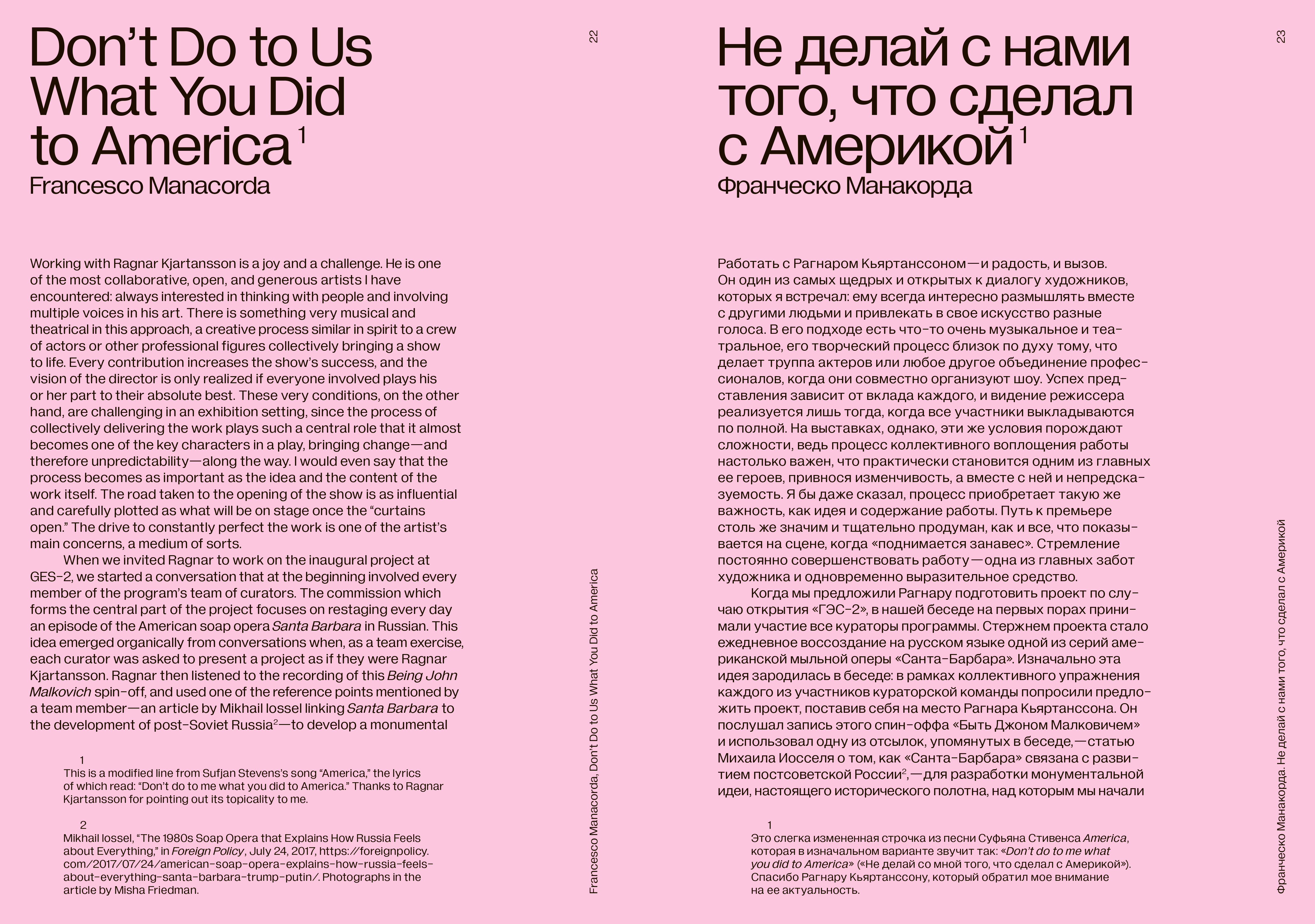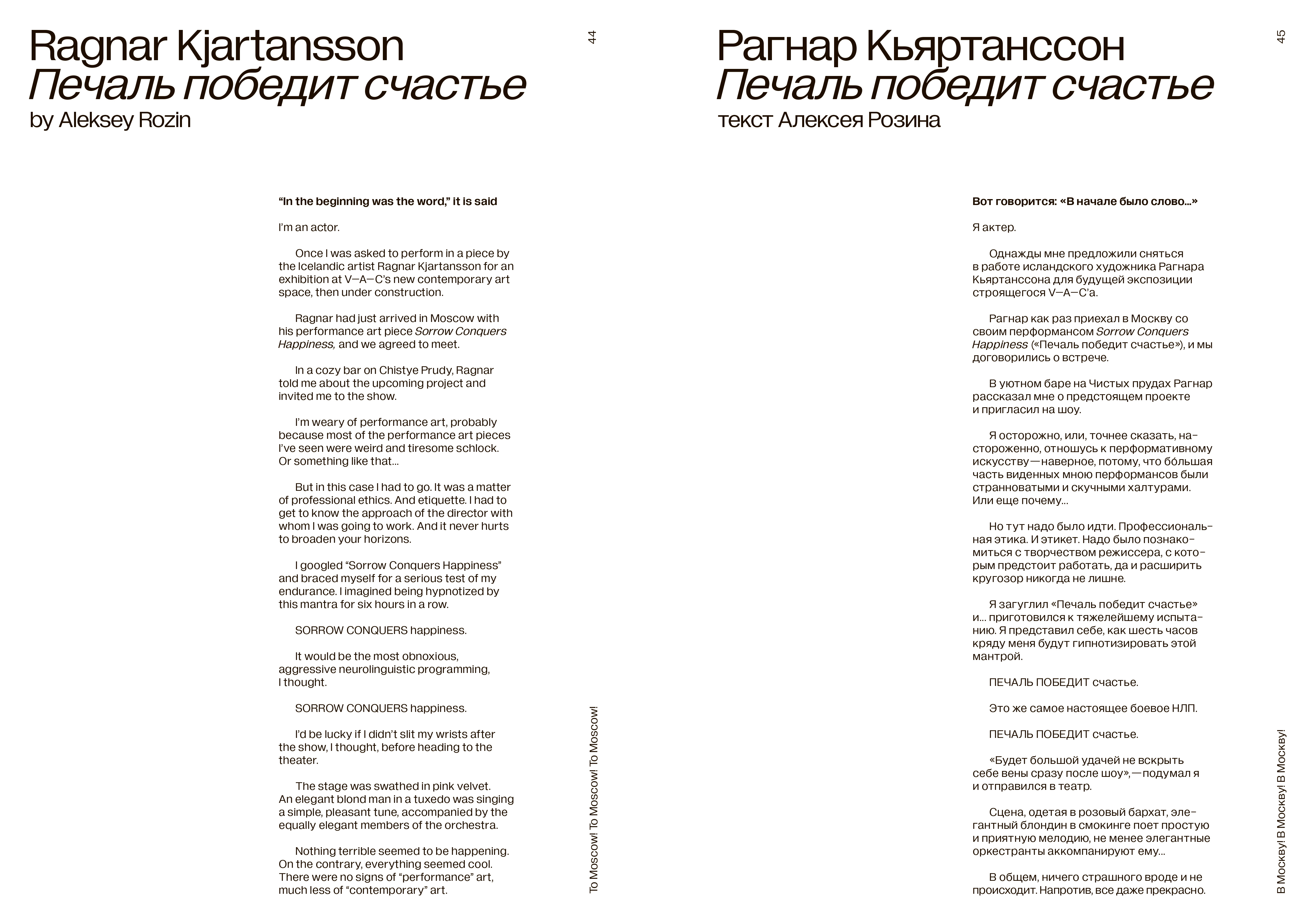 Этот каталог и сборник текстов издан к масштабной групповой выставке «В Москву! В Москву! В Москву!», которая пройдет в Доме культуры «ГЭС-2» с 4 декабря 2021 по 13 марта 2022 года. Проект Рагнара Кьяртанссона и Ингибьорг Сигурьонсдоттир — одна из частей первого тематического сезона «Санта-Барбара. Как не поддаться колонизации», посвященного размышлениям о том, как формировалась современная российская культура начиная с 1990-х годов.