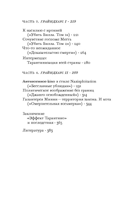 Творчество Тарантино автор разделил на три периода, каждому из которых посвящена отдельная часть книги: первый период — условно криминальное кино, Pulp Fiction; второй период — вторжение режиссера на территорию грайндхауса; третий — утверждение режиссера на территории грайндхауса. Последний период творчества Тарантино отмечен «историческим поворотом», обусловленным желанием режиссера снять Nazisploitation и подорвать конвенции спагетти-вестерна.
