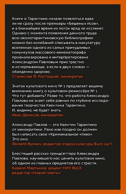 Эта книга, с одной стороны, нефилософская, с другой — исключительно философская. Ее можно рассматривать как исследовательскую работу, но в определенных концептуальных рамках. Автор попытался понять вселенную Тарантино так, как понимает ее режиссер, и обращался к жанровому своеобразию тарантиновских фильмов, чтобы доказать его уникальность.