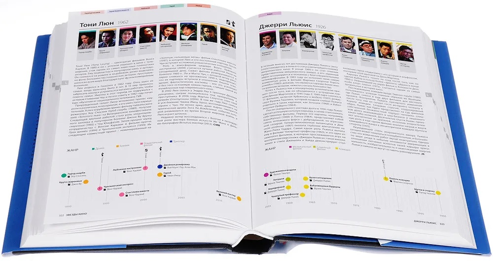 Издание содержит биографии более 300 известных актеров. Книга выстроена в алфавитном порядке имен актеров — где указаны лучшие фильмы, премии и величина прибыли в прокате. Увлекательный текст дополнен фотографиями персонажей и цветными обозначениями хронологии событий, а иллюстрации к фильмам отражают развитие амплуа актеров.
