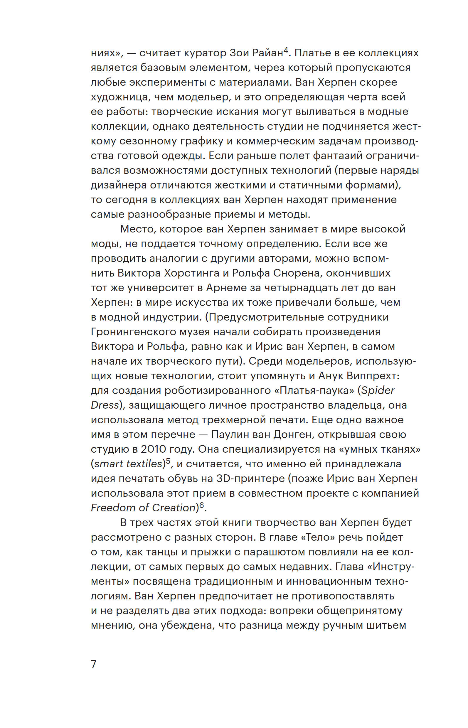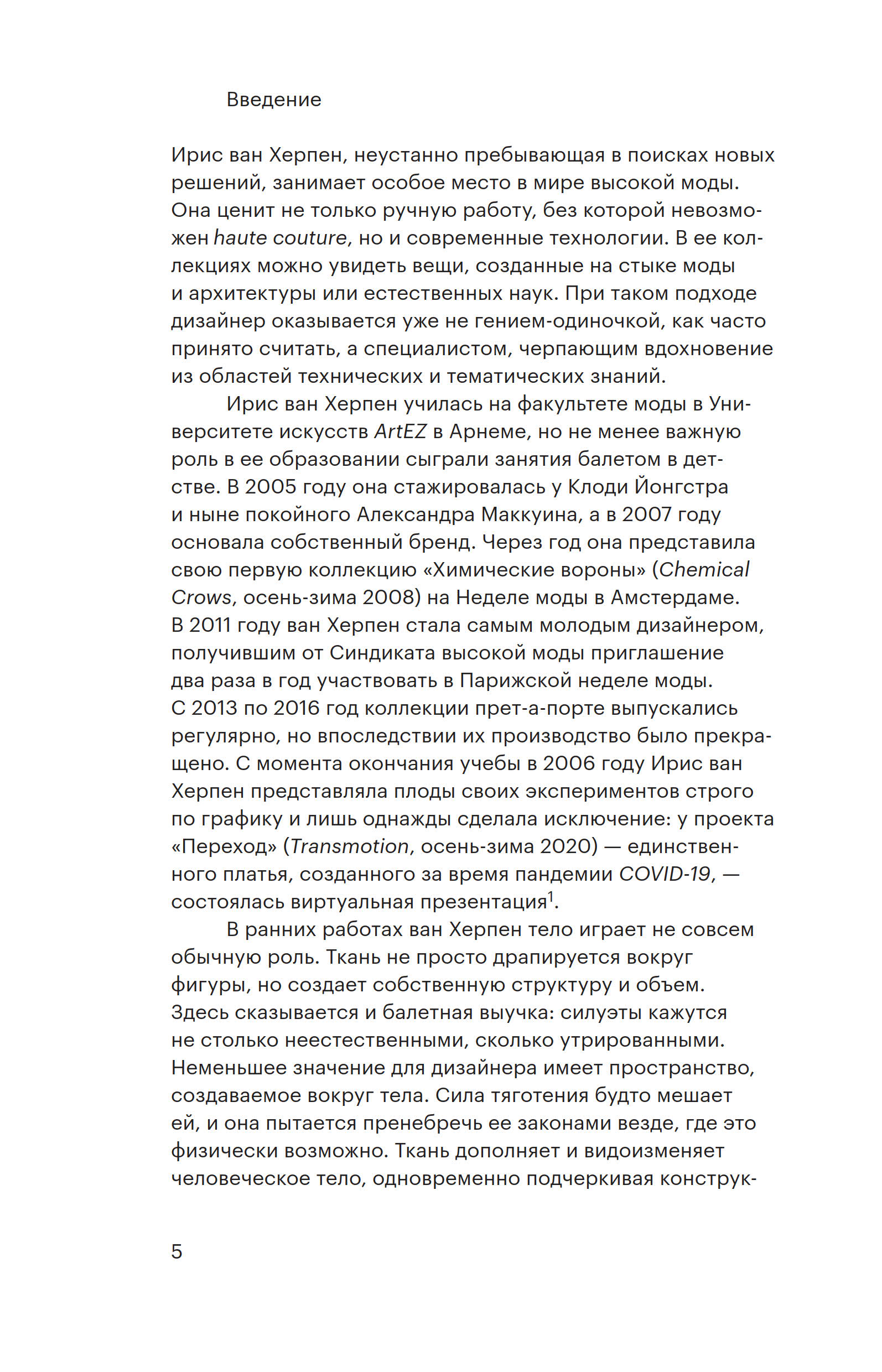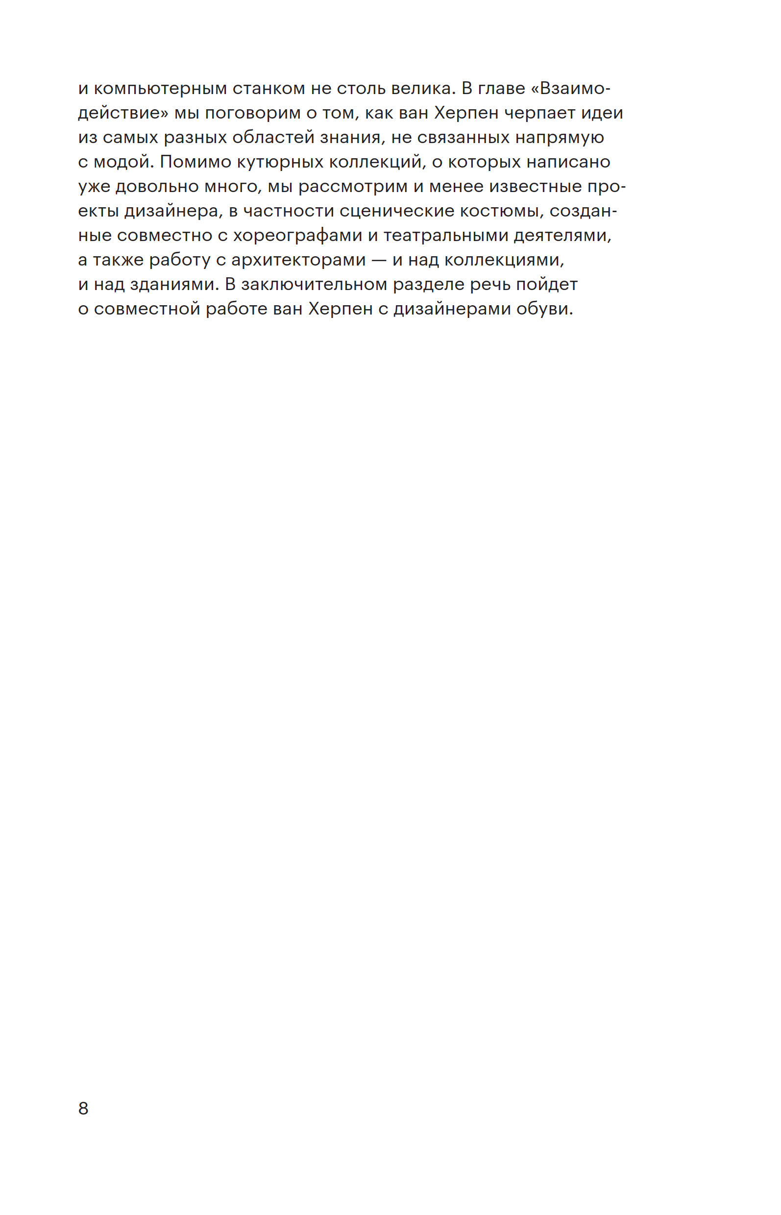 В заключительной главе «Сотрудничество» автор обращается к творческим альянсам Ирис ван Херпен в самом широком контексте — от взаимодействия и поиска общего языка с коллегами из мира моды до выхода в другие области искусства и знания: скульптуру, музыку, архитектуру и науку.