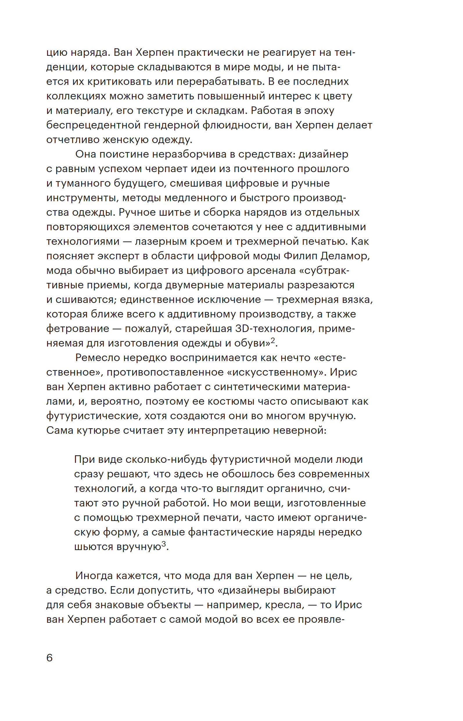 Книга посвящена нидерландскому модельеру Ирис ван Херпен, чье творчество существует на стыке моды, архитектуры и естественных наук. Британская писательница и профессор Джессика Хеммингс с самого начала отмечает ключевую черту ван Херпен, называя ее «скорее художницей», чем дизайнером. Исследование Хеммингс состоит из трех частей, каждая из которых раскрывает основные методы и особенности работы Ирис ван Херпен: «Тело», «Инструменты» и «Сотрудничество».
