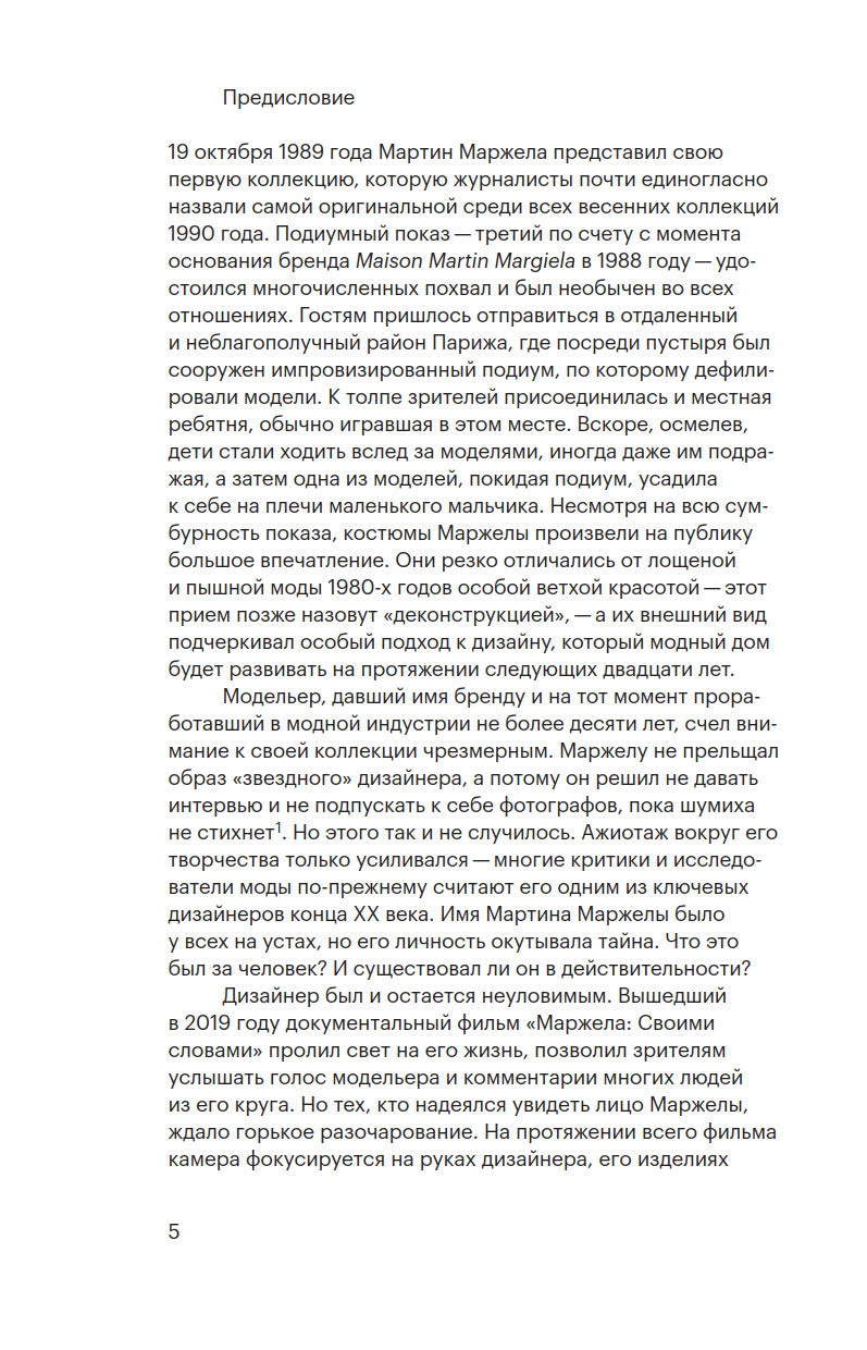 В книге, написанной специально для V—A—C Press, исследовательница моды и куратор Колин Хилл составляет стилистический лексикон бельгийского модельера Мартина Маржелы, состоящий из трех частей: «Память», «Деконструкция», «Игра и импровизация». Несмотря на то, что творчество Маржелы парадоксально и с трудом поддается классификации, такой подход не только позволяет взглянуть на ключевые идеи бренда, но и в определенной степени оказывается созвучен принципам самого дизайнера.