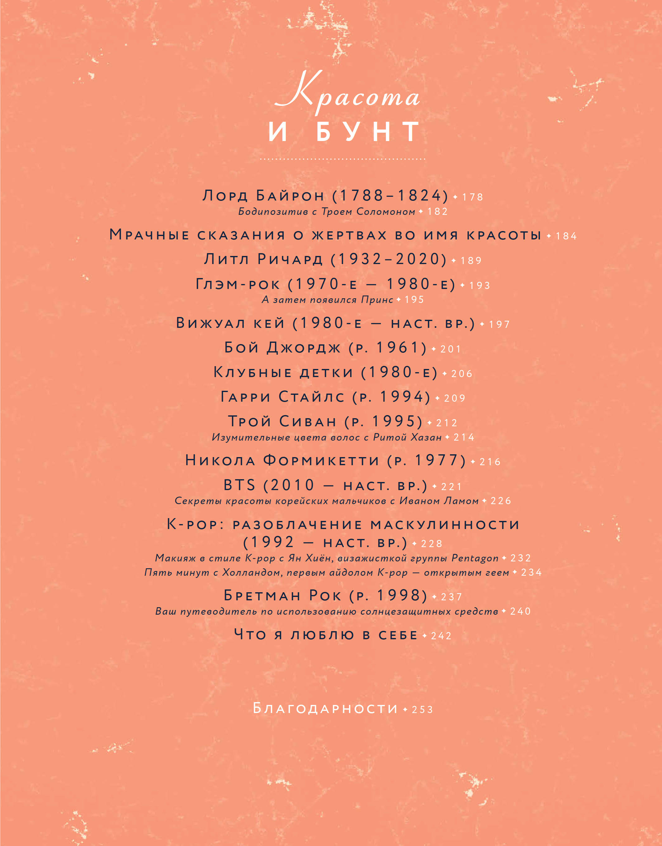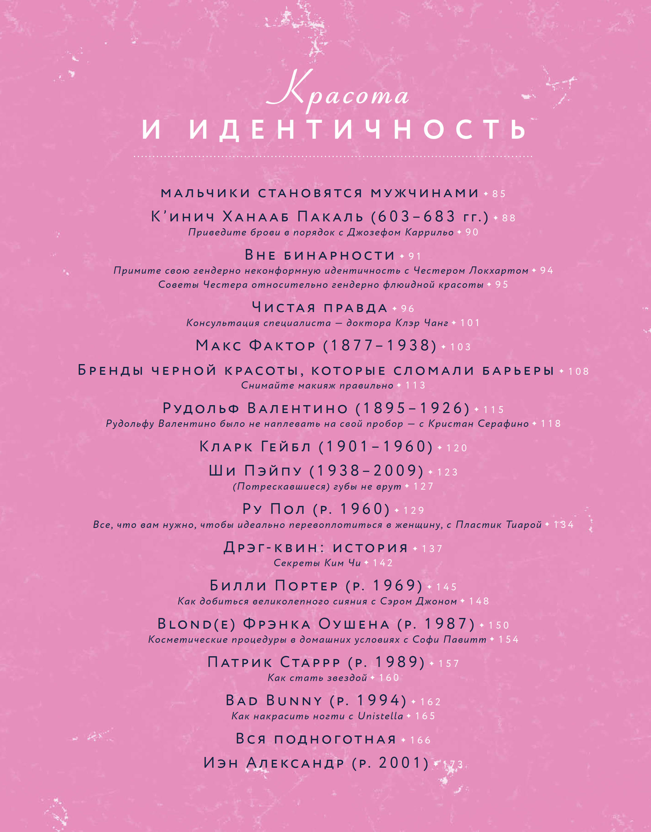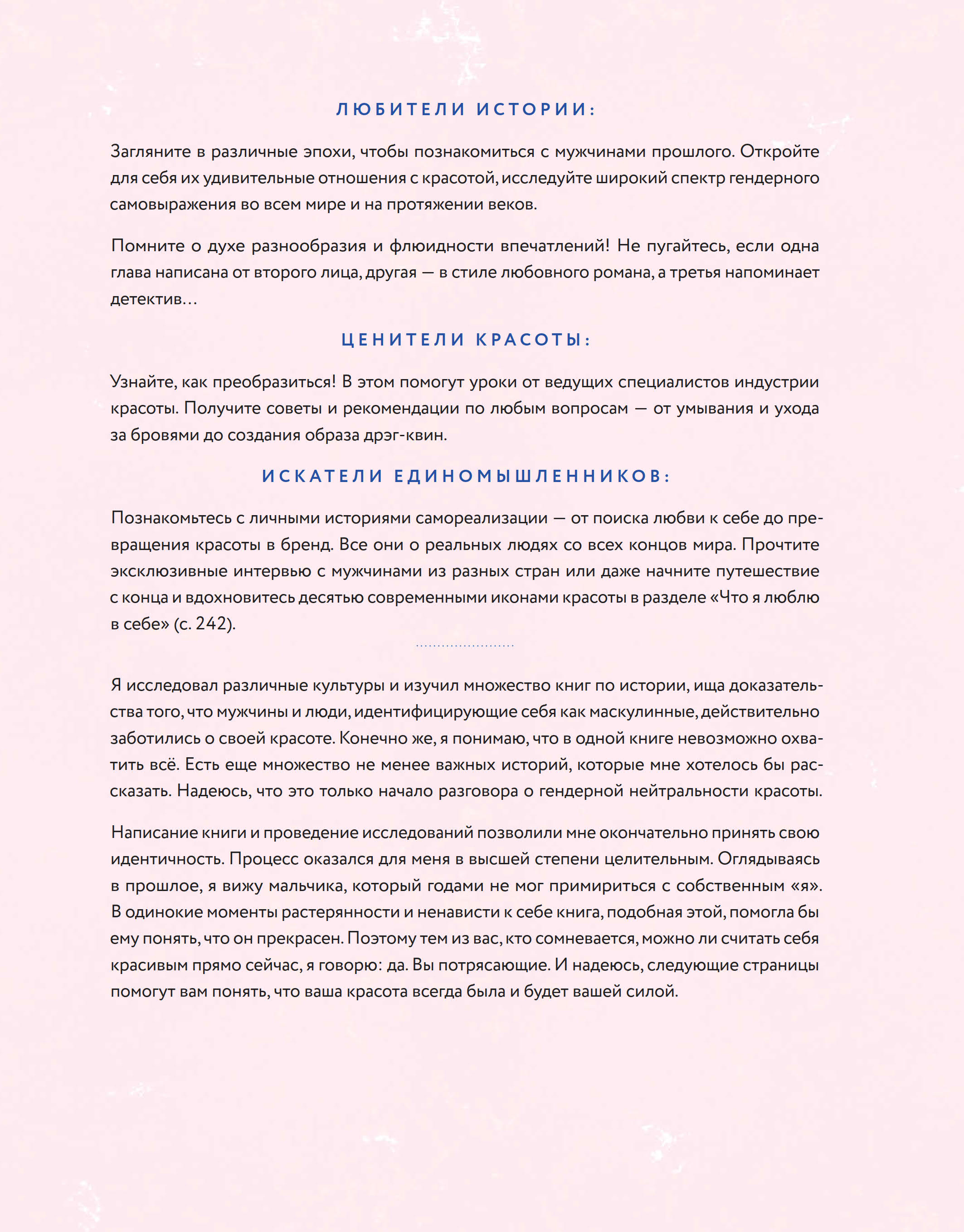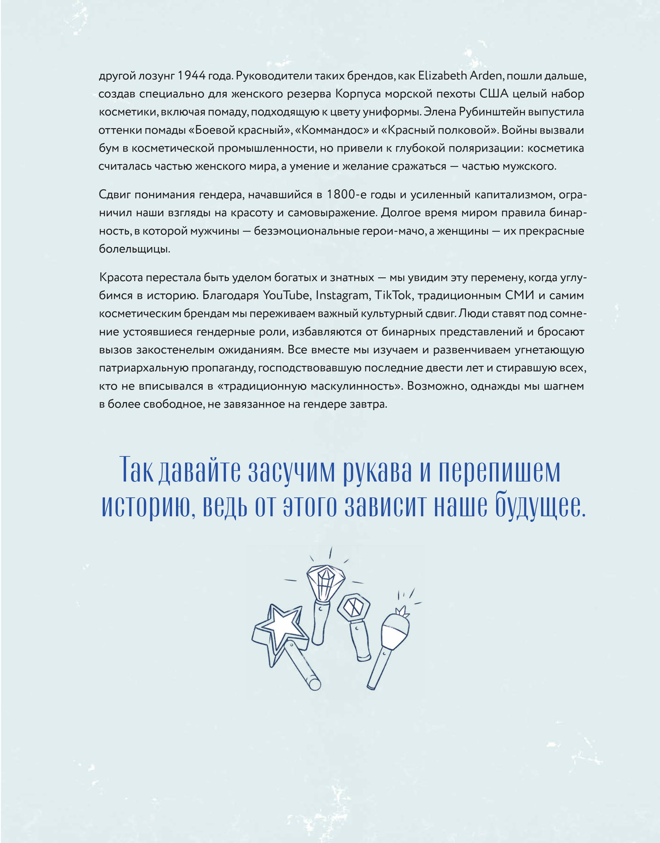 От ароматерапии Александра Македонского до идеально уложенных волос Кларка Гейбла, от тонкой подводки глаз Рами Малека до идеального макияжа в стиле Боя Джорджа или дрэг-квин Кимчи, от K-Beauty до чистой красоты ― эта книга полностью изменит наше представление о гендерном выражении и идентичности.