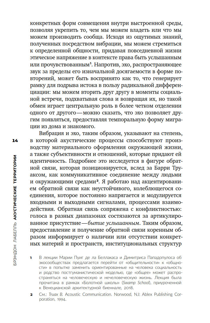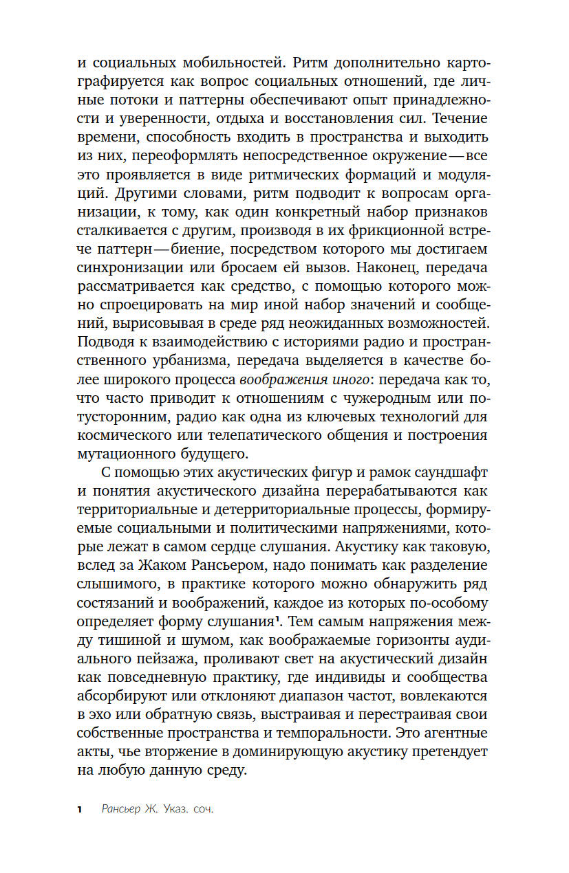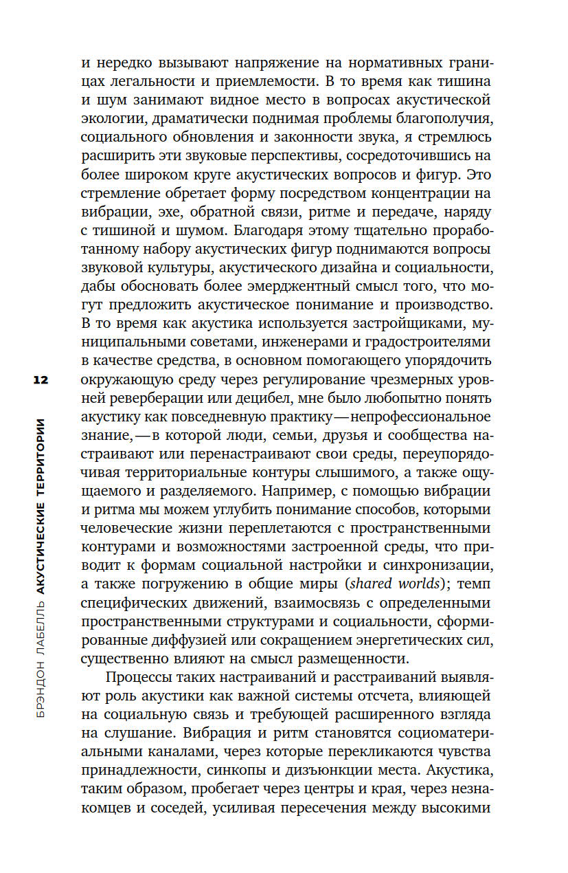 Перемещаясь по городу, зачастую мы полагаемся на зрение, не обращая внимания на то, что нас постоянно преследует колоссальное разнообразие повседневных шумов. Предлагая довериться слуху, американский культуролог Брэндон Лабелль показывает, насколько наш опыт и окружающая действительность зависимы от звукового ландшафта. В предложенной им логике «акустических территорий» звук становится не просто фоном бытовой жизни, но организующей силой, способной задавать новые очертания социальной, политической и культурной деятельности. Опираясь на поэтическую метафорику, Лабелль исследует разные уровни городской жизни, буквально устремляясь снизу вверх — от гула подземки до радиоволн в небе. В результате перед нами одна из наиболее ярких книг, которая объединяет социальную антропологию, урбанистику, философию и теорию искусства и благодаря этому помогает узнать, какую роль играет звук в формировании приватных и публичных сфер нашего существования.