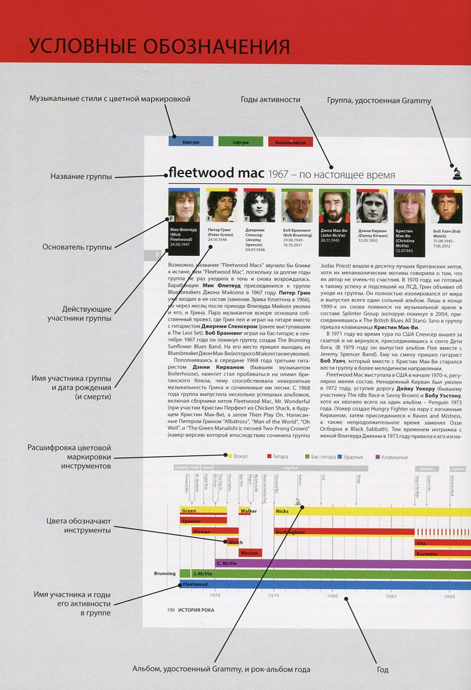 Вы когда-нибудь задавались вопросом, как была основана ваша любимая группа? Желали лучше узнать, как менялся имидж музыкантов и их музыка? А может, интересовались, какие именно участники группы исполняли партию на том или ином альбоме? В этом инновационном издании вы найдете увлекательную информацию о составах, лейблах, имидже и музыке 250 самых известных и важных рок-групп и исполнителей за последние 50 лет.