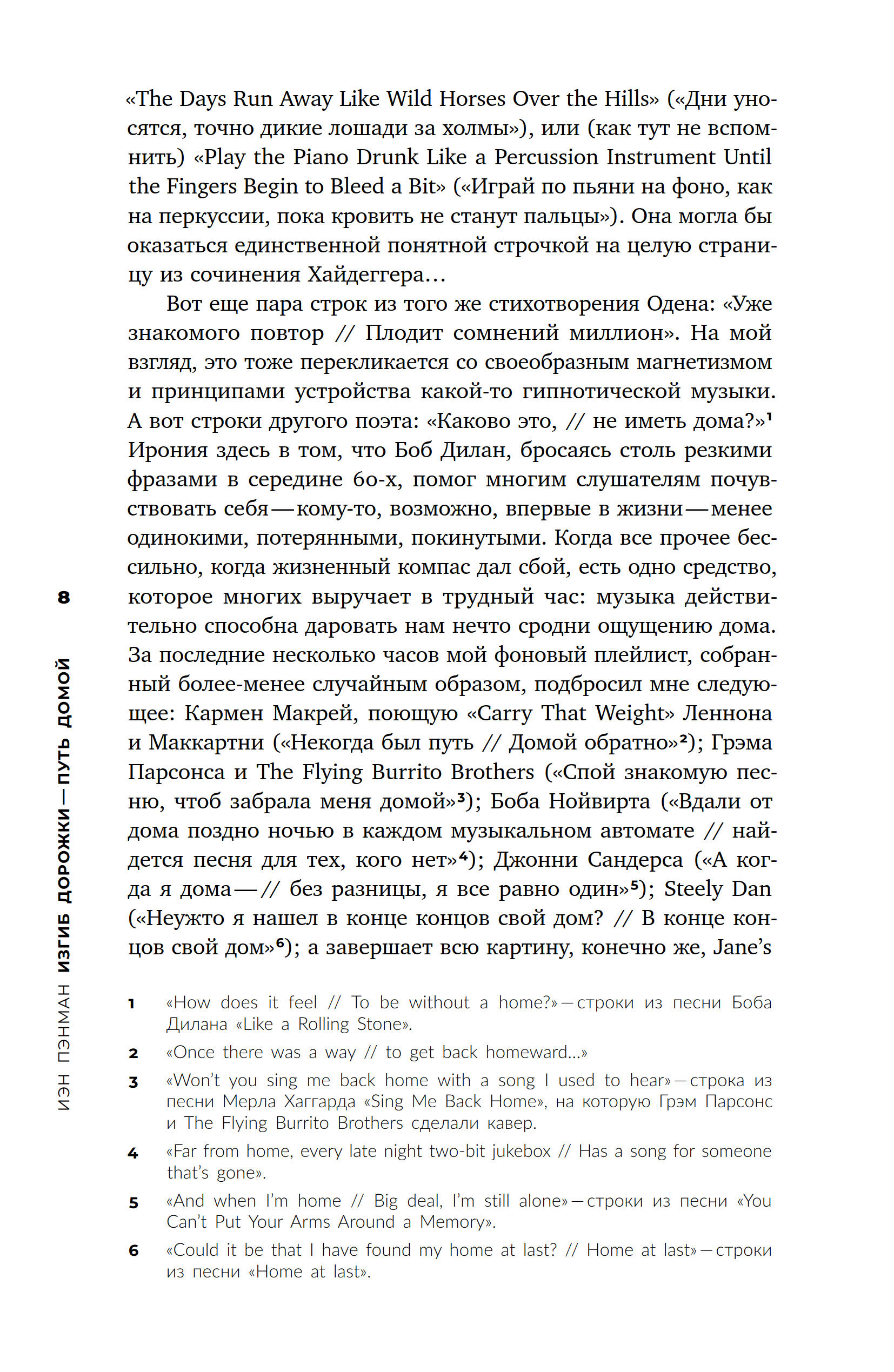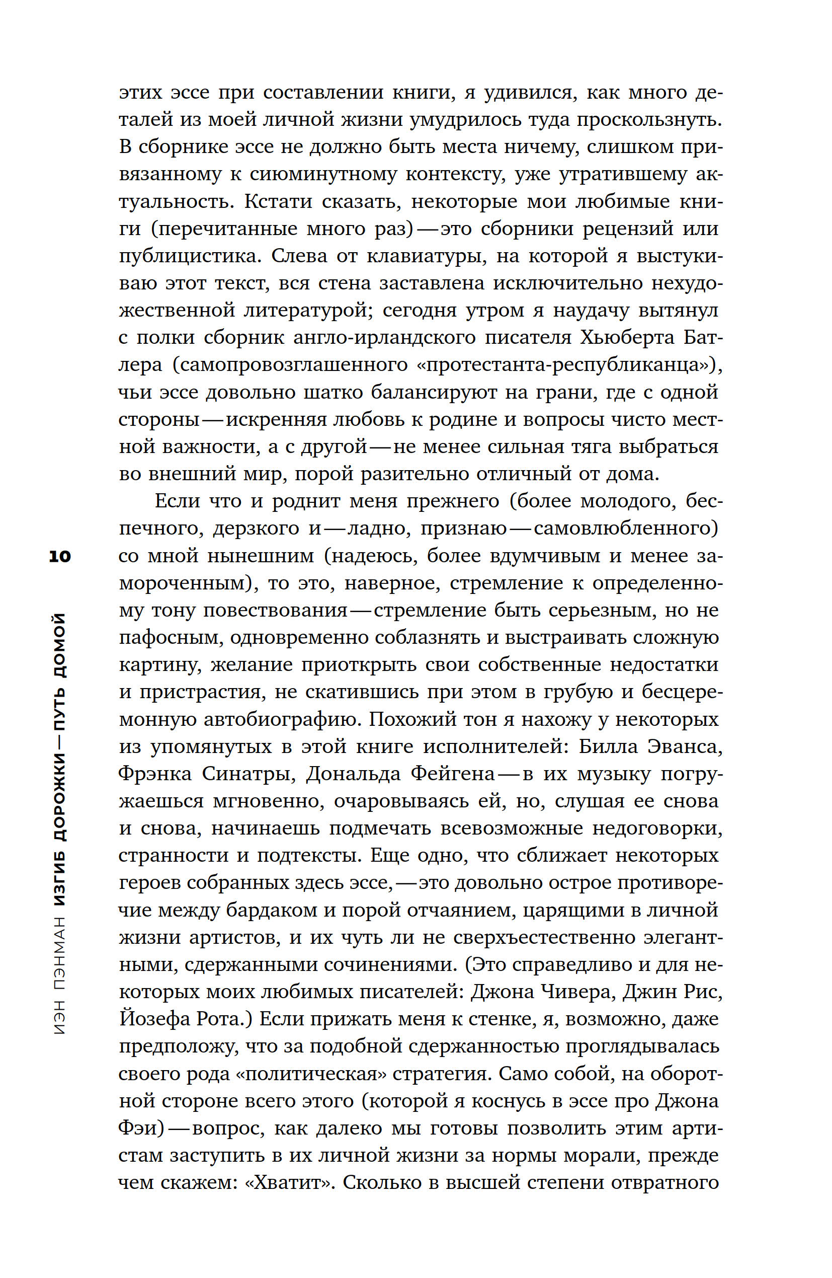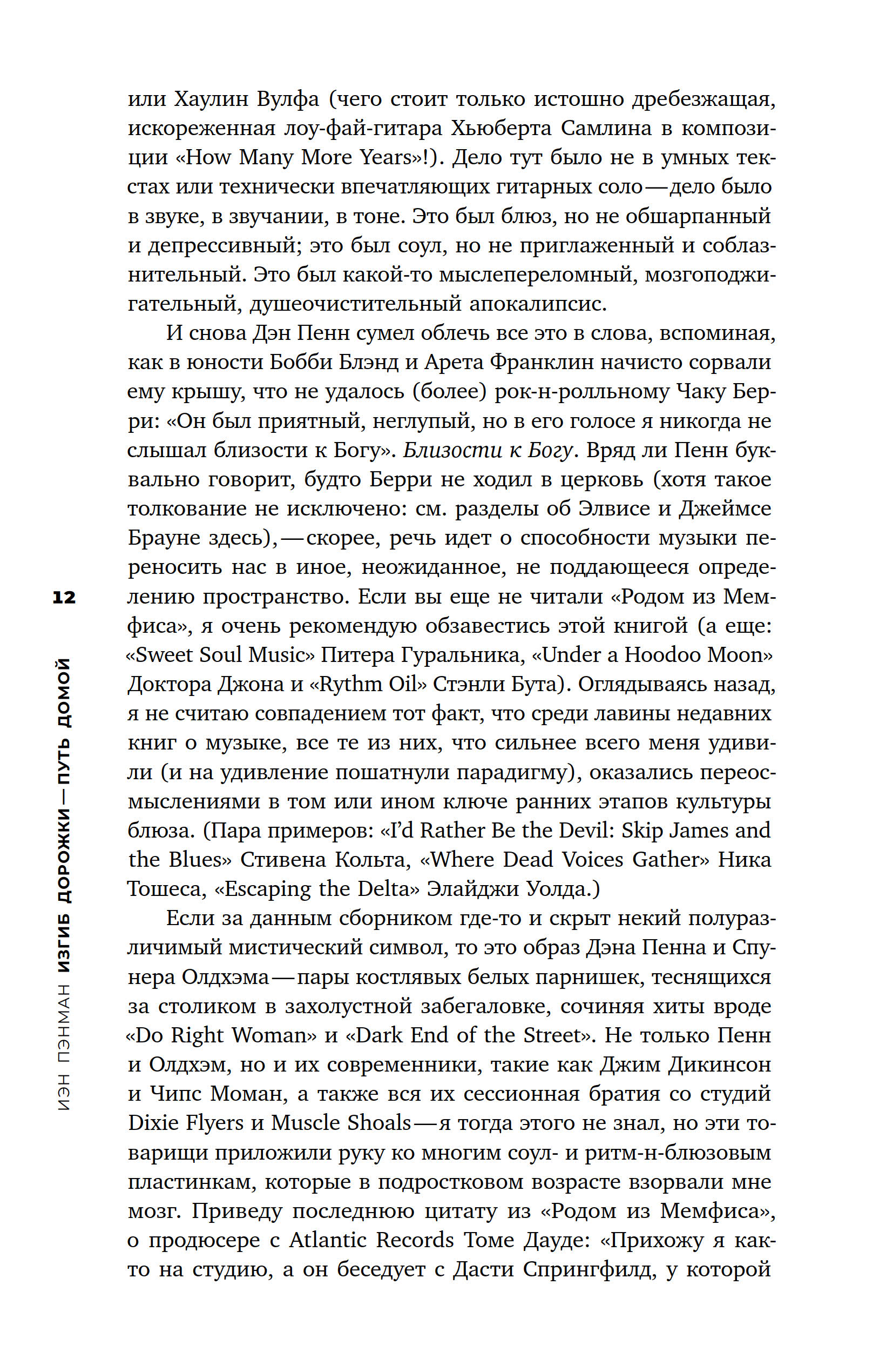 Книга классика британской музыкальной журналистики Иэна Пэнмана «Изгиб дорожки — путь домой» — это сборник виртуозных эссе о ряде фигур, оказавших влияние на историю поп-музыки: Чарли Паркере, Джеймсе Брауне, Фрэнке Синатре, Принсе и др. Кажущийся сначала произвольным и фрагментарным выбор при более пристальном рассмотрении позволяет обнаружить ключевую тему сборника — рецепцию и место афроамериканской традиции в рамках западноевропейской популярной культуры. Вынесенная в заглавие строка из стихотворения Уистена Хью Одена подсказывает лейтмотив этих текстов — поиск дома, который существует как неуловимое эхо и отзвук любимых композиций. Эссеистика Пэнмана ностальгична в буквальном смысле этого слова: именно бездомность, понятая через призму быта, гендера, искусства, социума, политики, истории и религии, объединяет всех героев его книги. Тем не менее письмо Пэнмана далеко от заунывных ламентаций по безвозвратно ушедшей эпохе. Британский критик бескомпромиссно препарирует не только биографии и творчество культовых музыкантов, но и механизмы западноевропейской поп-культуры как таковой. В результате перед нами одна из самых ярких книг о любви: любви, полной противоречий и изъянов, любви к поп-музыке — возможно, главному событию в истории культуры второй половины XX века.