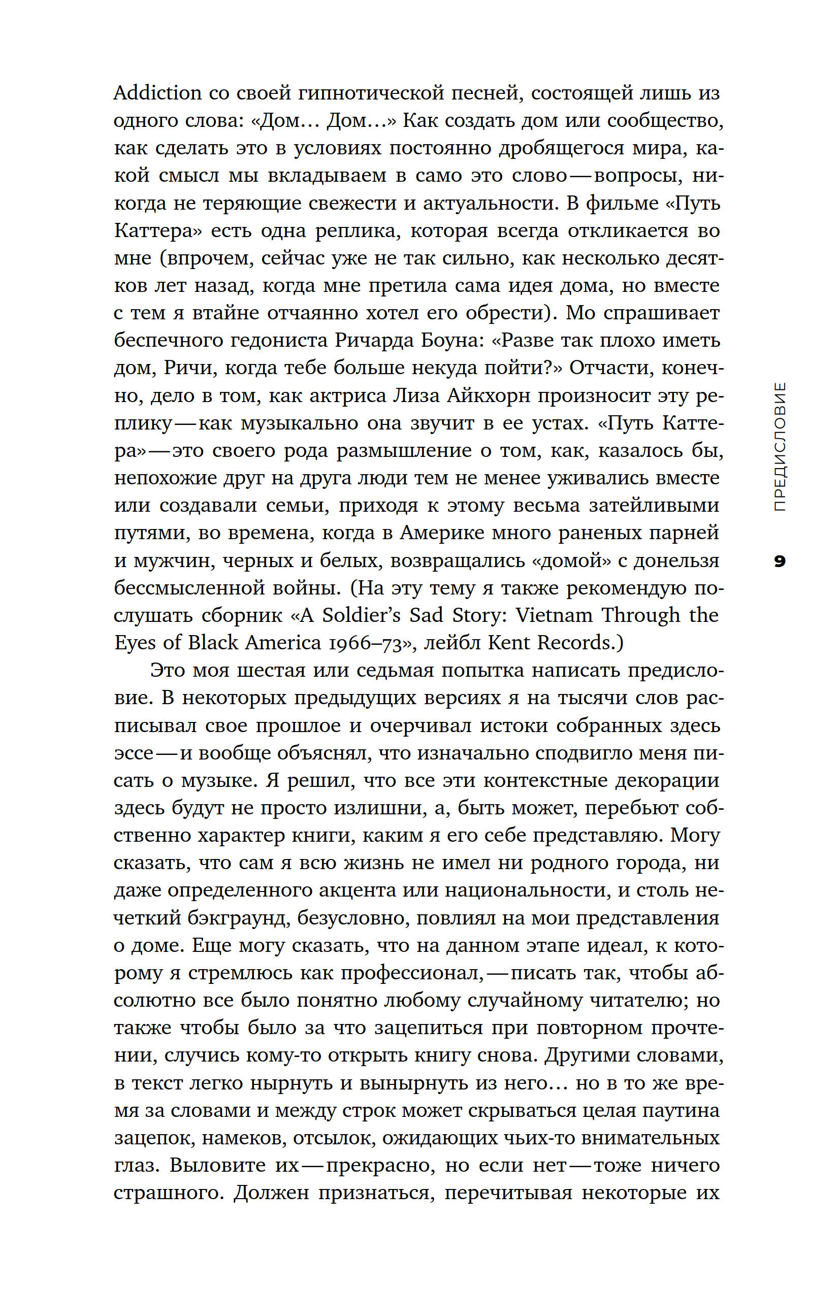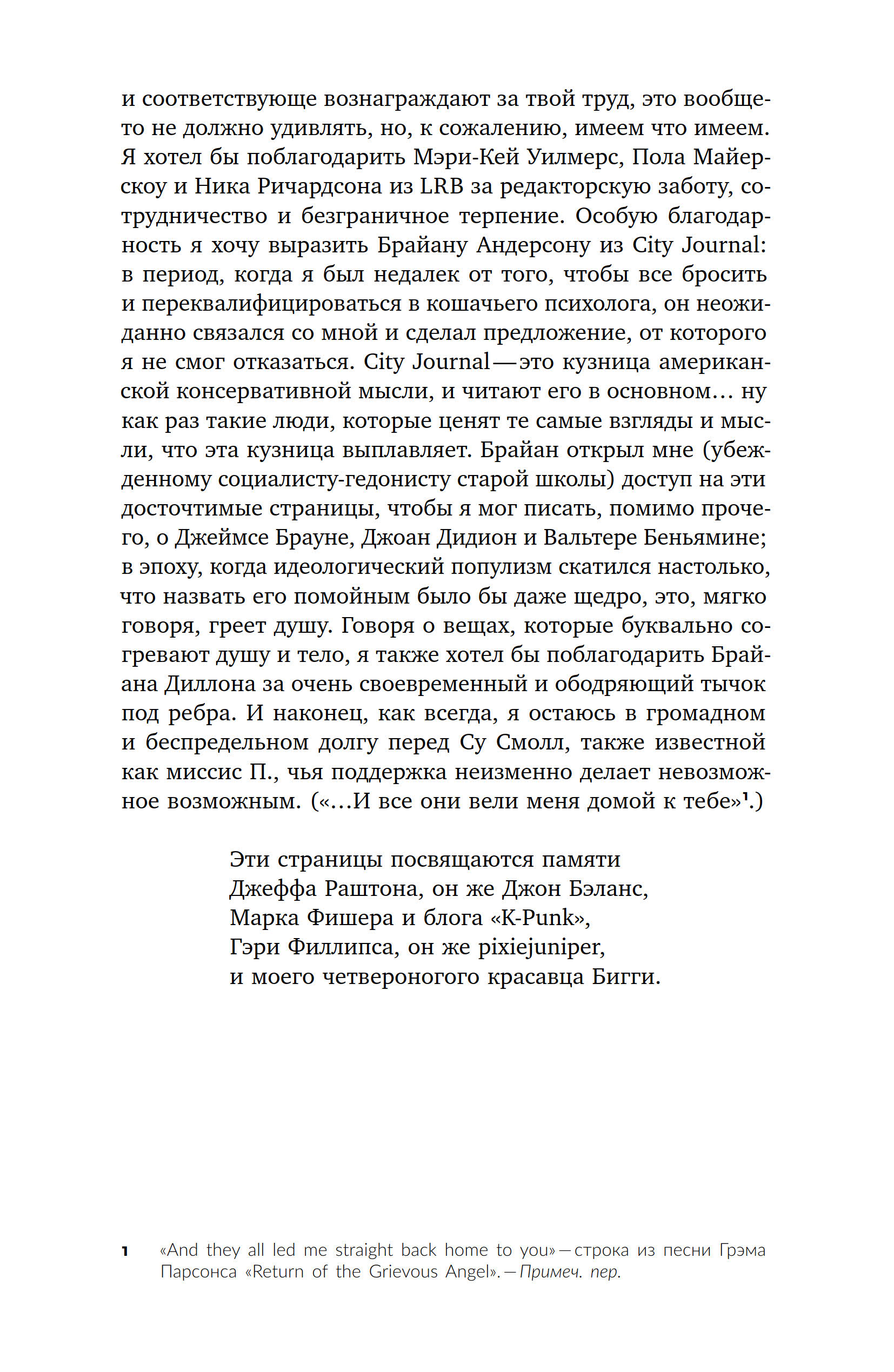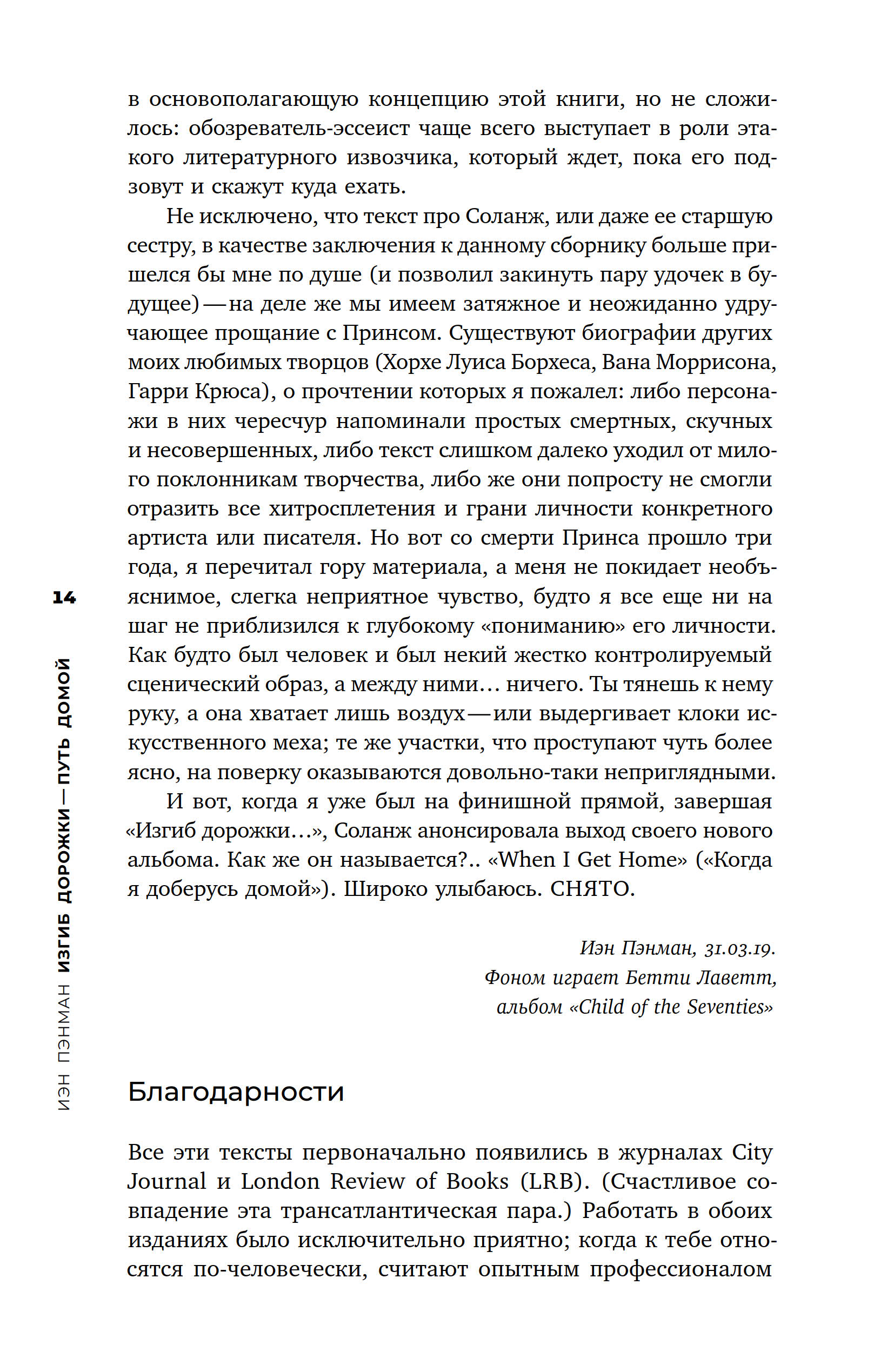 Книга классика британской музыкальной журналистики Иэна Пэнмана «Изгиб дорожки — путь домой» — это сборник виртуозных эссе о ряде фигур, оказавших влияние на историю поп-музыки: Чарли Паркере, Джеймсе Брауне, Фрэнке Синатре, Принсе и др. Кажущийся сначала произвольным и фрагментарным выбор при более пристальном рассмотрении позволяет обнаружить ключевую тему сборника — рецепцию и место афроамериканской традиции в рамках западноевропейской популярной культуры. Вынесенная в заглавие строка из стихотворения Уистена Хью Одена подсказывает лейтмотив этих текстов — поиск дома, который существует как неуловимое эхо и отзвук любимых композиций. Эссеистика Пэнмана ностальгична в буквальном смысле этого слова: именно бездомность, понятая через призму быта, гендера, искусства, социума, политики, истории и религии, объединяет всех героев его книги. Тем не менее письмо Пэнмана далеко от заунывных ламентаций по безвозвратно ушедшей эпохе. Британский критик бескомпромиссно препарирует не только биографии и творчество культовых музыкантов, но и механизмы западноевропейской поп-культуры как таковой. В результате перед нами одна из самых ярких книг о любви: любви, полной противоречий и изъянов, любви к поп-музыке — возможно, главному событию в истории культуры второй половины XX века.