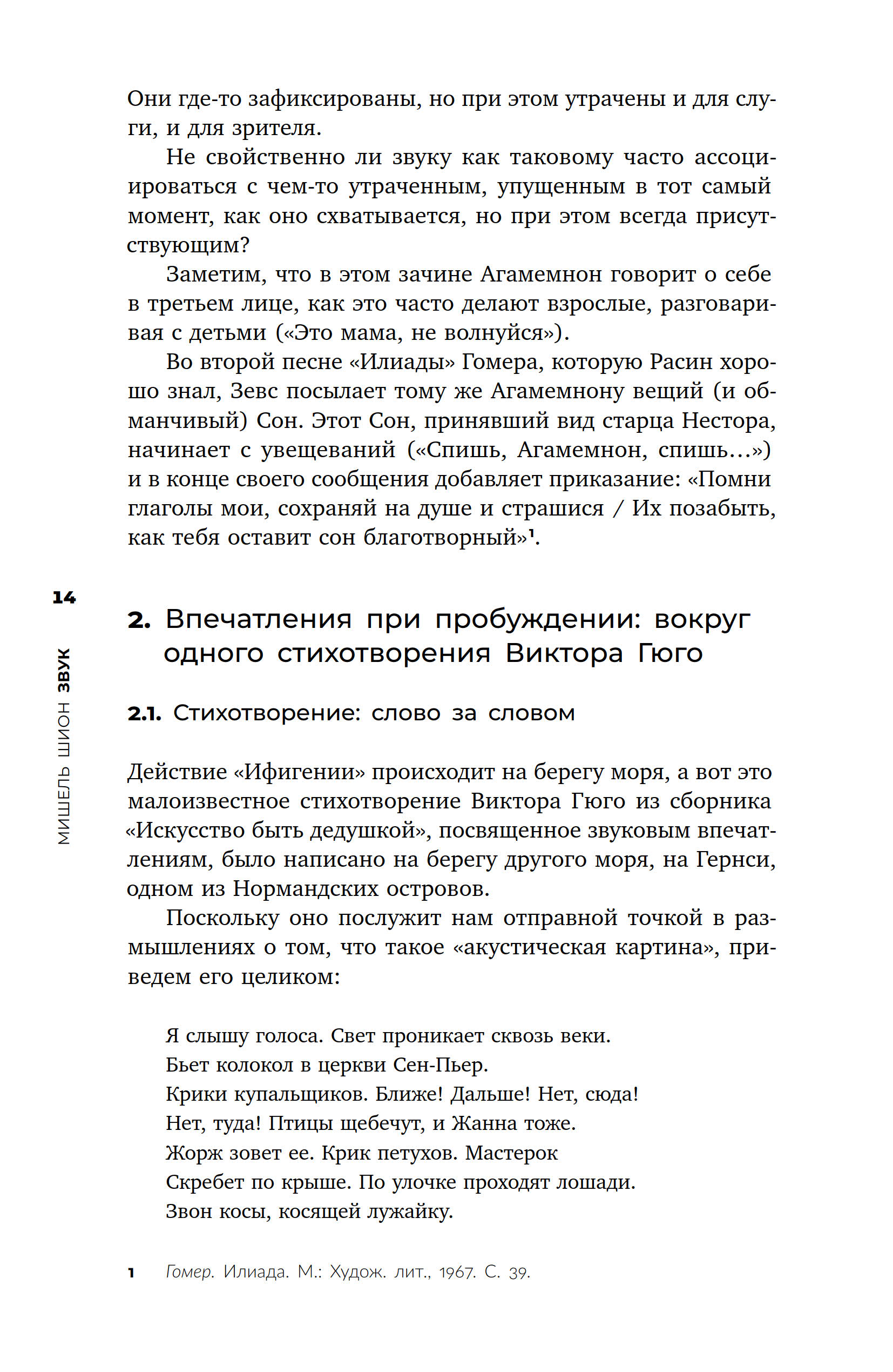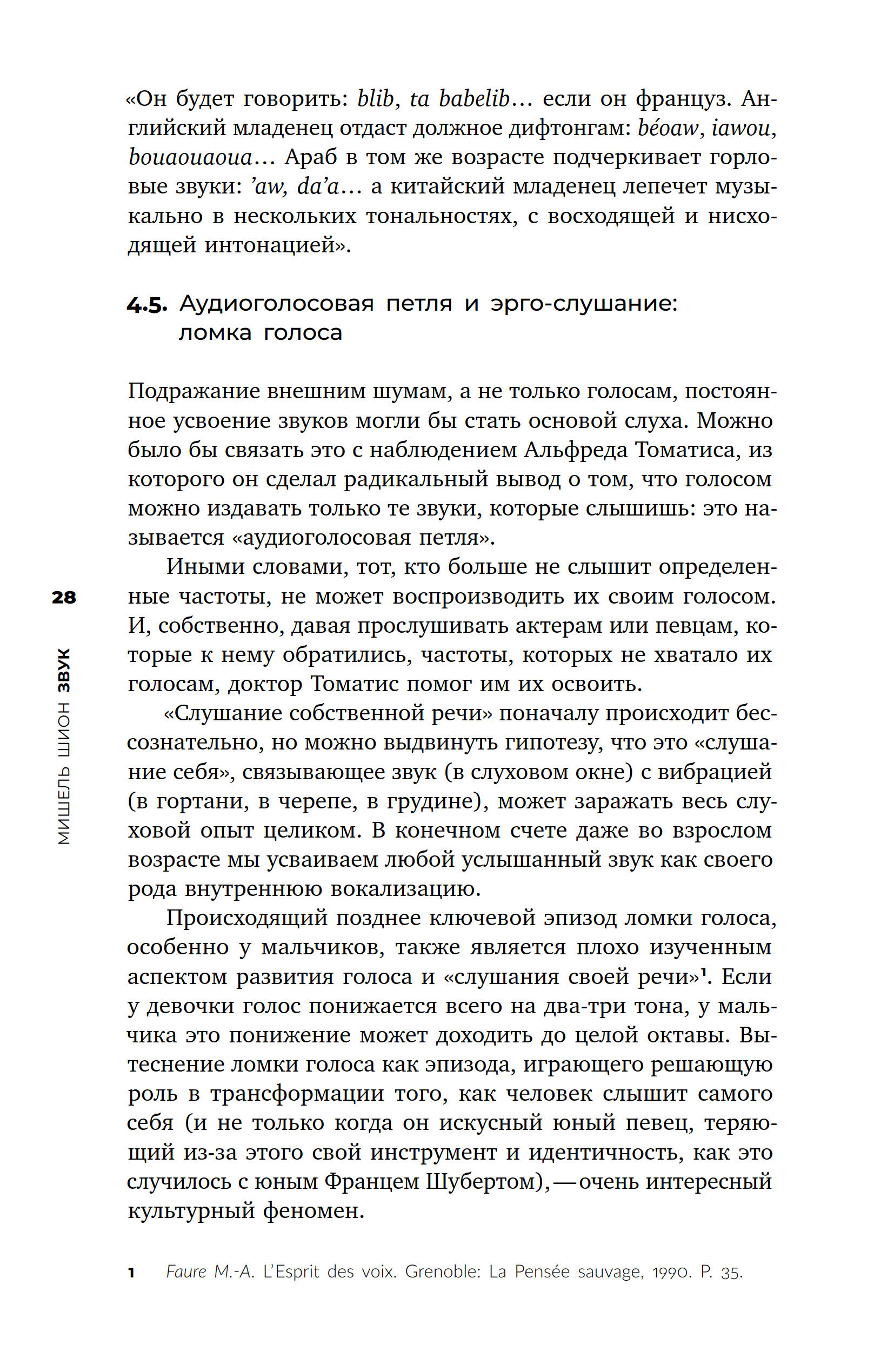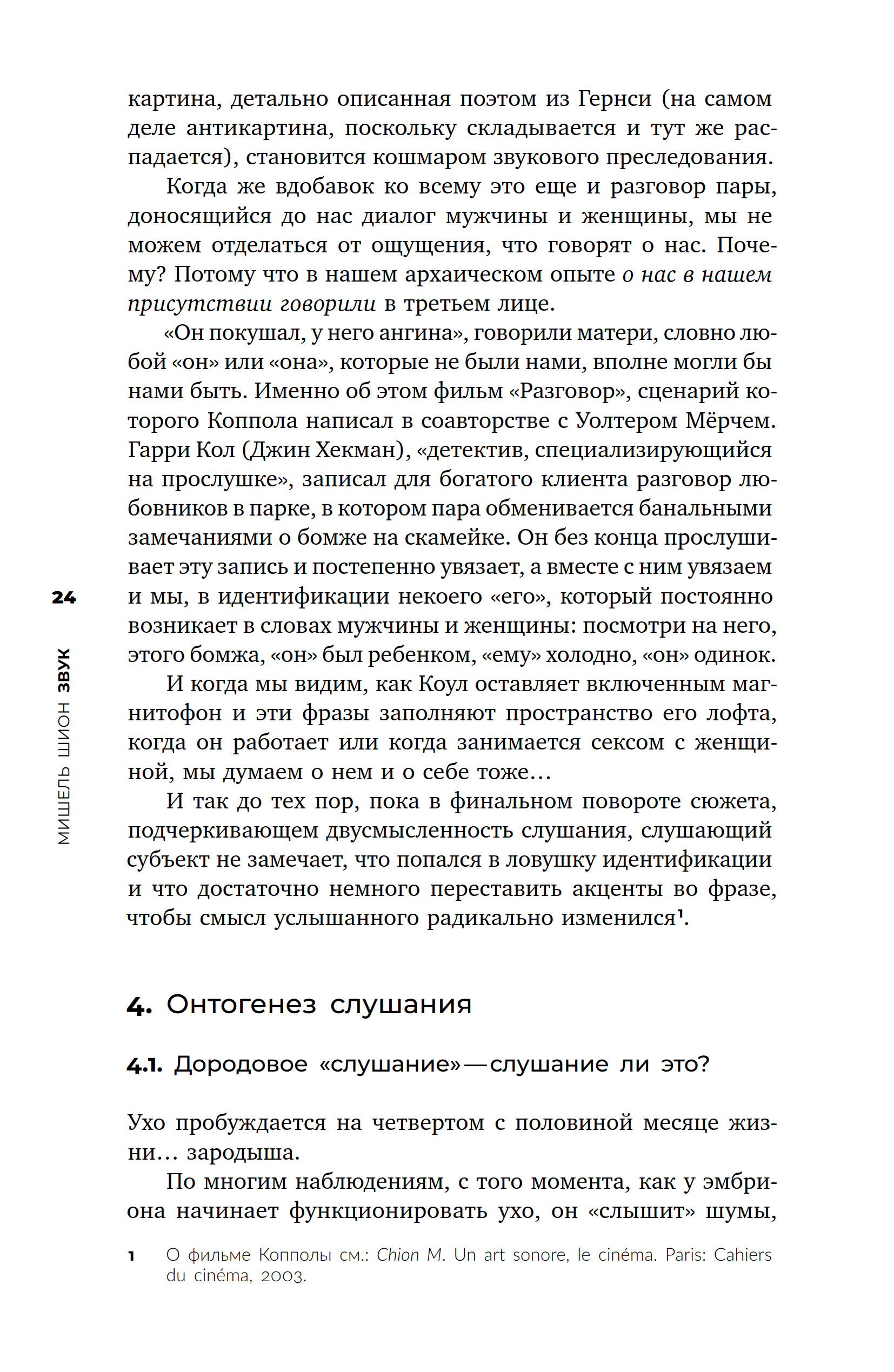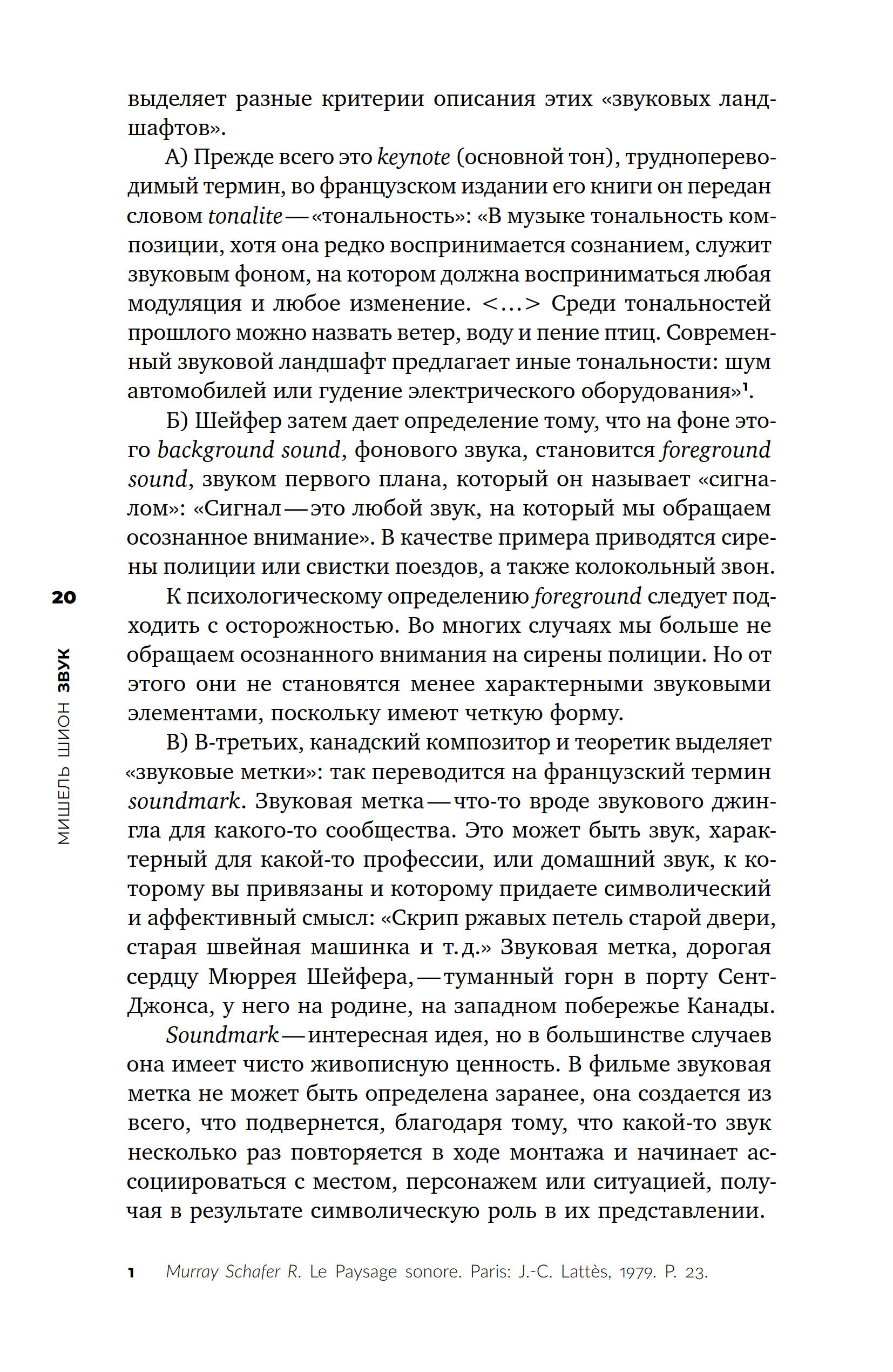 Эту работу по праву можно назвать введением в методологию звуковых исследований. Мишель Шион — теоретик кино и звука, последователь композитора Пьера Шеффера, один из первых исследователей звуковой фактуры в кино. Ему принадлежит ряд важнейших работ о Кубрике, Линче и Тати. Предметом этой книги выступает не музыка, не саундтреки фильмов или иные формы обособления аудиального, но звук как таковой. Шион последовательно анализирует разные подходы к изучению звука, поэтому в фокусе его внимания в равной степени оказываются акустика, лингвистика, психология, искусствоведение, феноменология. Работа содержит массу оригинальных выводов, нередко сформированных в полемике с другими исследователями. Обширная эрудиция автора, интерес к современным технологиям и особый дар внимательного вслушивания привлекают к этой книге внимание читателей, интересующихся окружающими нас гармониями и шумами.