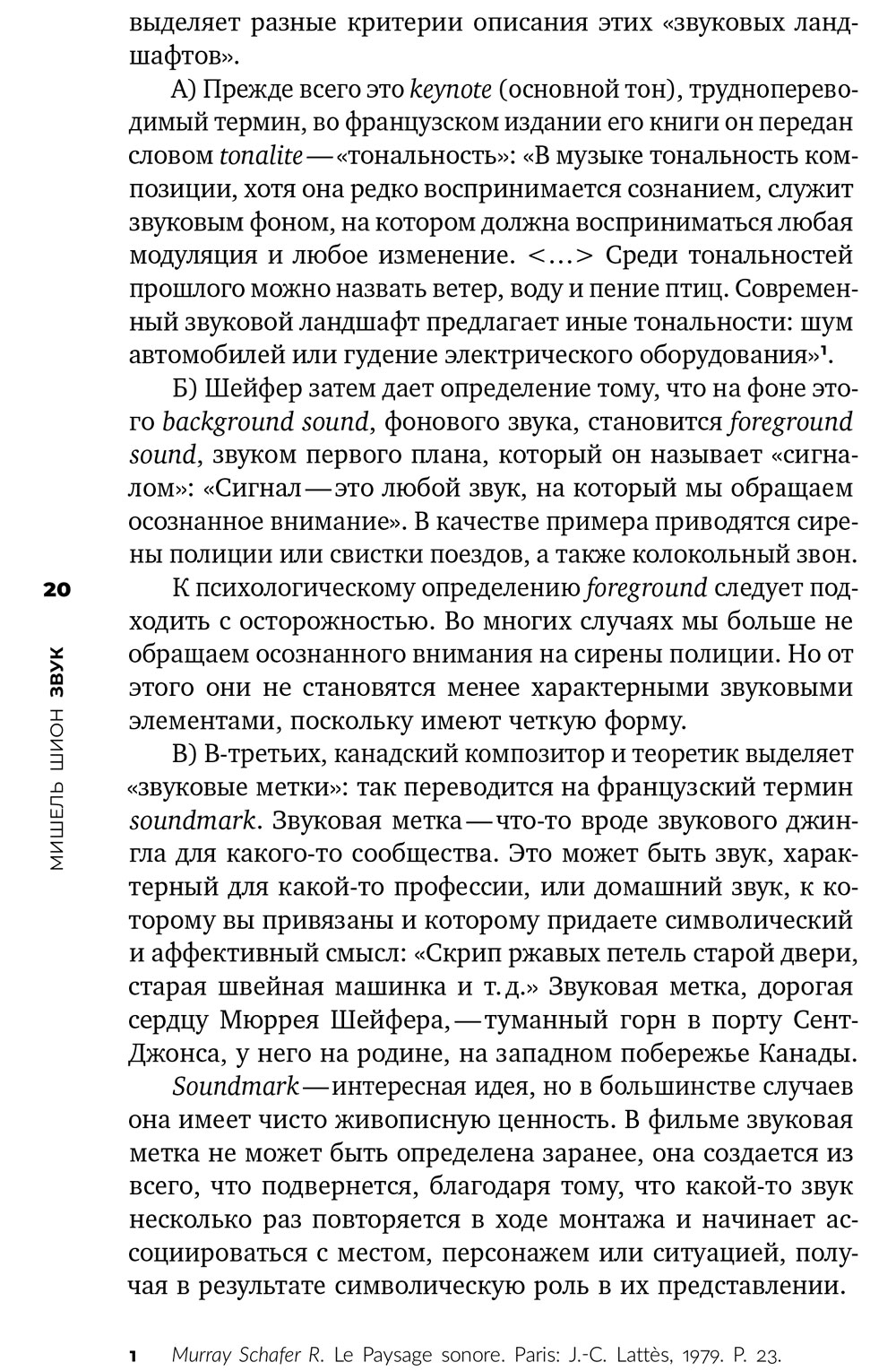 Эту работу по праву можно назвать введением в методологию звуковых исследований. Мишель Шион — теоретик кино и звука, последователь композитора Пьера Шеффера, один из первых исследователей звуковой фактуры в кино. Ему принадлежит ряд важнейших работ о Кубрике, Линче и Тати. Предметом этой книги выступает не музыка, не саундтреки фильмов или иные формы обособления аудиального, но звук как таковой. Шион последовательно анализирует разные подходы к изучению звука, поэтому в фокусе его внимания в равной степени оказываются акустика, лингвистика, психология, искусствоведение, феноменология. Работа содержит массу оригинальных выводов, нередко сформированных в полемике с другими исследователями. Обширная эрудиция автора, интерес к современным технологиям и особый дар внимательного вслушивания привлекают к этой книге внимание читателей, интересующихся окружающими нас гармониями и шумами.