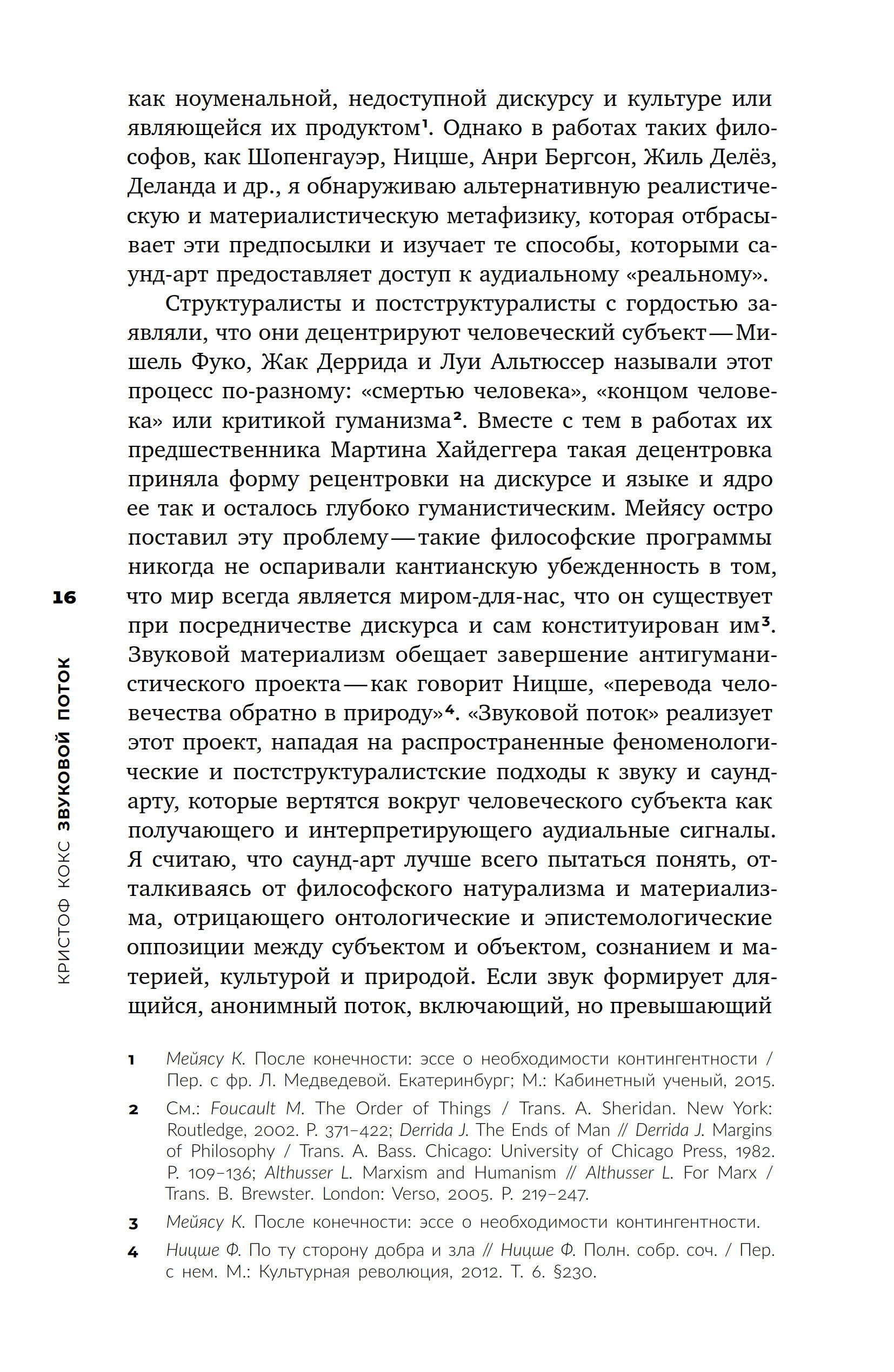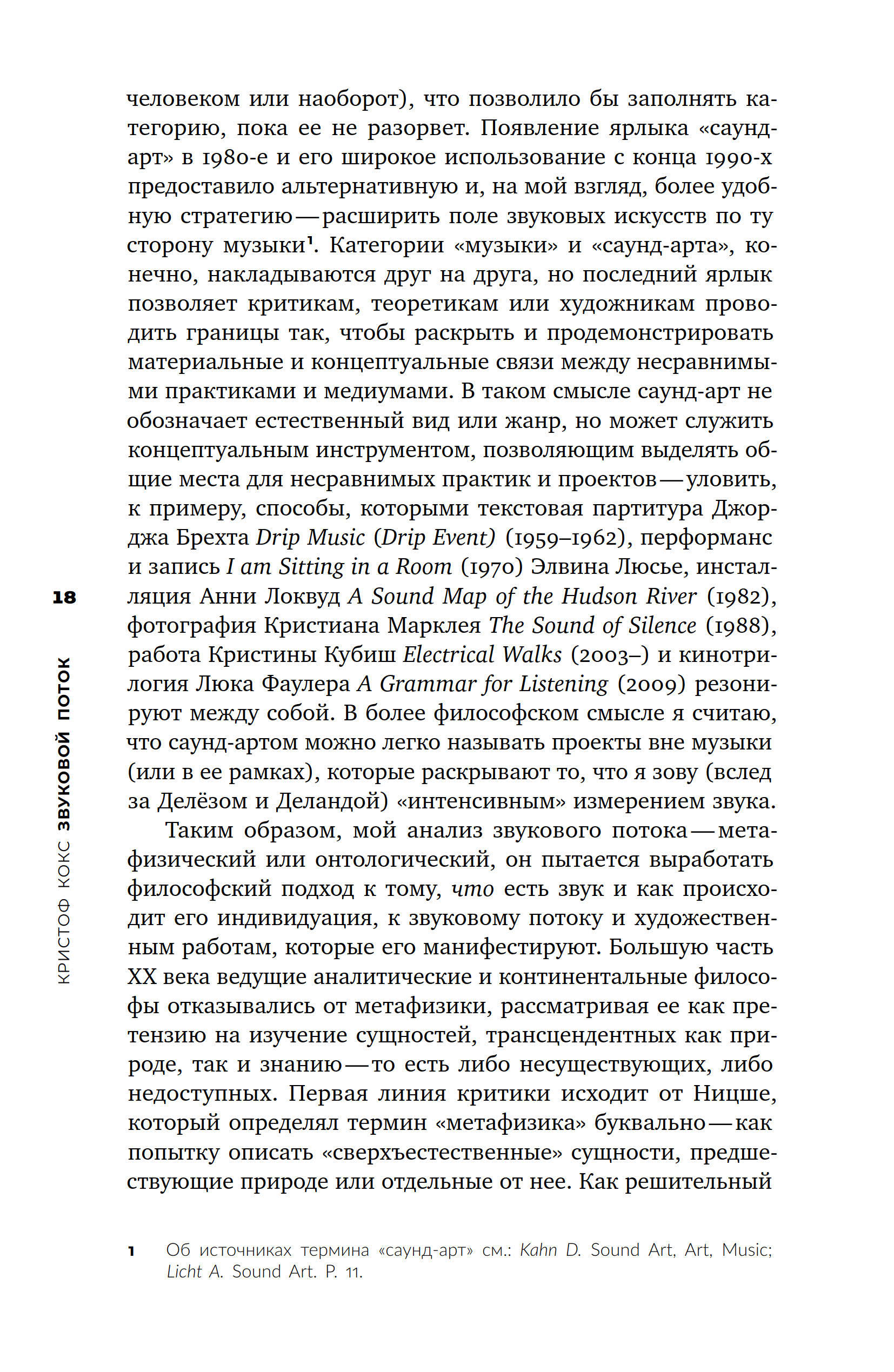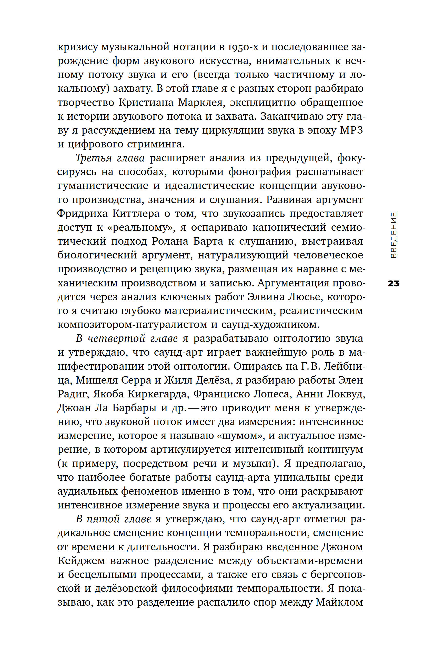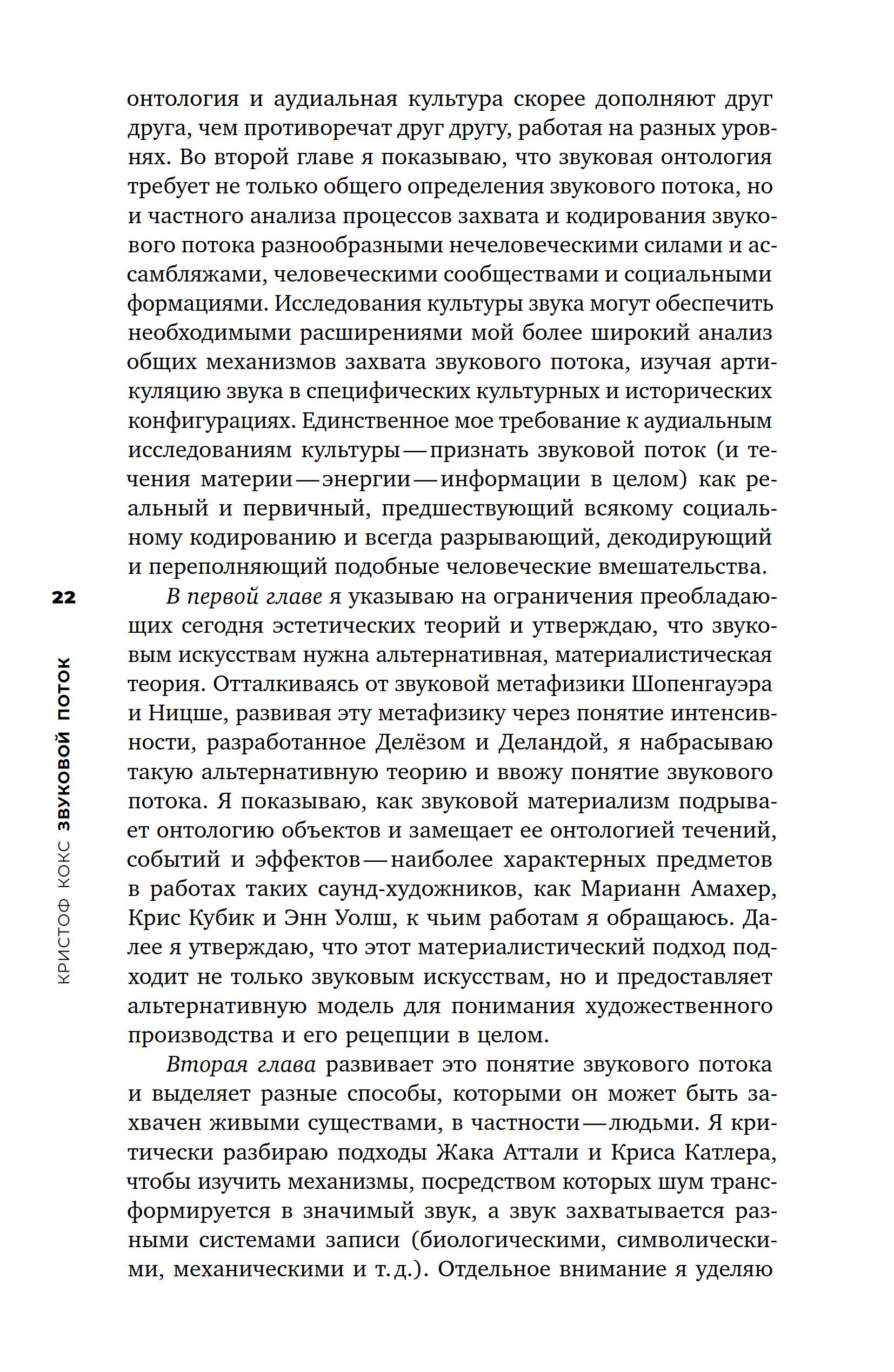 Последние десятилетия мы наблюдаем в современной культуре смещение «от музыки к звуку», поскольку термин «музыка» уже не соответствует стремительному развитию новых художественных жанров и культурных установок. В результате такого смещения, с одной стороны, произошло бурное развитие саунд-арта, а с другой — расцвет Sound Studies в гуманитарных науках. Задача книги Кристофа Кокса — объяснить «звуковой поворот» в искусстве и культуре, а также показать, как звук вторгается на территорию философии и обновляет ее. Решая эту задачу, автор оспаривает магистральные концепции современной культурной теории, основанные на анализе дискурса и языка, и заявляет о необходимости новой материалистической эстетики не только звука, но и искусства вообще. Центральным для книги становится концепт звукового потока — анонимной материалистической силы, которая предшествует человеку и превосходит его субъективный опыт. В попытке выстроить реалистическую и натуралистическую модель описания звука, Кокс обращается к идеям Артура Шопенгауэра, Фридриха Ницше, Жиля Делеза и Мануэля Деланды, иллюстрируя их работами Ла Монте Янга, Элвина Люсье, Кристиана Марклея, Марианн Амахер, Анни Локвуд и многих других. В итоге перед нами не только одно из наиболее фундаментальных и глубоких исследований онтологии звука, но и увлекательная история малоизученного звукового искусства последних пятидесяти лет.