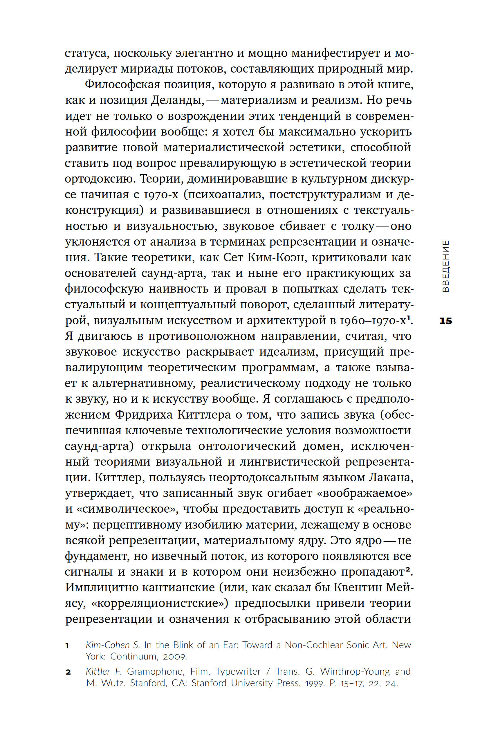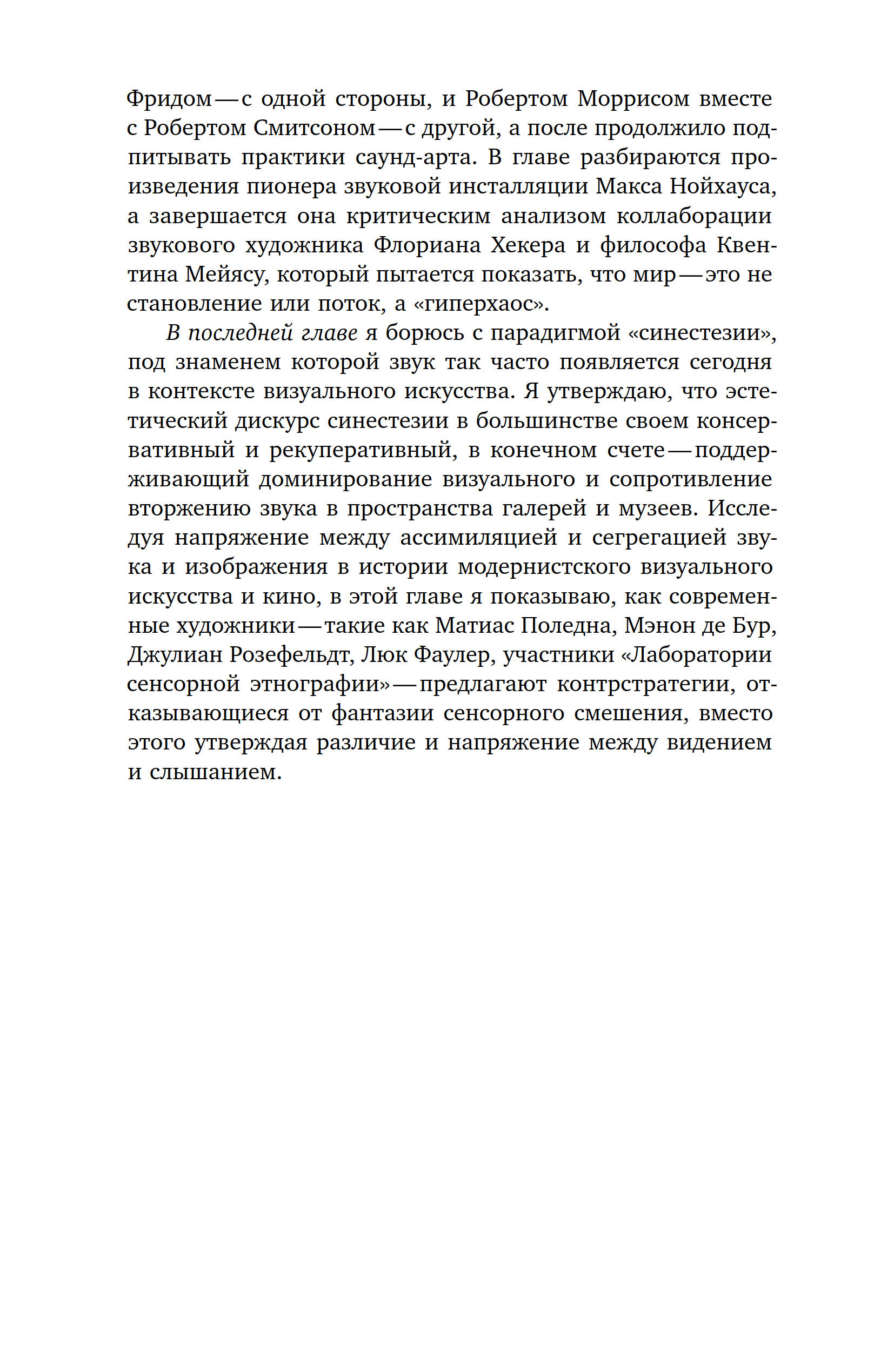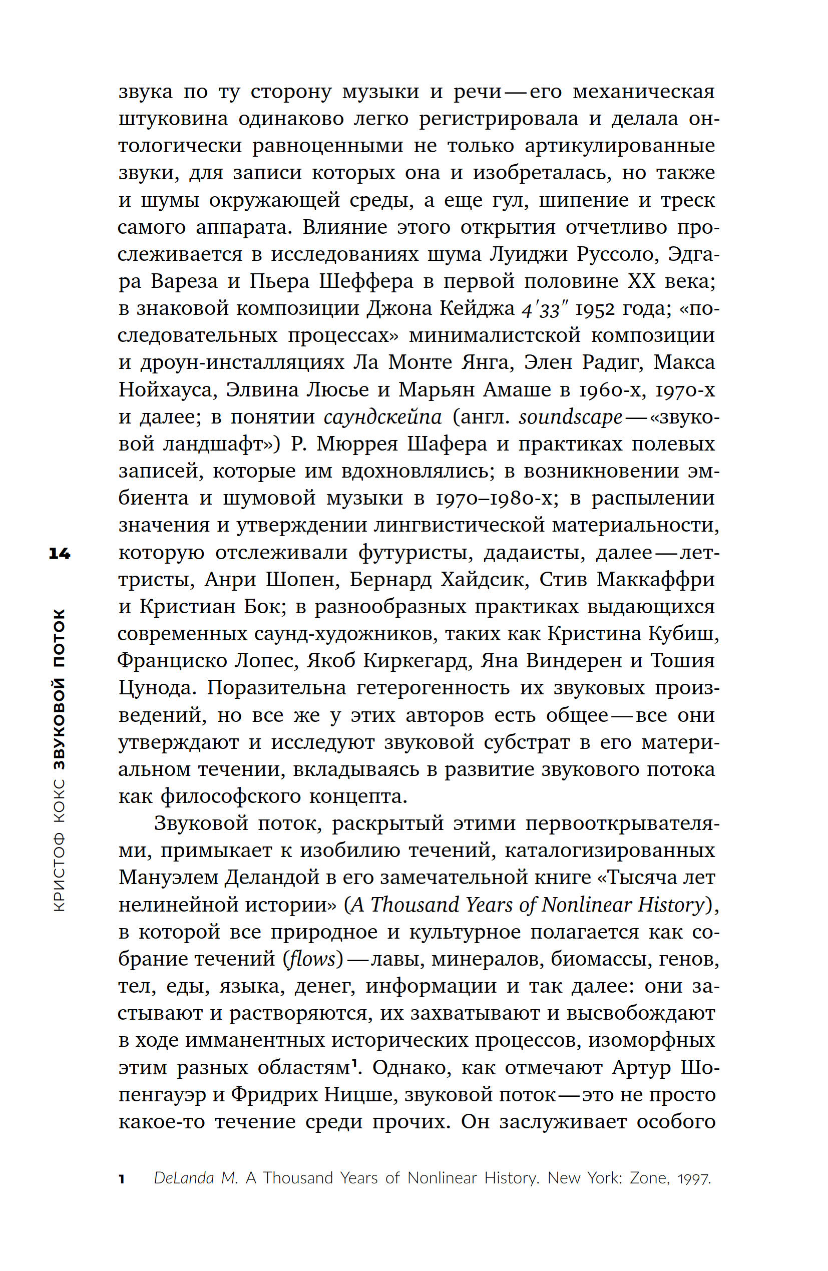 Последние десятилетия мы наблюдаем в современной культуре смещение «от музыки к звуку», поскольку термин «музыка» уже не соответствует стремительному развитию новых художественных жанров и культурных установок. В результате такого смещения, с одной стороны, произошло бурное развитие саунд-арта, а с другой — расцвет Sound Studies в гуманитарных науках. Задача книги Кристофа Кокса — объяснить «звуковой поворот» в искусстве и культуре, а также показать, как звук вторгается на территорию философии и обновляет ее. Решая эту задачу, автор оспаривает магистральные концепции современной культурной теории, основанные на анализе дискурса и языка, и заявляет о необходимости новой материалистической эстетики не только звука, но и искусства вообще. Центральным для книги становится концепт звукового потока — анонимной материалистической силы, которая предшествует человеку и превосходит его субъективный опыт. В попытке выстроить реалистическую и натуралистическую модель описания звука, Кокс обращается к идеям Артура Шопенгауэра, Фридриха Ницше, Жиля Делеза и Мануэля Деланды, иллюстрируя их работами Ла Монте Янга, Элвина Люсье, Кристиана Марклея, Марианн Амахер, Анни Локвуд и многих других. В итоге перед нами не только одно из наиболее фундаментальных и глубоких исследований онтологии звука, но и увлекательная история малоизученного звукового искусства последних пятидесяти лет.