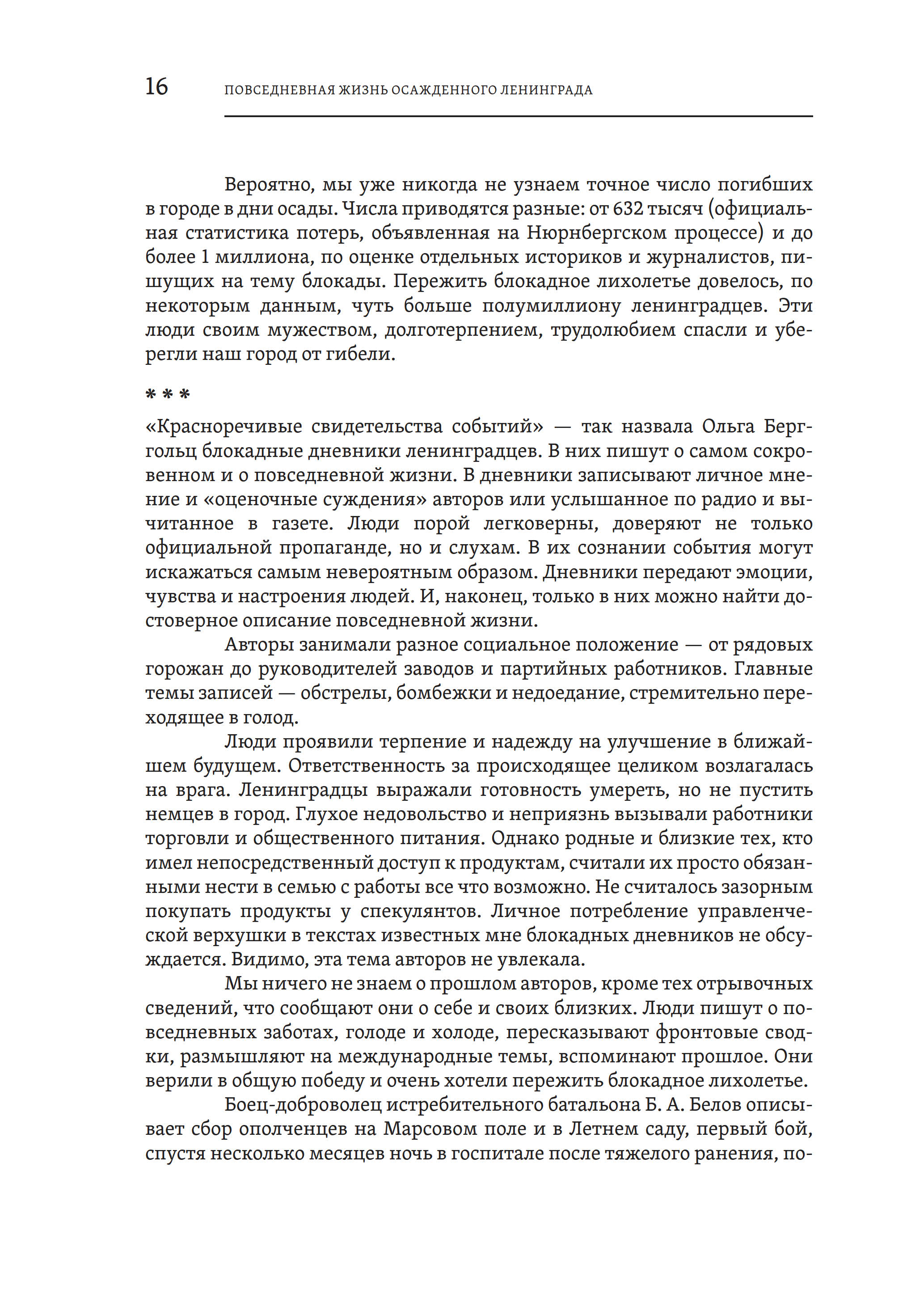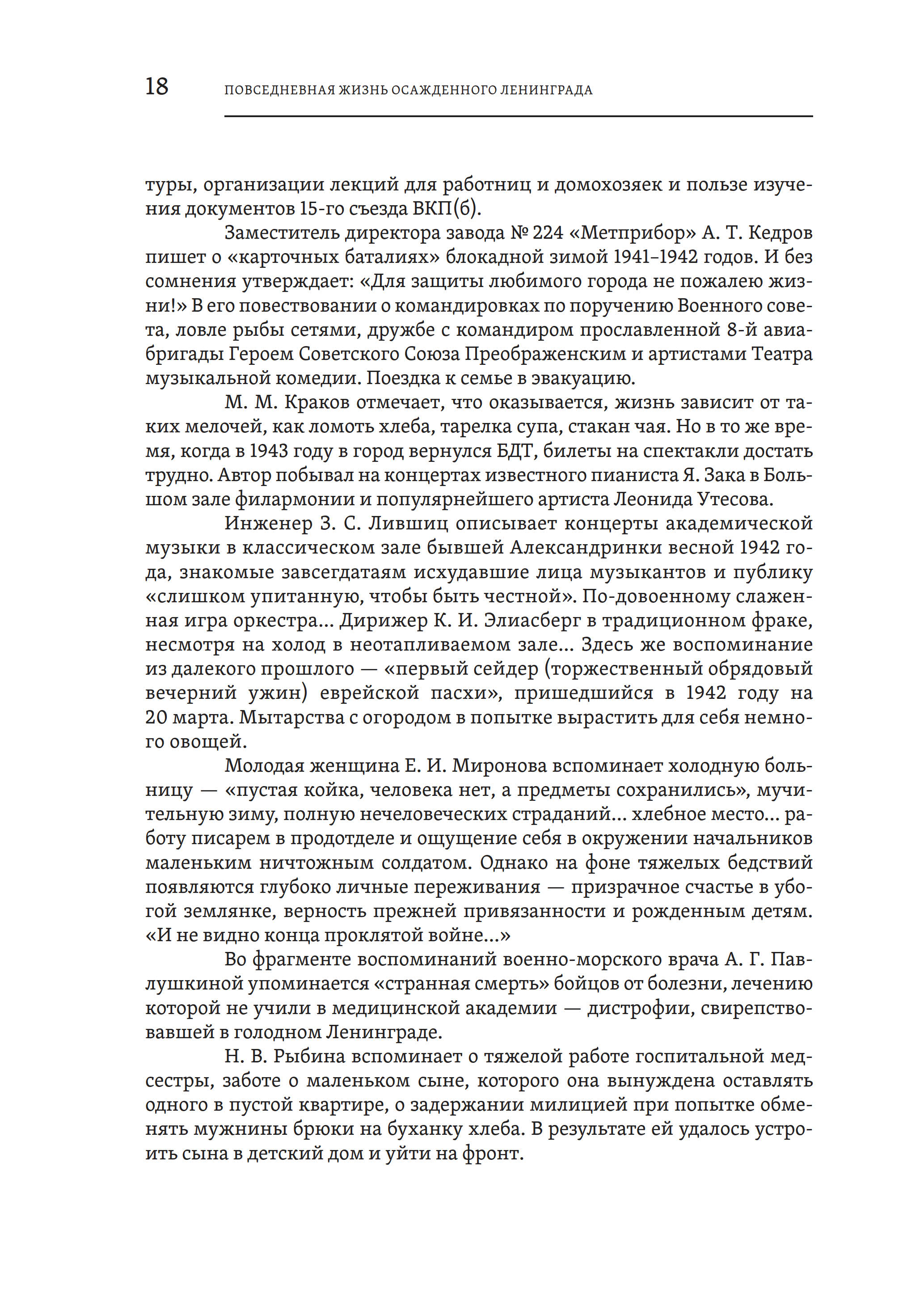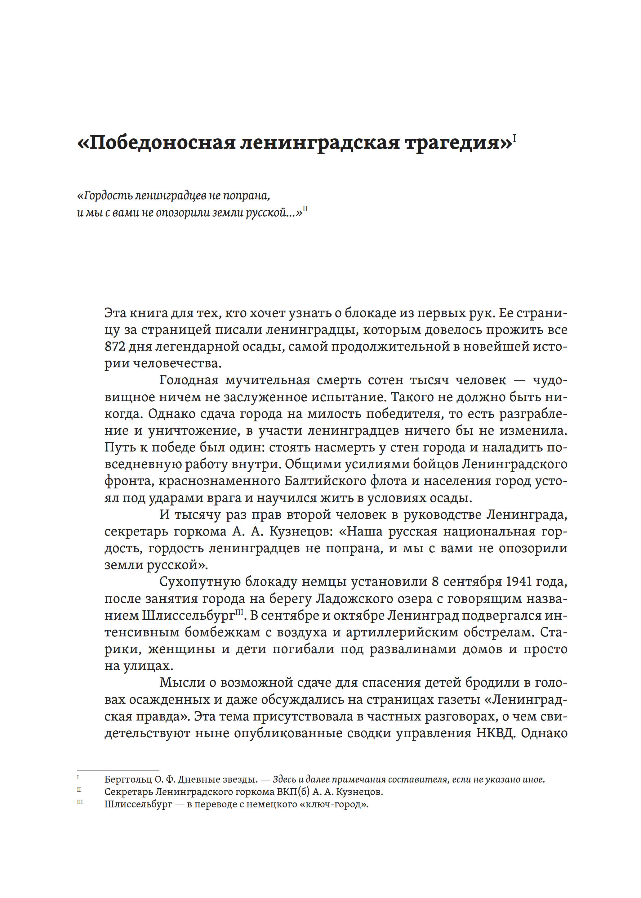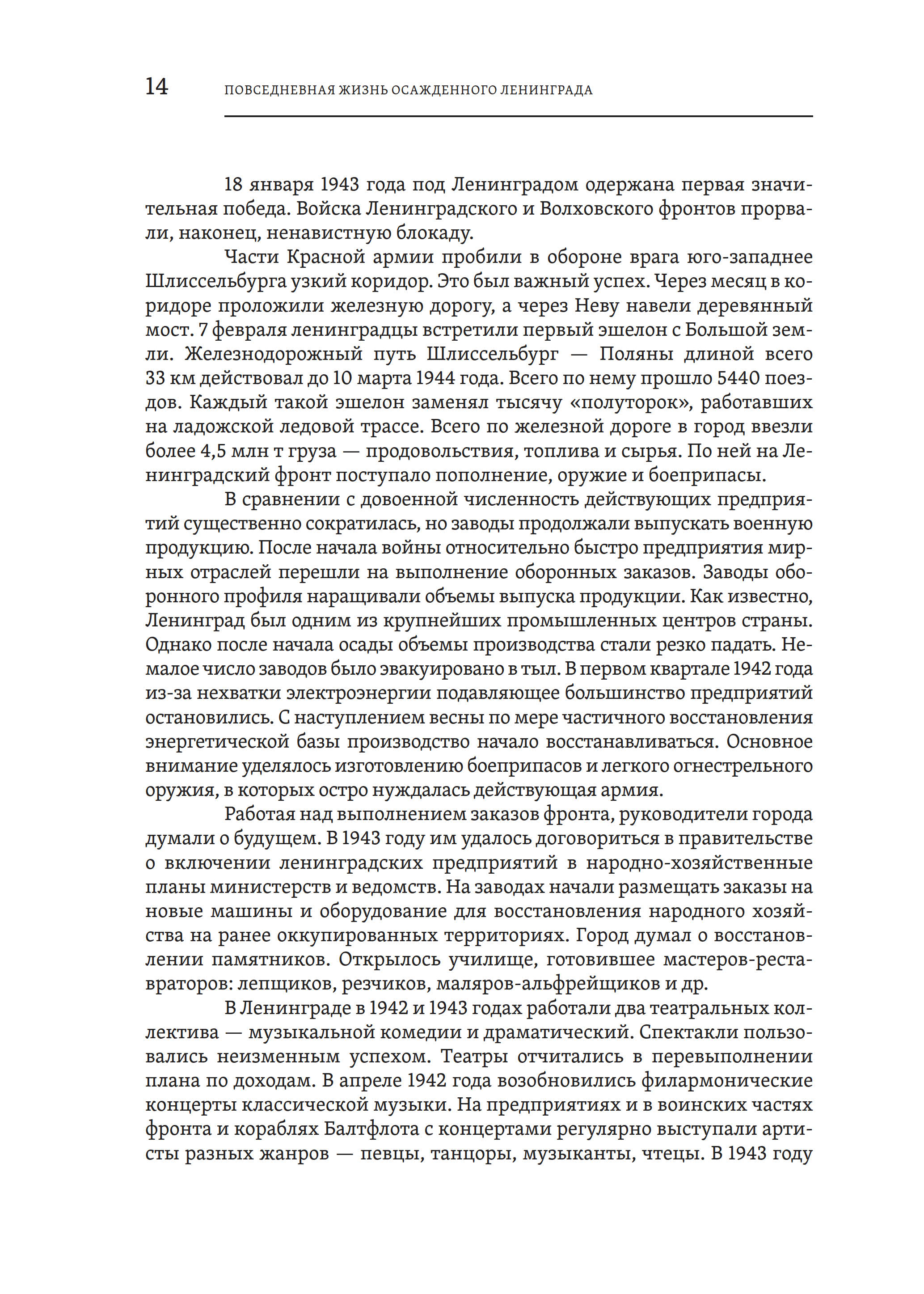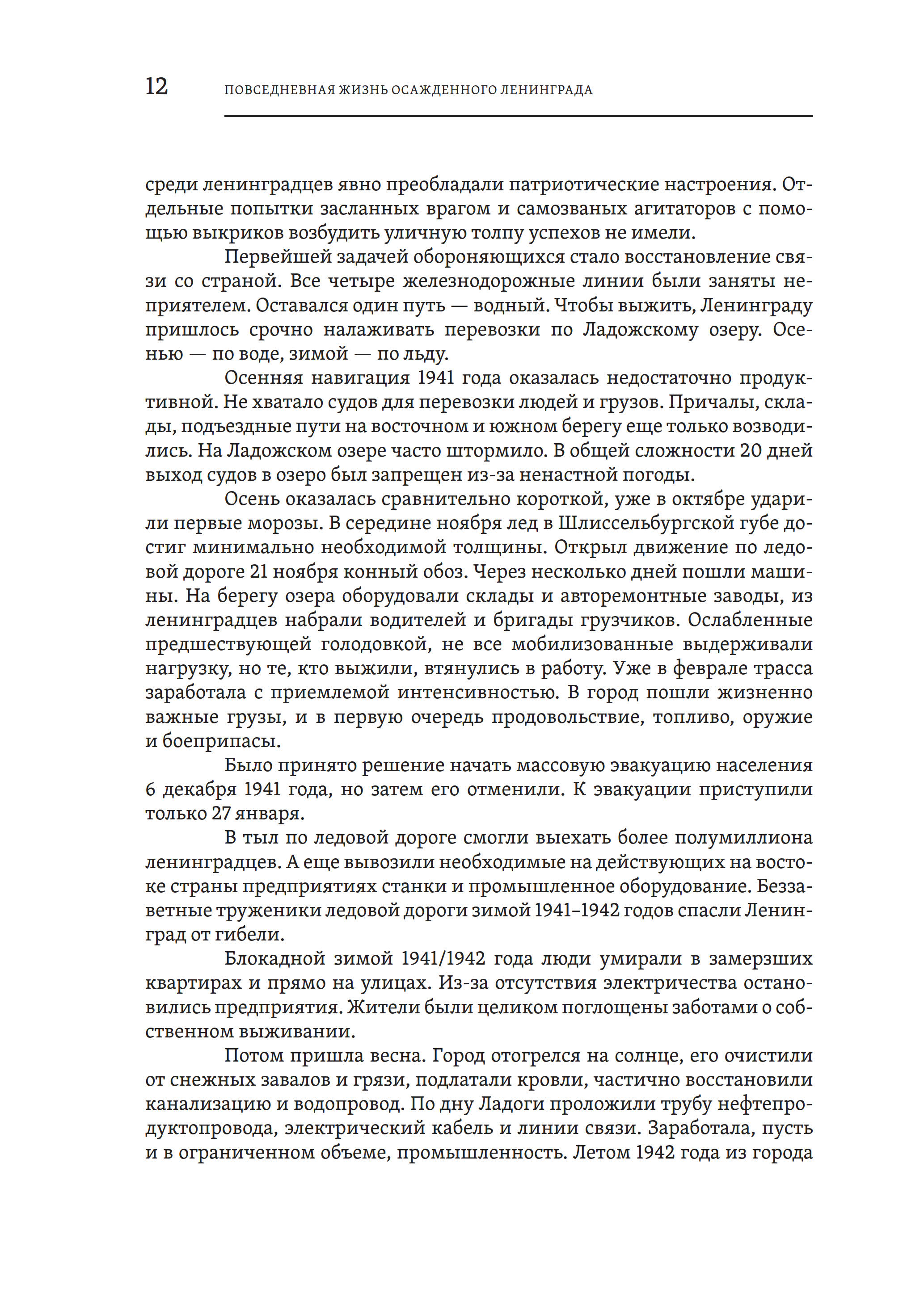 В представленном труде показана повседневная жизнь осажденного Ленинграда, блокада которого продлилась 872 дня. В письмах, дневниках и воспоминаниях ленинградцев воссоздается картина жизни города в условиях блокады: эвакуация, усилия властей и простых ленинградцев в борьбе с голодом и холодом, создание Дороги жизни по льду Ладожского