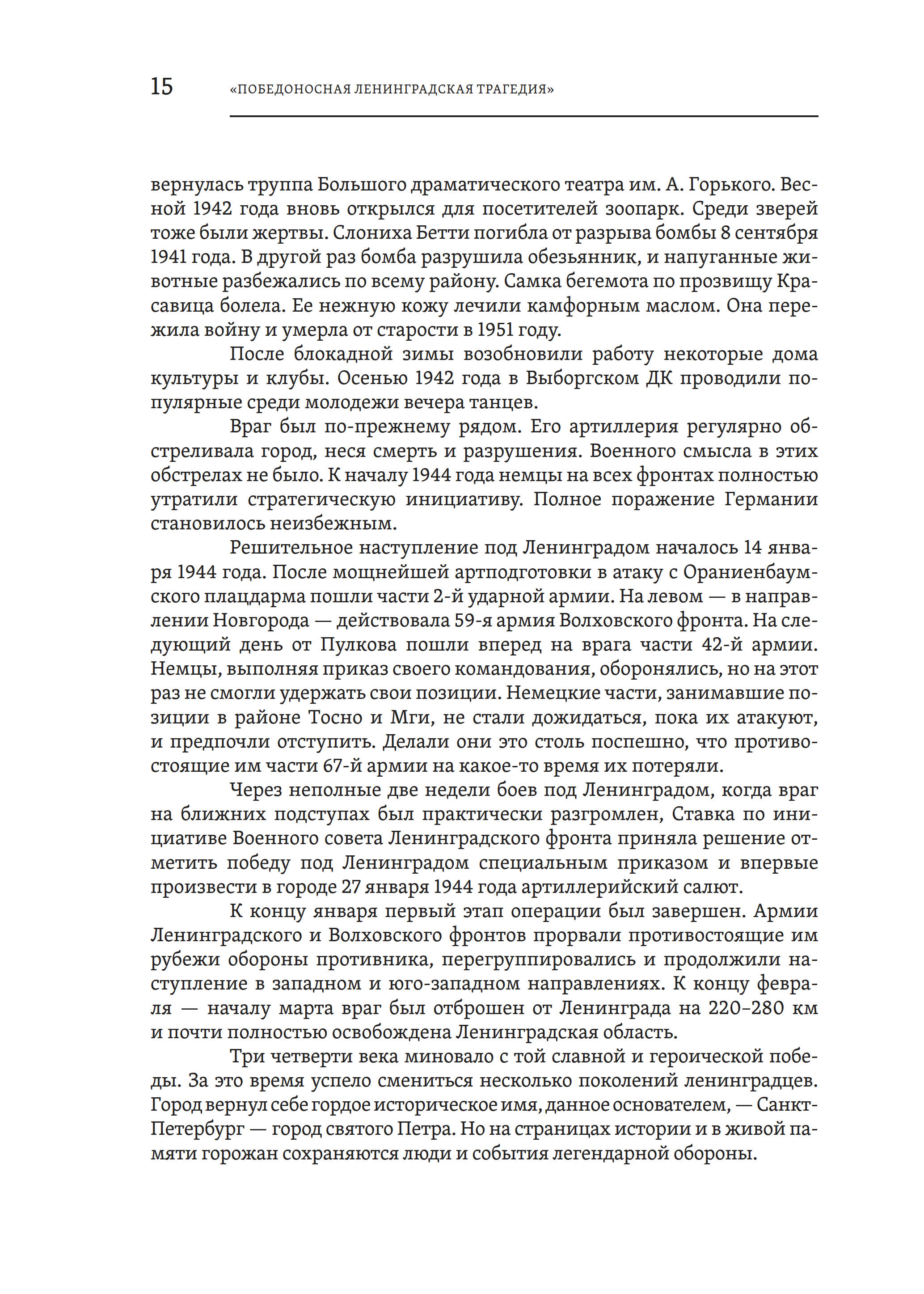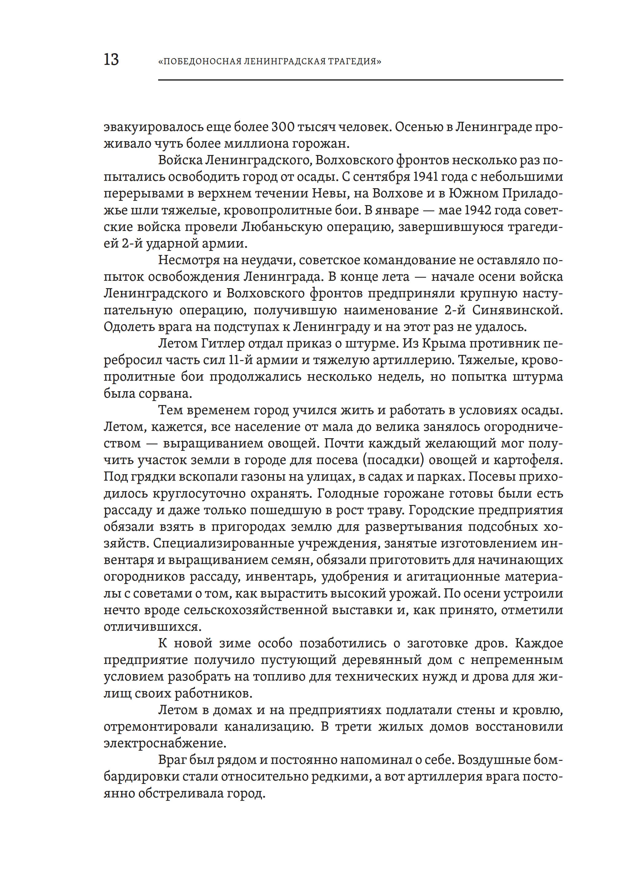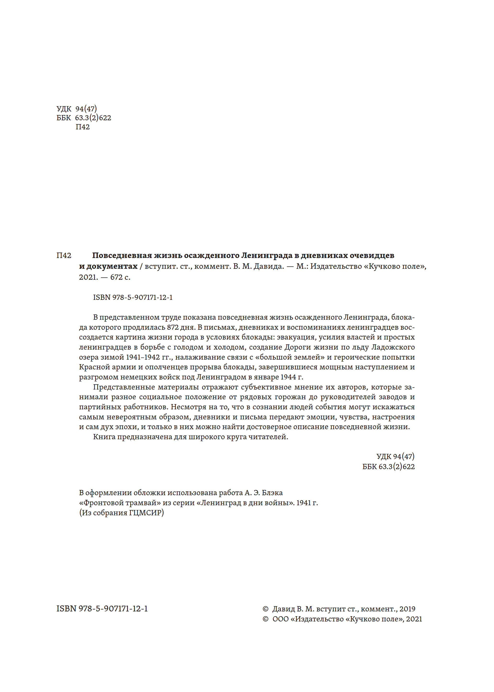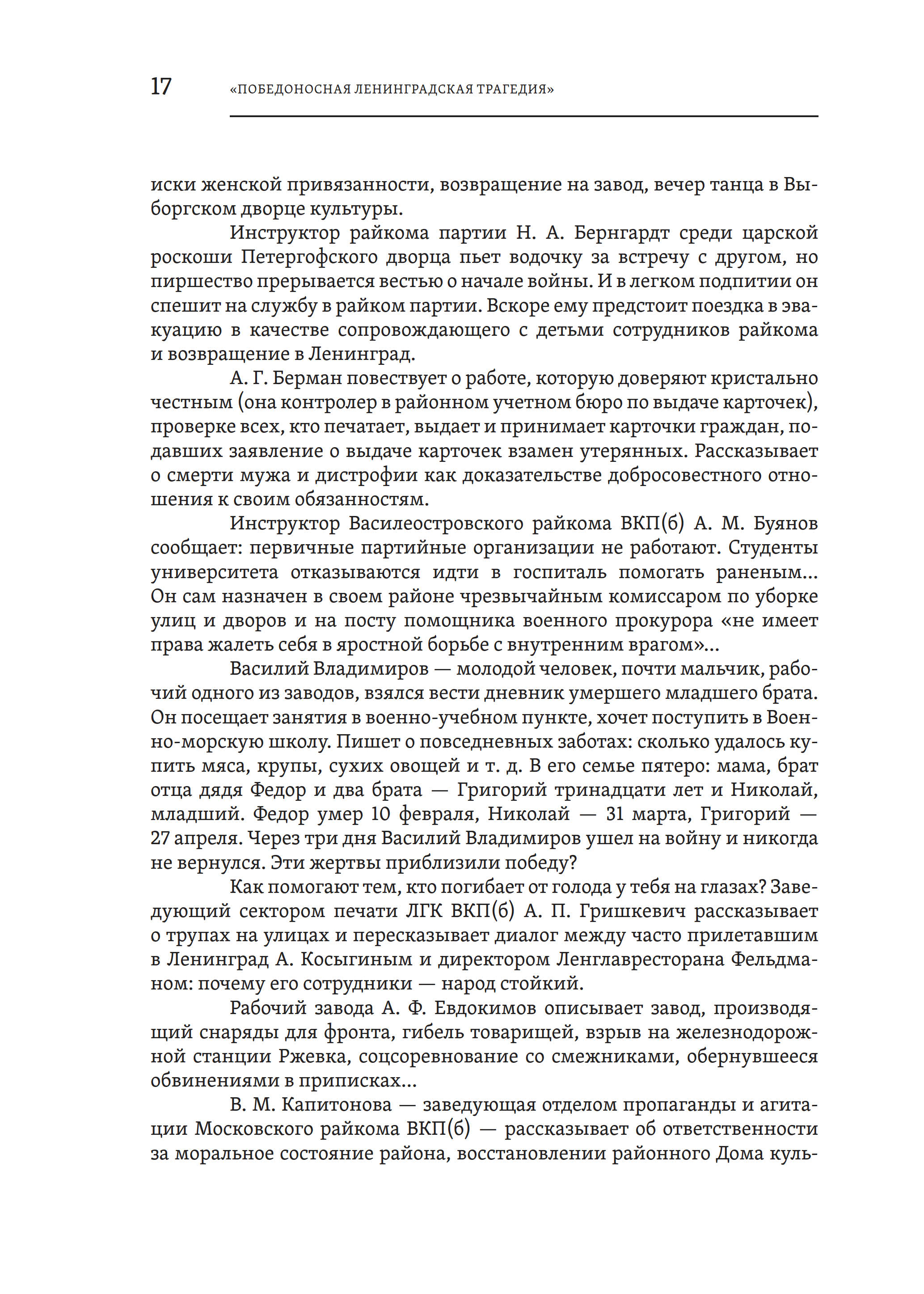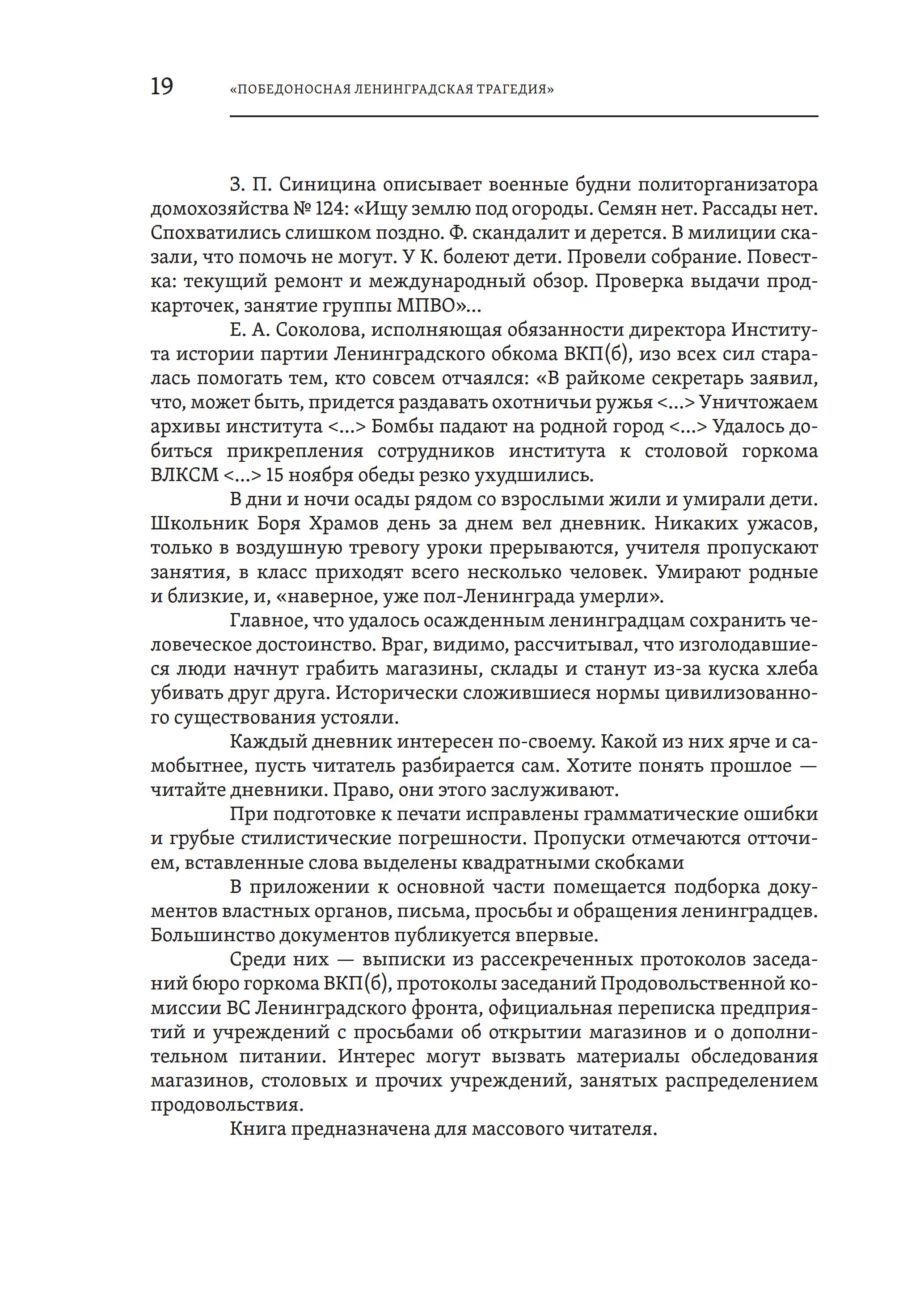 В представленном труде показана повседневная жизнь осажденного Ленинграда, блокада которого продлилась 872 дня. В письмах, дневниках и воспоминаниях ленинградцев воссоздается картина жизни города в условиях блокады: эвакуация, усилия властей и простых ленинградцев в борьбе с голодом и холодом, создание Дороги жизни по льду Ладожского