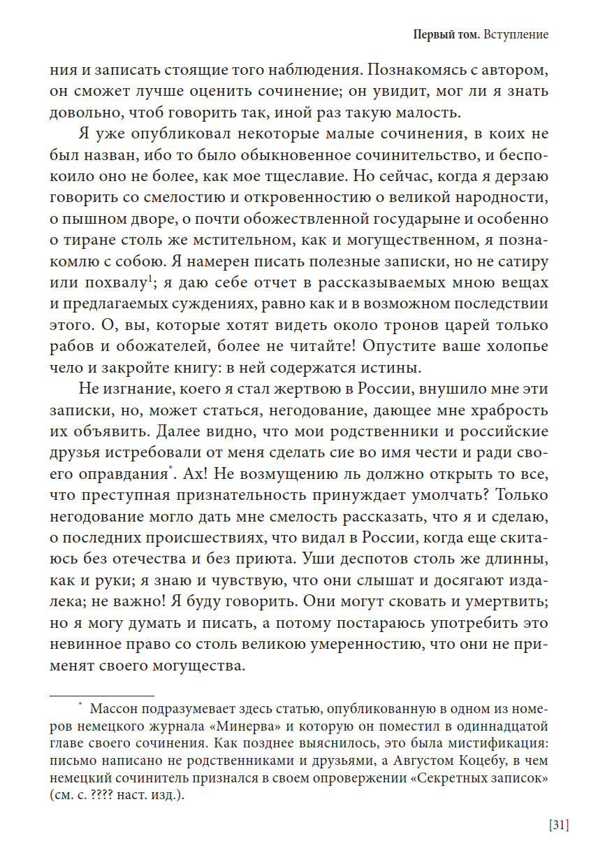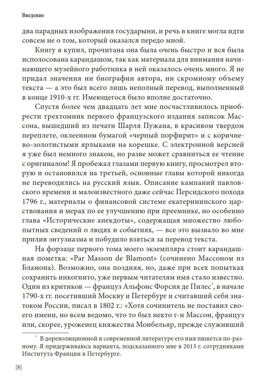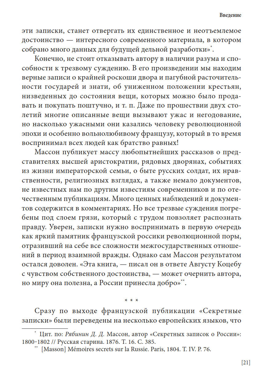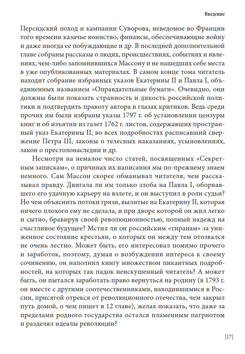 Перед вами первое полное издание всех трех томов уникальных записок французского поэта и мемуариста Шарля Массона, находившегося в России в царствование Екатерины II и Павла I. Новый перевод с комментариями выполнен А. Н. Спащанским, специалистом по истории России XVIII века. В записках представлены яркие портреты различных деятелей эпохи, внешнеполитические и события внутренней жизни России, зарисовки о нравах и привычках россиян.