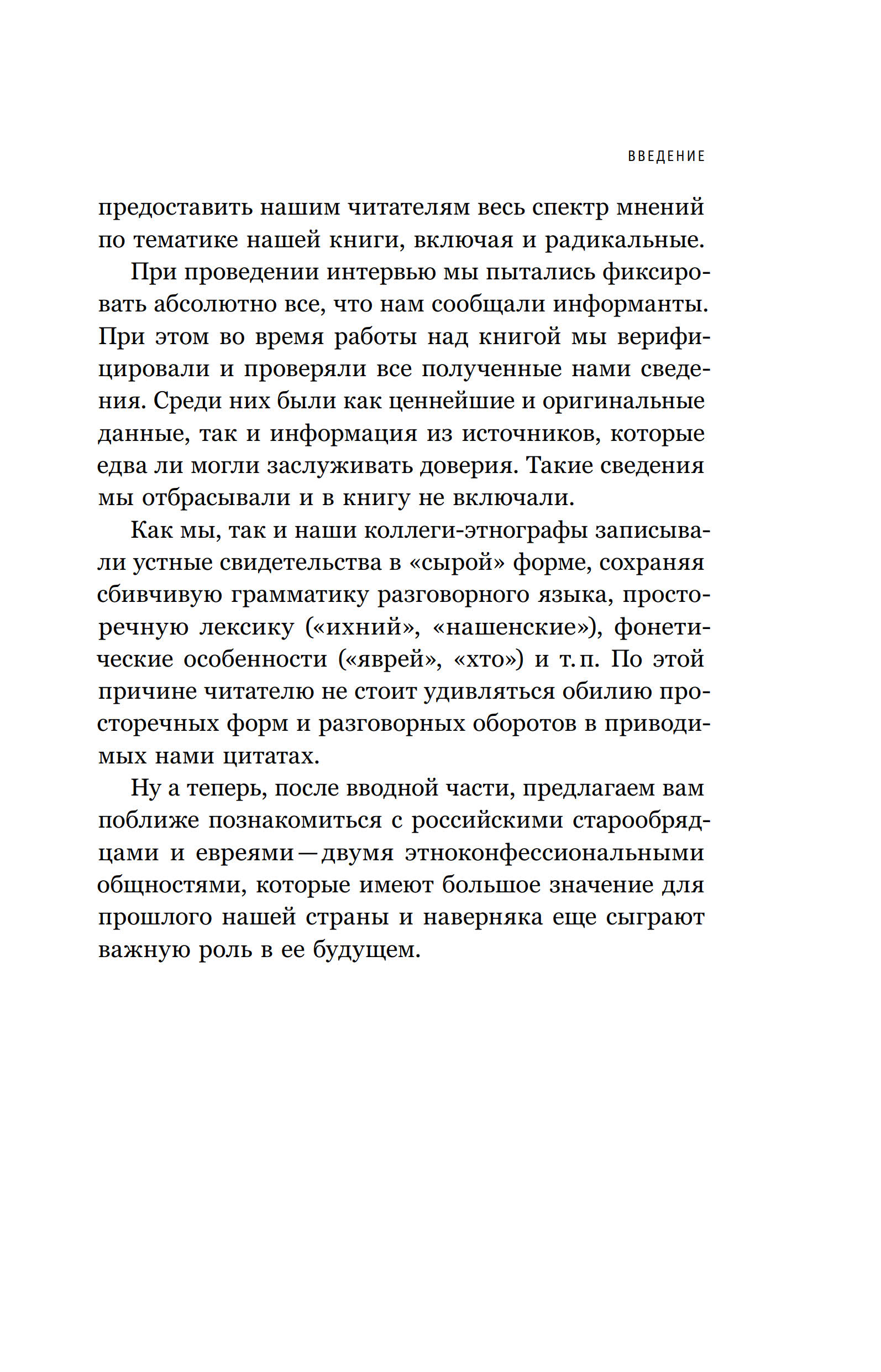 Авторы книги находят ответы на эти вопросы, изучая опубликованные и архивные документы, а также проводя многочисленные интервью с представителями еврейских и старообрядческих общин на территории бывшей Российской империи и СССР (Россия, Украина, Беларусь, Молдова, Приднестровье, Латвия).