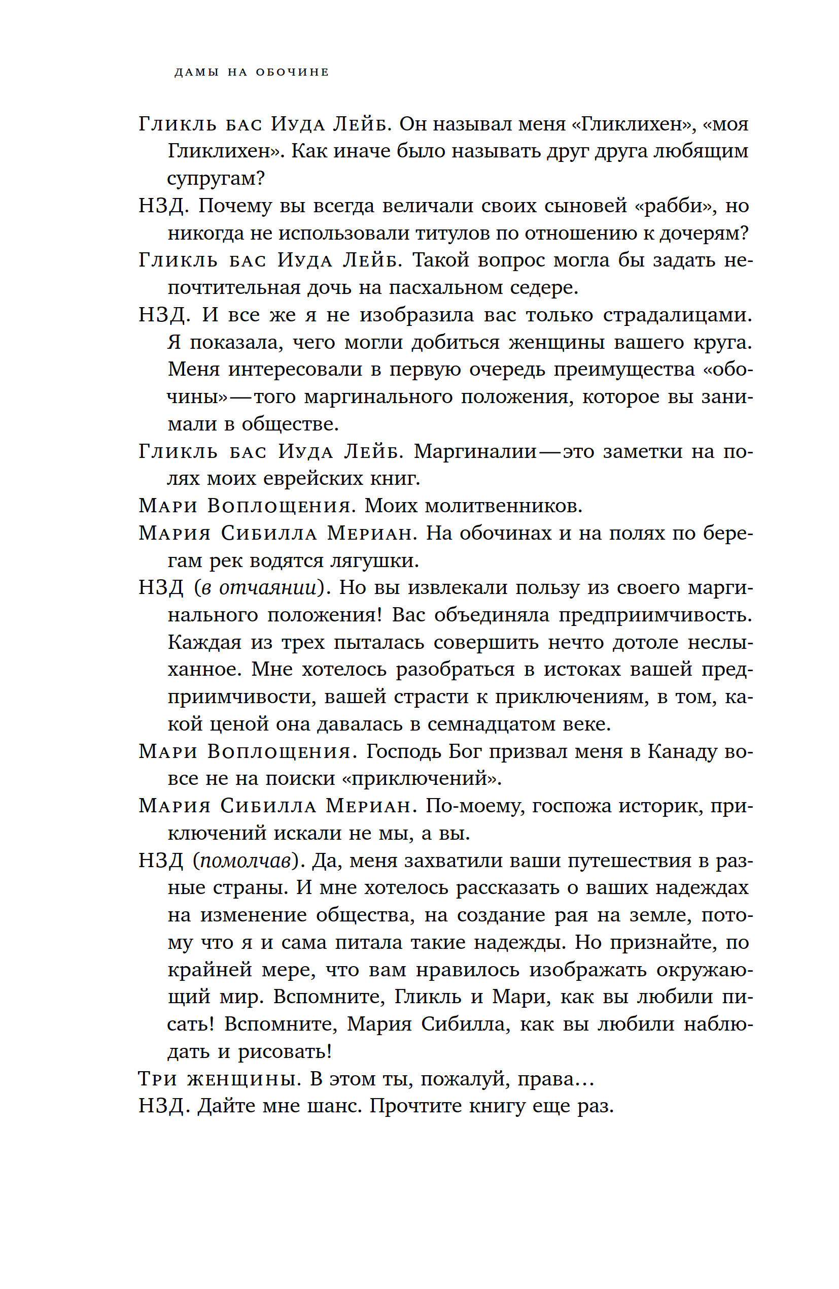 Книга «Дамы на обочине» (1995) выводит на авансцену трех европейских женщин XVII века, очень разных по жизненному и интеллектуальному опыту, но схожих в своей незаурядности, решительности и независимости. Ни иудейка Гликль бас Иуда Лейб, ни католичка Мари Гюйар дель Энкарнасьон, ни протестантка Мария Сибилла Мериан не были королевскими или знатными особами. Скорее, они жили «на обочине» европейского XVII века, однако их дневники, письма и путевые заметки, утверждает Дэвис, дают нам куда более верное представление о раннем модерном времени, нежели официальная придворная история.