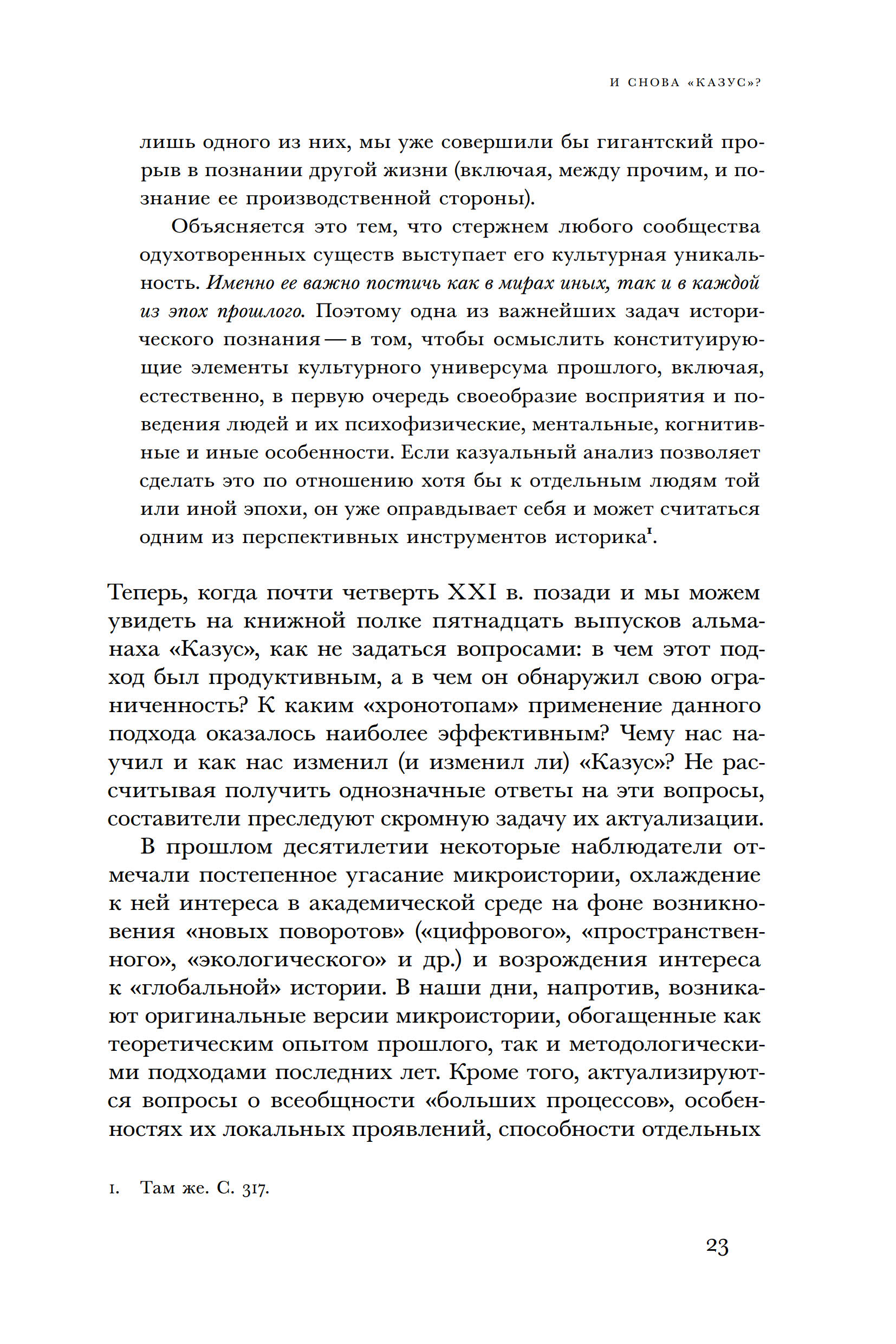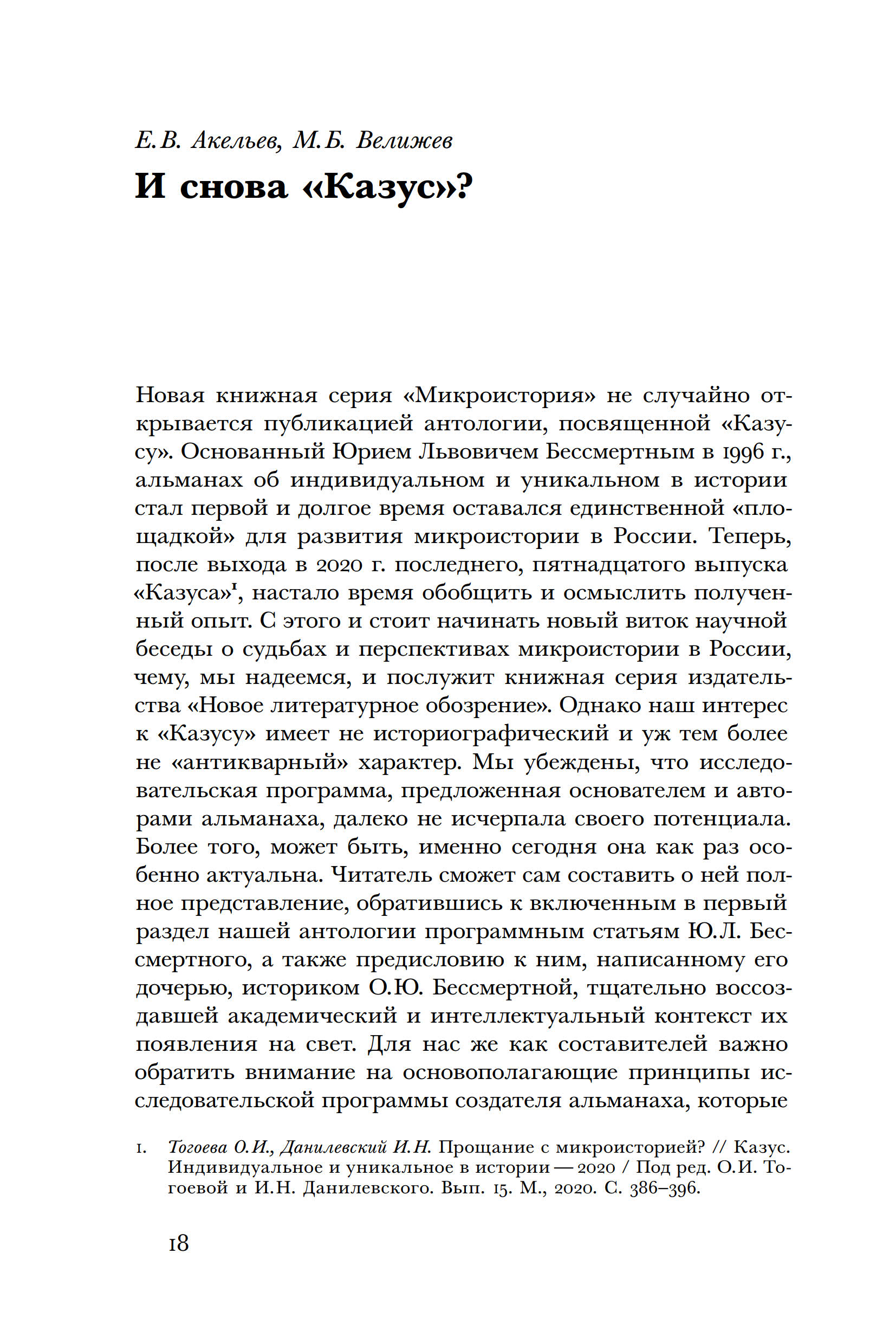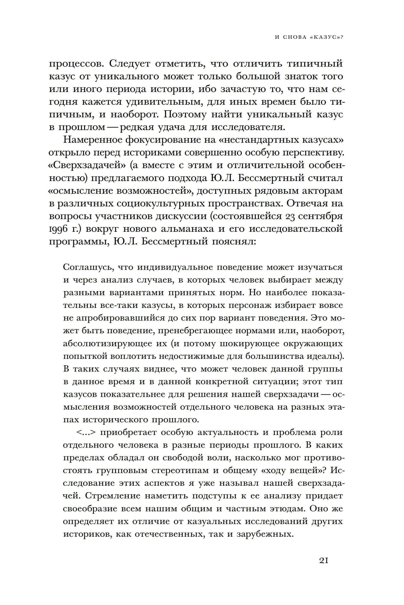 Альманах «Казус», основанный в 1996 году блистательным историком-медиевистом Юрием Львовичем Бессмертным и вызвавший огромный интерес в научном сообществе, был первой и долгое время оставался единственной площадкой для развития микроистории в России. Первая часть настоящей антологии знакомит читателя с текстами по теории, давшими импульс «казусному» направлению в современной отечественной историографии, а вторая часть — с напечатанными в первых пяти номерах альманаха исследованиями. Эти работы помогают проследить, как применяются и развиваются методологические принципы, сформулированные Бессмертным и другими авторами «Казуса».
