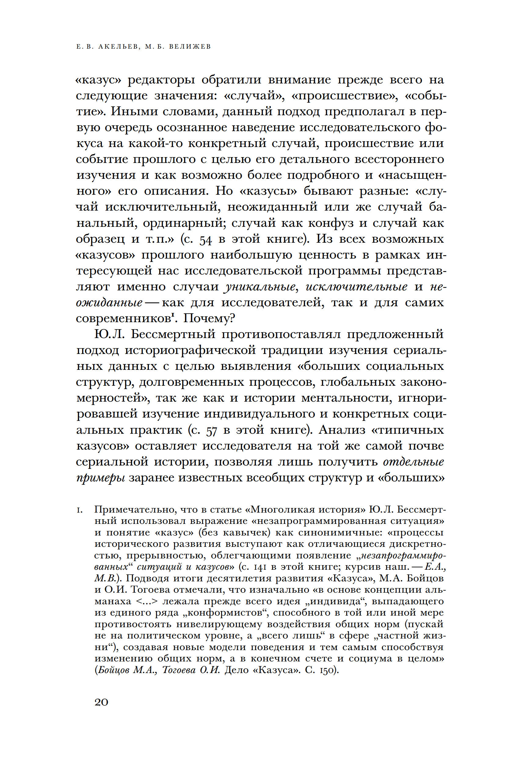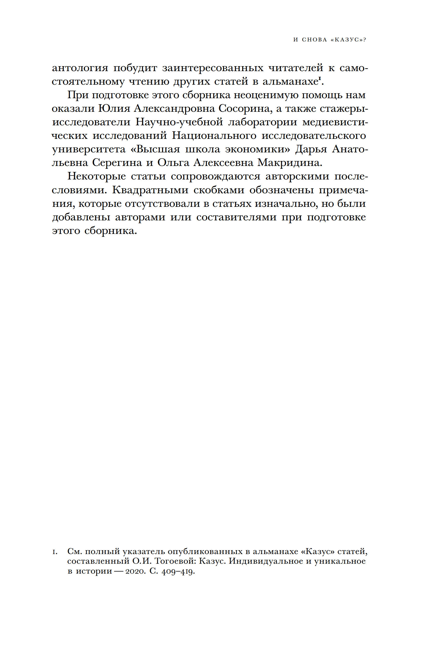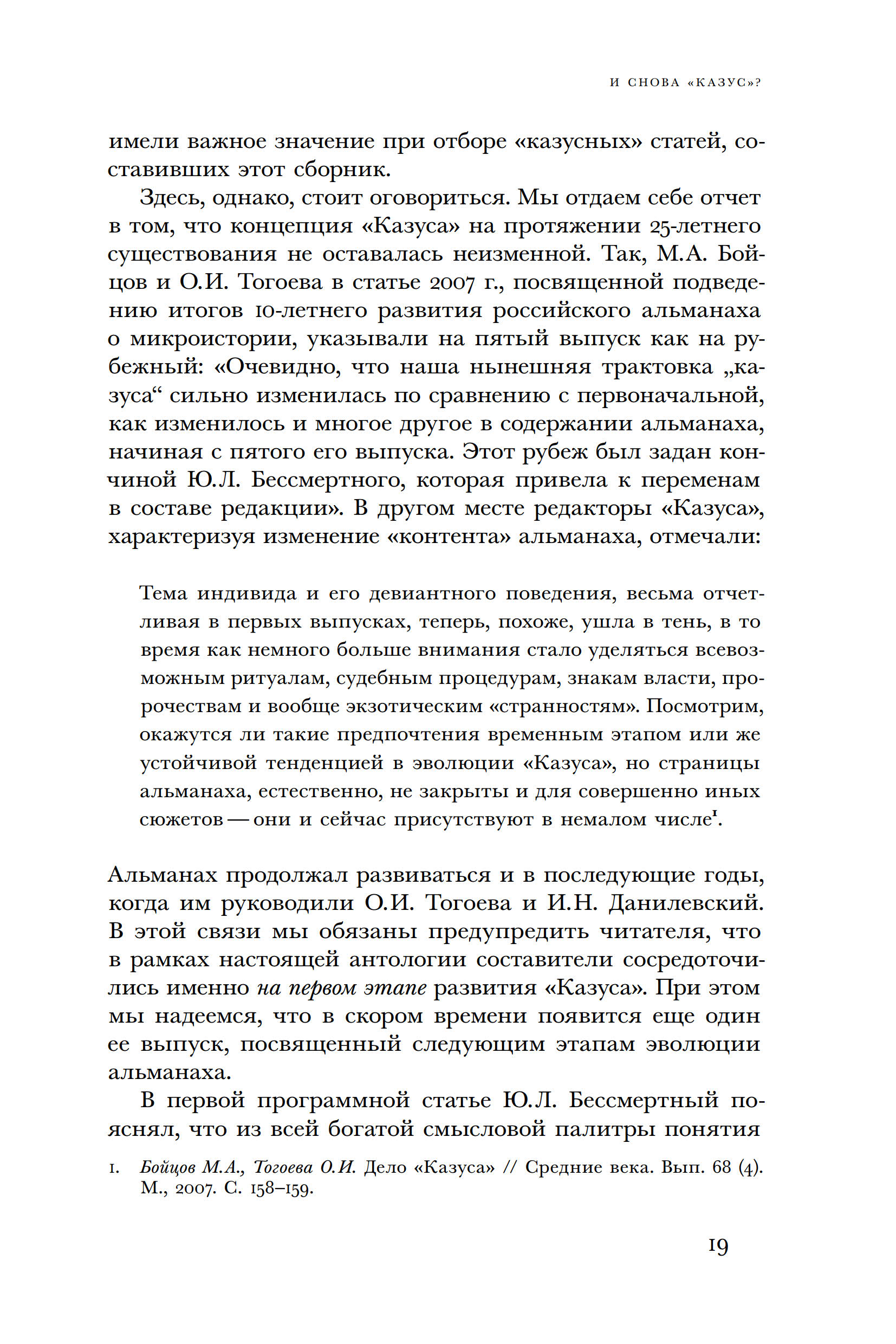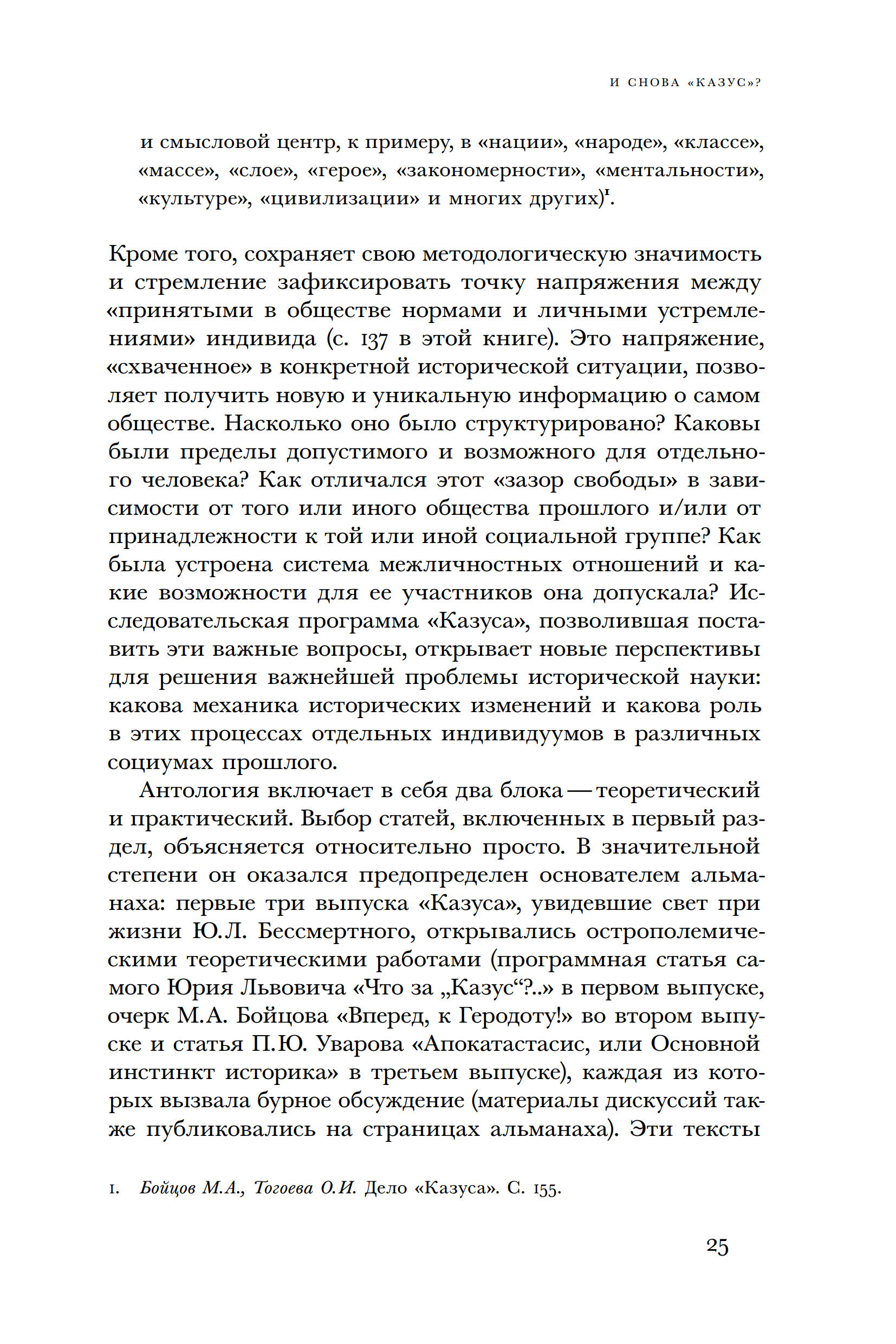 Альманах «Казус», основанный в 1996 году блистательным историком-медиевистом Юрием Львовичем Бессмертным и вызвавший огромный интерес в научном сообществе, был первой и долгое время оставался единственной площадкой для развития микроистории в России. Первая часть настоящей антологии знакомит читателя с текстами по теории, давшими импульс «казусному» направлению в современной отечественной историографии, а вторая часть — с напечатанными в первых пяти номерах альманаха исследованиями. Эти работы помогают проследить, как применяются и развиваются методологические принципы, сформулированные Бессмертным и другими авторами «Казуса».