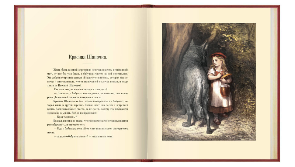 Книга в мельчайших деталях повторяет одно из лучших изданий сказок Шарля Перро, выпущенное в 1867 году в Санкт-Петербурге и Москве книгопродавцем и типографом М. О. Вольфом.